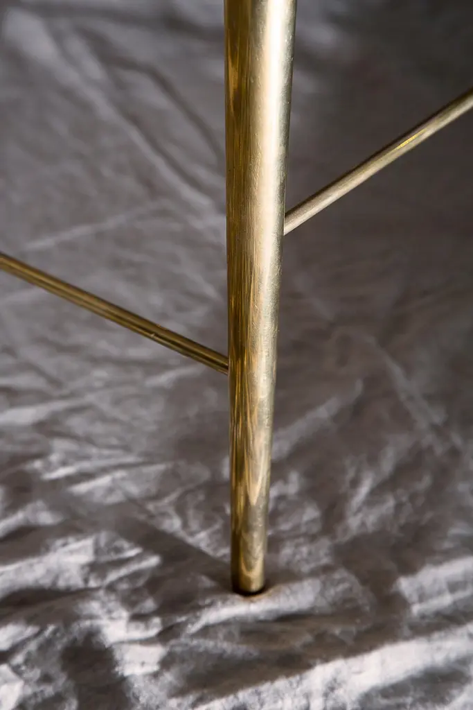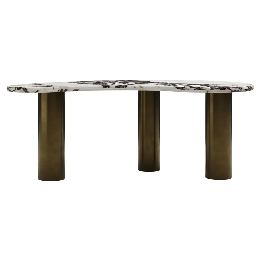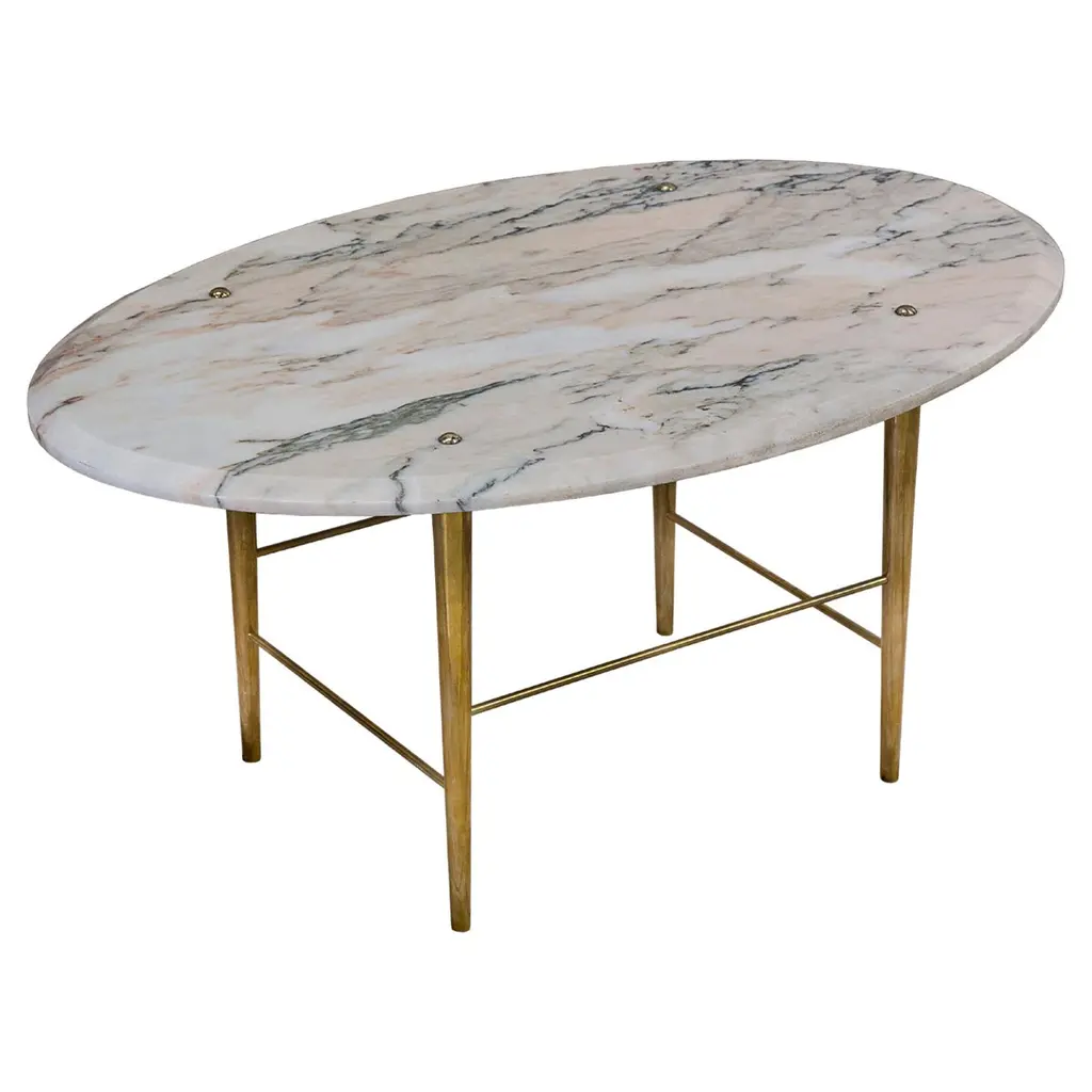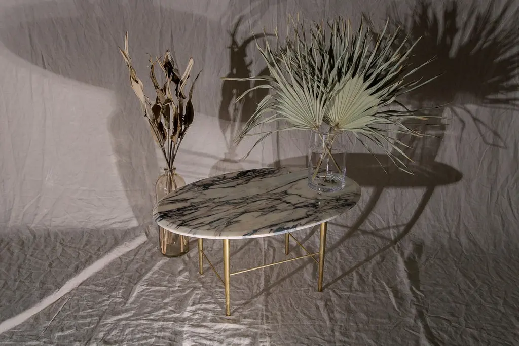 A coffee table in Portuguese marble and polished brass. handcrafted to order in Northern England.Measures: 800 mm (L) x 500 mm (W) x 400 mm (H)Bespoke sizes and finishes available.