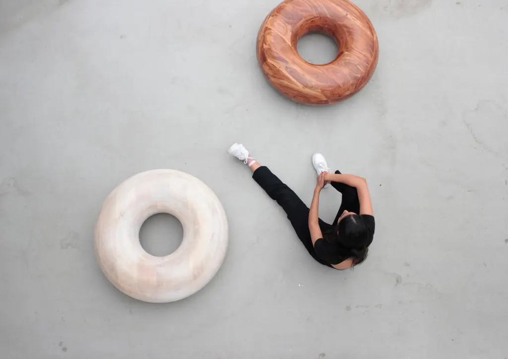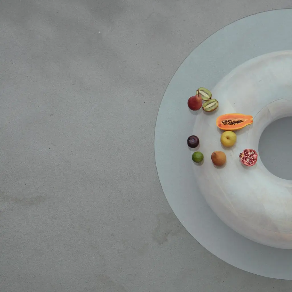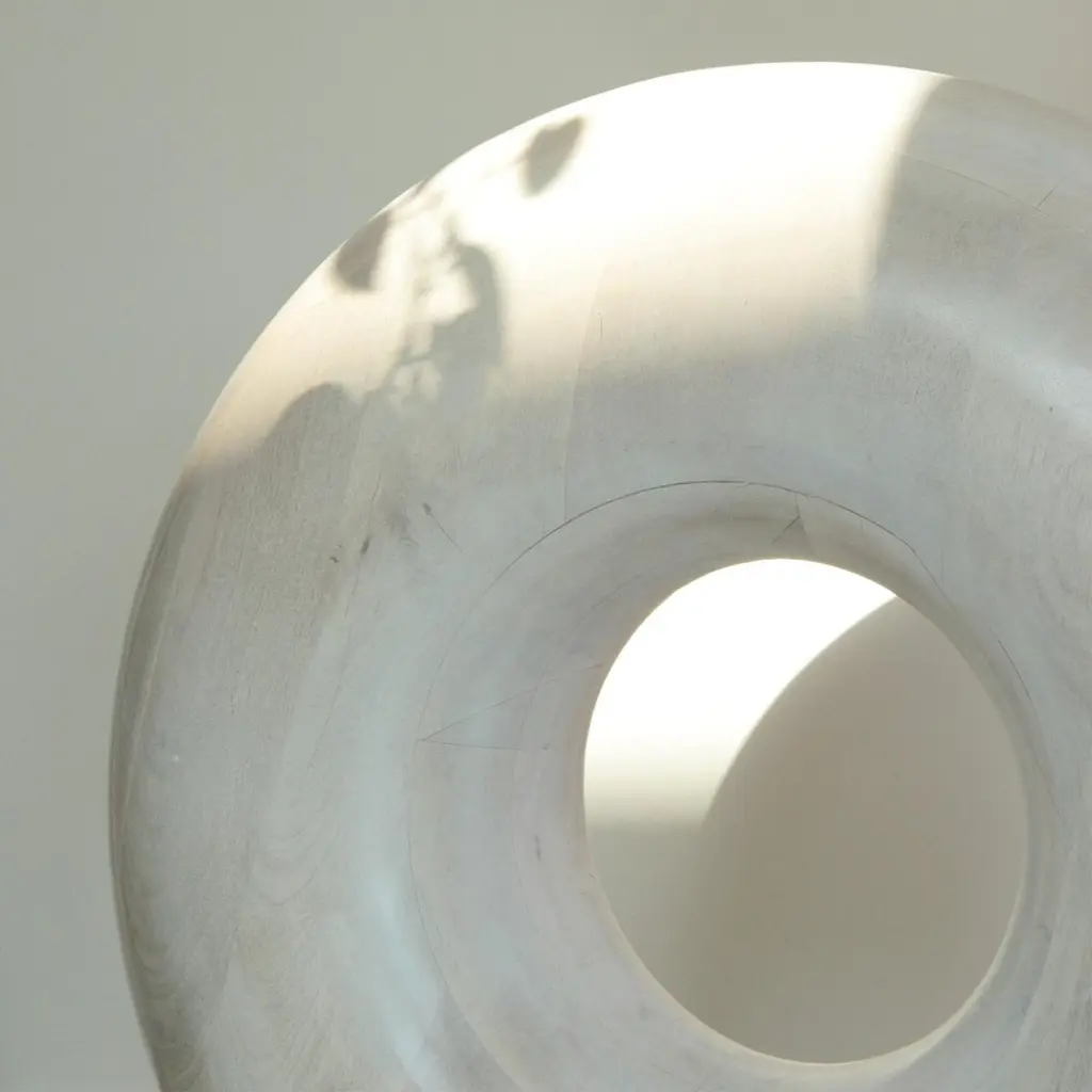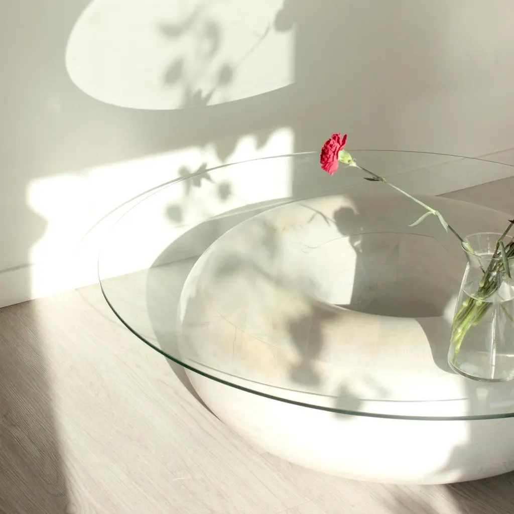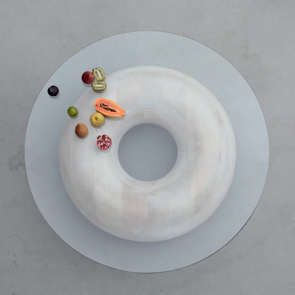 Sugar donut coffee table by Soft-geometryMaterials: Solid mango wood coffee table, sugar glaze, glass topDimensions: 48 x 48 x 12” HThe donut table was born from the Challenge of using vast quantities of factory waste end boards - cut offs from either ends of solid wood long boards that are discarded to eliminate cracks, checks or warping. To create the donut the boards are arranged in a carefully engineered pattern and then carved by a CNC into the donut form. The arrangement of the boards throws up a unique flux of grain patterns that make each donut table distinct, and delicious to look at. The donut table is part of the collection, Dessert Menu by soft-geometry, featuring solid wood pieces that each explore different notions of sweet in a succinctly curated menu meant to inspire (sugar) highs!Soft-geometry is an Indian design studio creating collectible furniture and home objects around a central theme of softness. Inspired by the rich, diverse object culture and Craft-traditions of India, their objects are predominantly handmade, bridging traditional and modern ways of making and seeing. Based in Kochi, India. "Softness is a degree, almost anything can be plotted along a soft-hard axis. There are soft materials - soft velvet, fur, felt, hair, wool and any others that are soft to touch. There are visual associations - pastel colors, billowy clouds, things without edges and the soft light of dawn or dusk. There are soft sounds - whispers, melodies, the rustle of leaves; and soft scents - the smell of rain, wet ground or faint perfume. More interestingly still, softness can be abstract - it is malleability, a willingness to learn or change, fluidity, humility, empathy, slowness, childlike innocence or imperfection.".