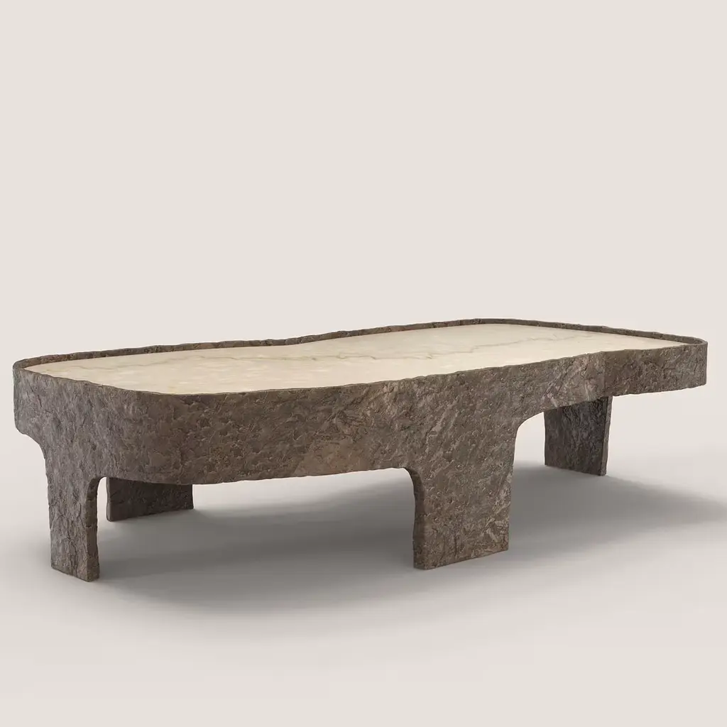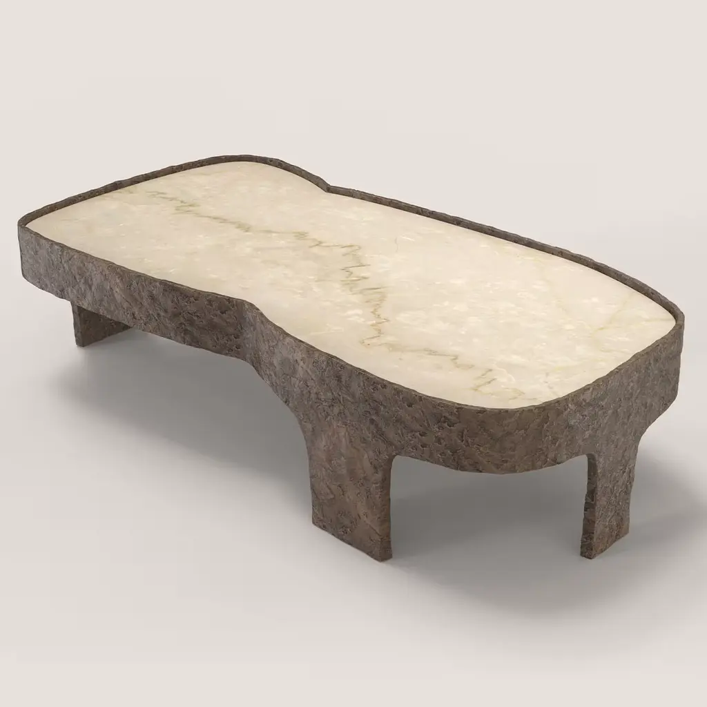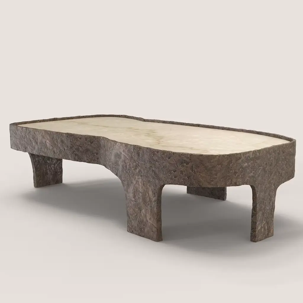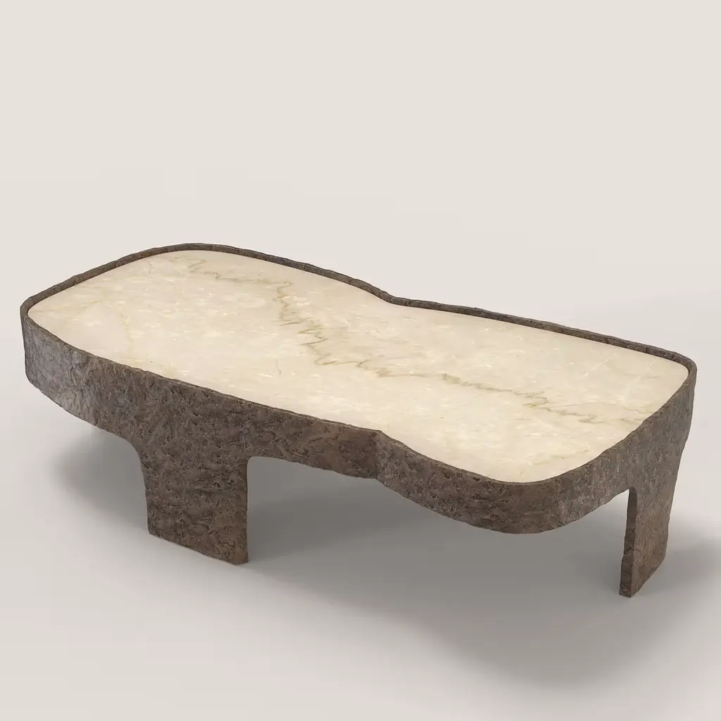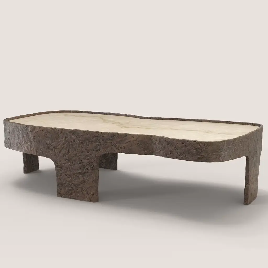 Sumatra V3 is a 21st Century coffee table made by Italian artisans in cast bronze with a light brown patina with an extraordinary Botticino Classico marble plane. It is part of the collectible design language Sumatra that has been developed by Edizione Limitata's art research team in Milan. The object ground its elegance in the contrast between the smoothness of the stone and the material texture of the aluminum body. Limited edition of 15 + 3 AP.