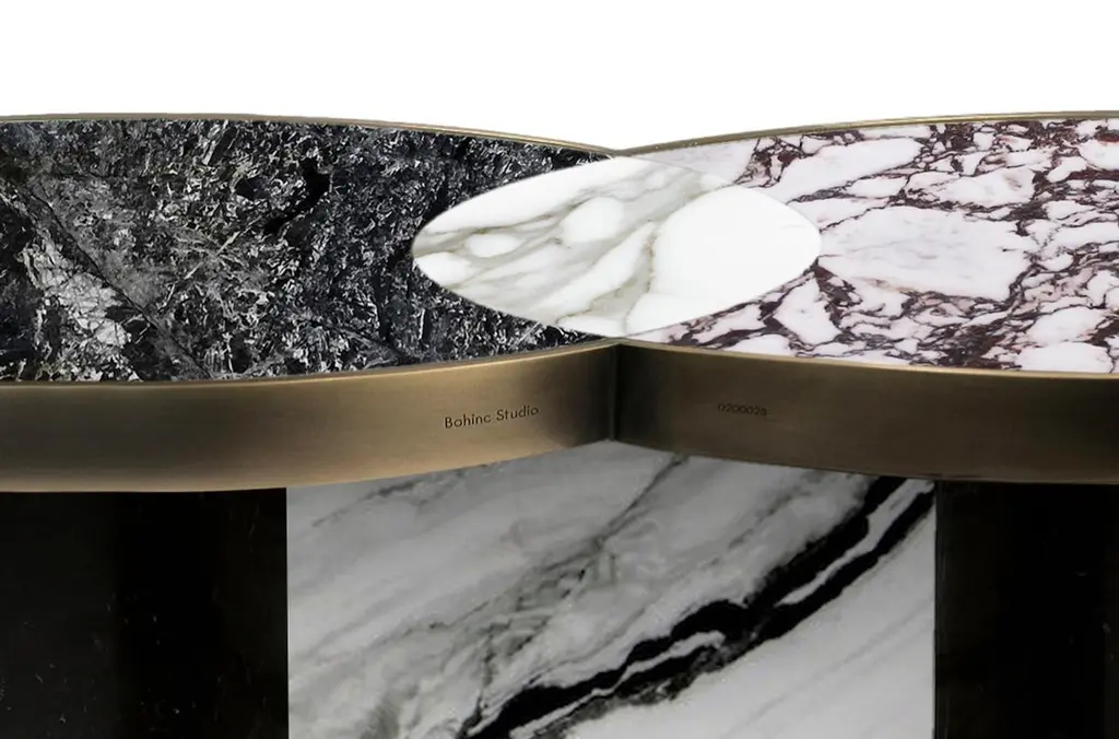 The Lunar Collection introduces the Half Moon dining table, the Sun and Moon coffee table and the Full Moon side table. Discs echoing planetary forms are bisected or overlaid to create surface patterns and structural elements, forming dynamically-poised bases and tops set within brass frames.The juxtapositioning of charismatic marbles including Calacatta Oro, New Antico, Pink Onyx, Calacatta Viola and Panda White picks up another of Bohinc’s central inspirations for this collection: the historic buildings of Venice, where complex marble inlay has been a decorative art for centuries. Ancient stone marquetry work such as Pietra Dura and Opus Sectile is closely related to the jeweller’s art of marrying contrasting stones into a perfect whole, underlining Lara’s own design vocabulary.The table has two slightly visible solder joints on the metal rim (where the two circles meet). Please note that these is not an imperfections, but they are integral part of the piece. The frame is made of brass galvanised steel metalwork. The exact colour of metal may vary slightly from the photos.Please note that no two marbles are alike and there will be variations in the pattern as well as in the colour of the pieces.Each piece of furniture is individually numbered and comes with a signed Certificate of authenticity to prove that is Bohinc Studio original.Materials: brass galvanised steel metalwork and marbles: Calacatta Oro, New Antico, Pink Onyx, Calacatta Viola and Panda WhiteDimensions: height 44cm, length 120cm, width 70cmWeight: approximately 80kgHandmade in Italy.