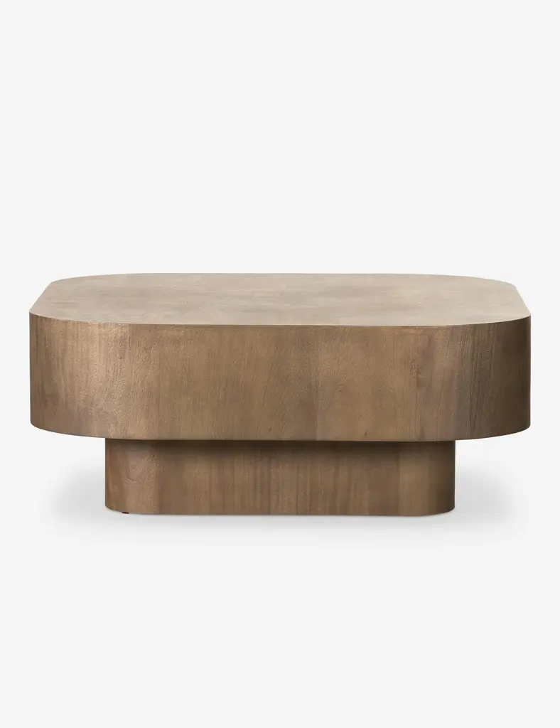 Freshen up the look of your living room with the patchwork tabletop design, rounded corners, and lighter walnut finish of this wood coffee table. Crafted from bleached ash burl, it features mahogany veneer sides and is finished with a sleek inset base. Pair this coffee table with desert hues or tailored neutrals.