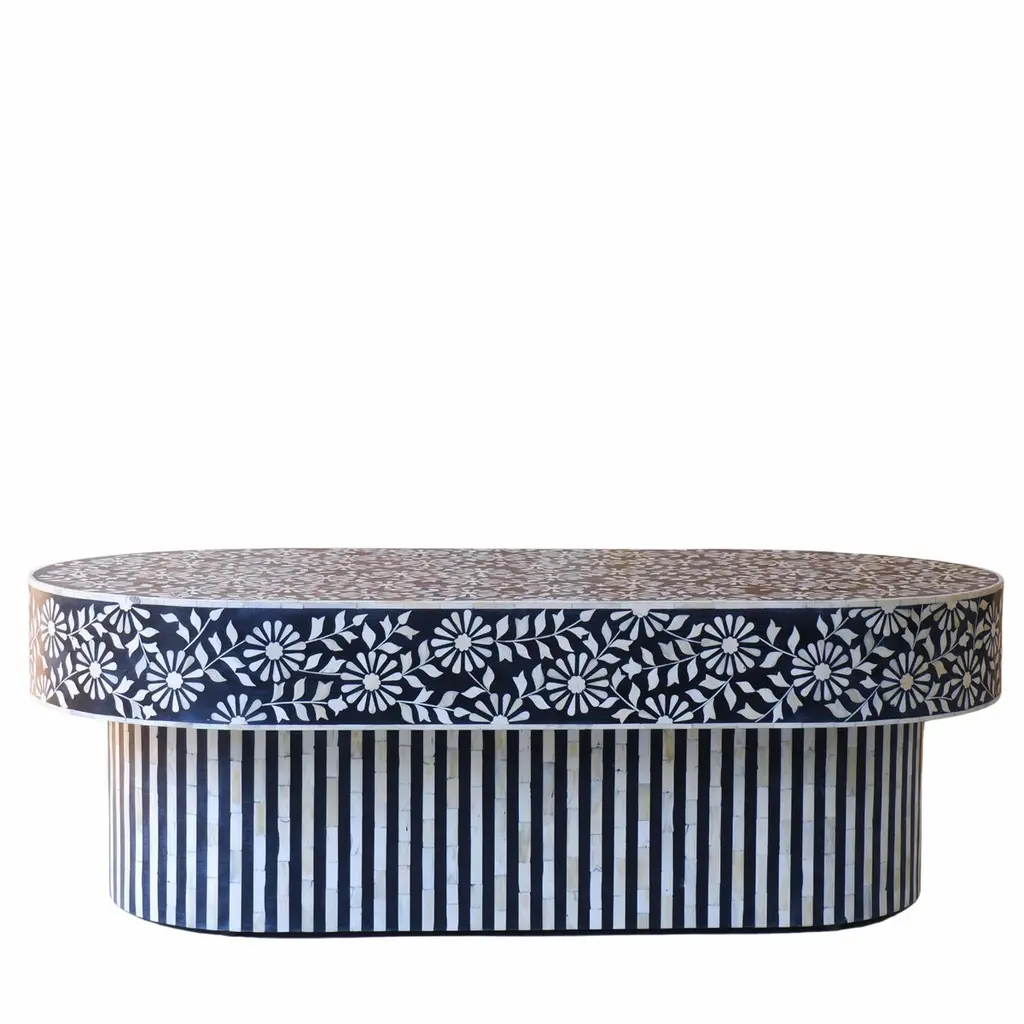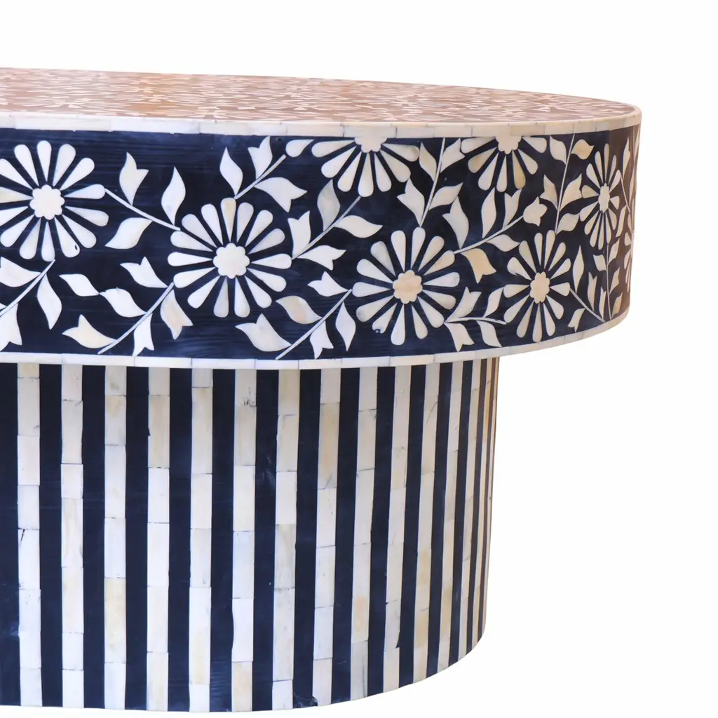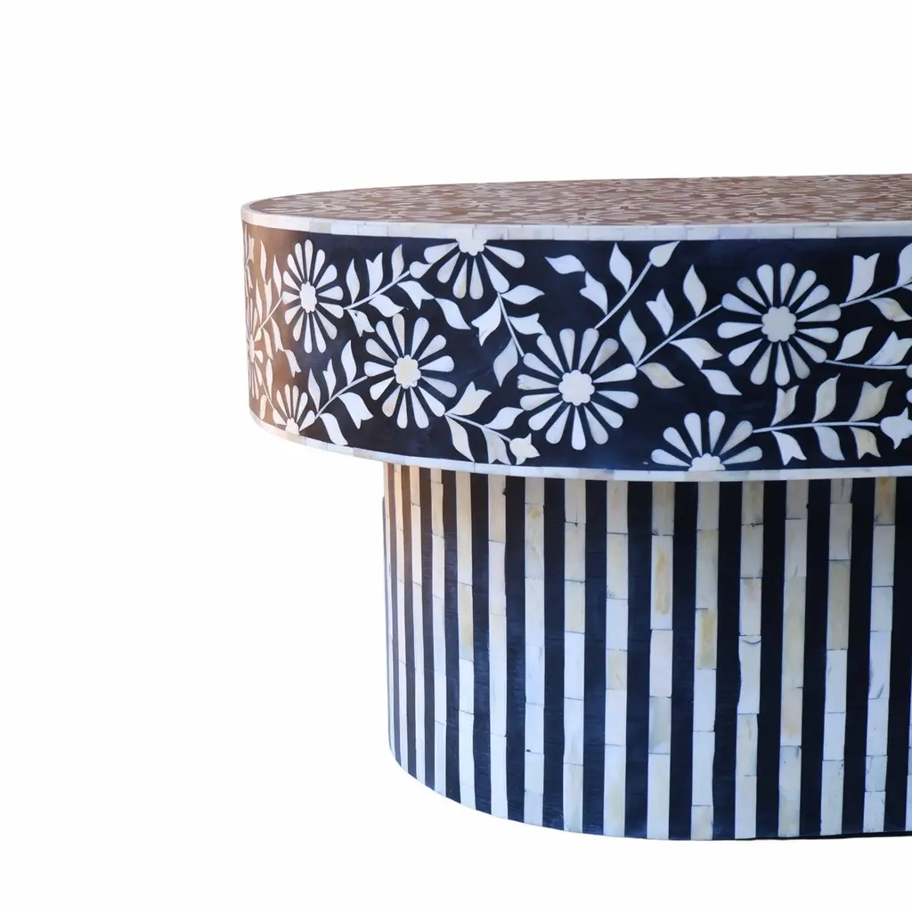The juxtaposition of the intricate flower motifs against the clean lines of the base creates a visually captivating design. The harmonious blend of elements in the coffee table makes it not just a piece of furniture, but a work of art. The intricate flower motifs draw the eye in, while the clean lines of the base provide balance and contrast. The black and white colour scheme adds a timeless elegance to the table, it exudes sophistication and versatility, allowing the table to seamlessly integrate into a variety of interior styles. The handcrafted bone pieces infuse it with a sense of artisanal craftsmanship and heritage. It's the perfect blend of traditional and contemporary styles, sure to be a focal point in any room it graces.Details: 1. Materials used: Wood and Bone.2. Wipe with a damp cloth. Avoid chemical-based cleaning solutions.3. Avoid exposure to direct sunlight.4. Made in India.5. As the piece is handmade please expect slight colour variations.6. The texture and finish of the furniture are natural.7. Manufacturing time: 2-3 weeks. Shipping time: 1-2 weeks.8. Ships from India.