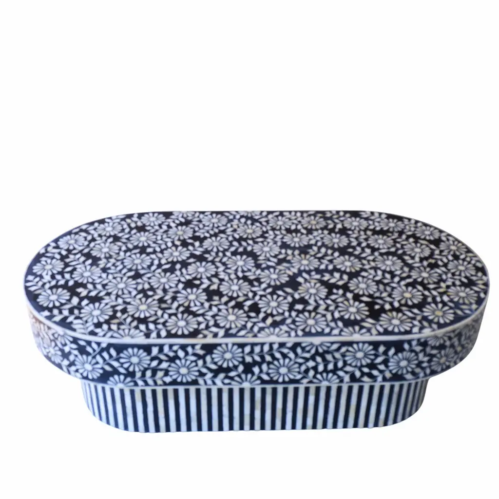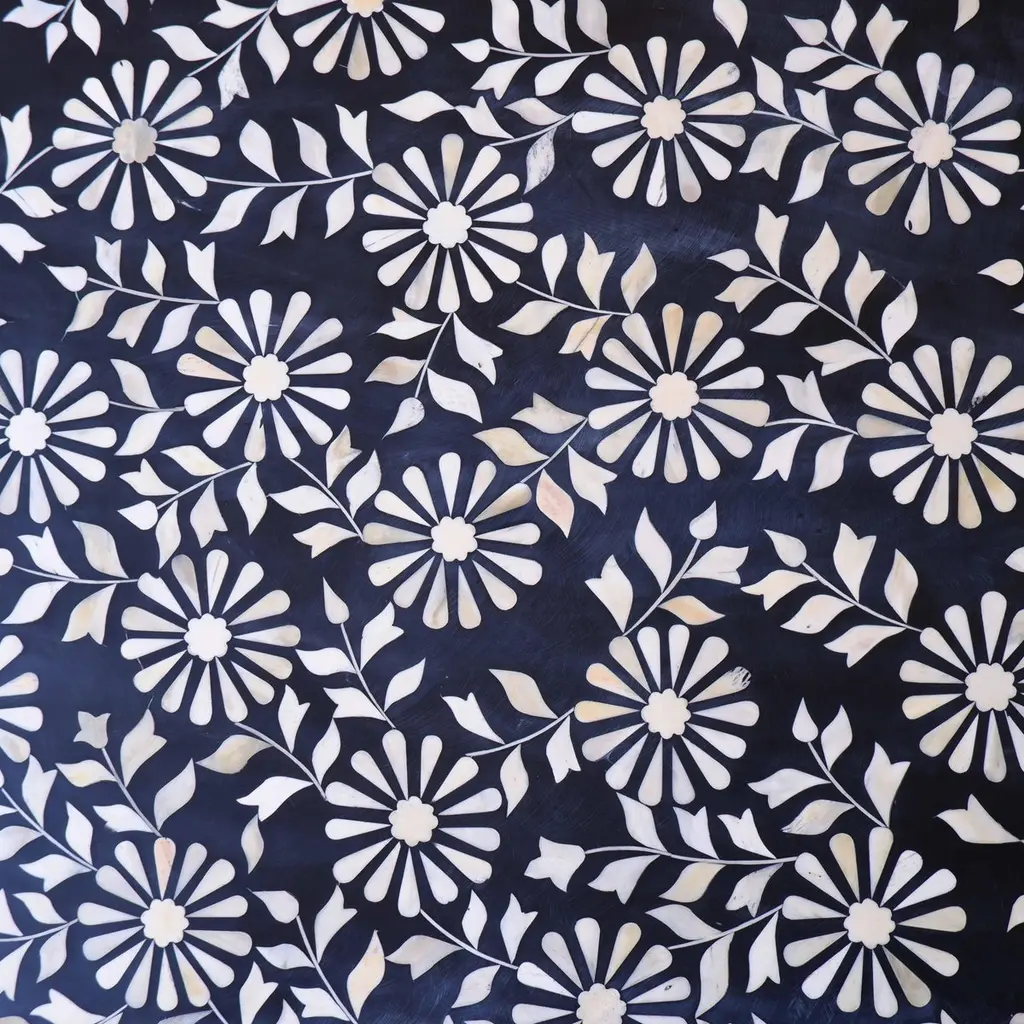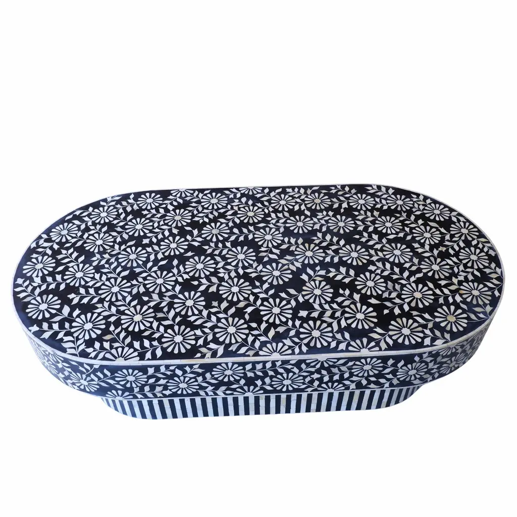 The juxtaposition of the intricate flower motifs against the clean lines of the base creates a visually captivating design. The harmonious blend of elements in the coffee table makes it not just a piece of furniture, but a work of art. The intricate flower motifs draw the eye in, while the clean lines of the base provide balance and contrast. The black and white colour scheme adds a timeless elegance to the table, it exudes sophistication and versatility, allowing the table to seamlessly integrate into a variety of interior styles. The handcrafted bone pieces infuse it with a sense of artisanal craftsmanship and heritage. It's the perfect blend of traditional and contemporary styles, sure to be a focal point in any room it graces.Details: 1. Materials used: Wood and Bone.2. Wipe with a damp cloth. Avoid chemical-based cleaning solutions.3. Avoid exposure to direct sunlight.4. Made in India.5. As the piece is handmade please expect slight colour variations.6. The texture and finish of the furniture are natural.7. Manufacturing time: 2-3 weeks. Shipping time: 1-2 weeks.8. Ships from India.