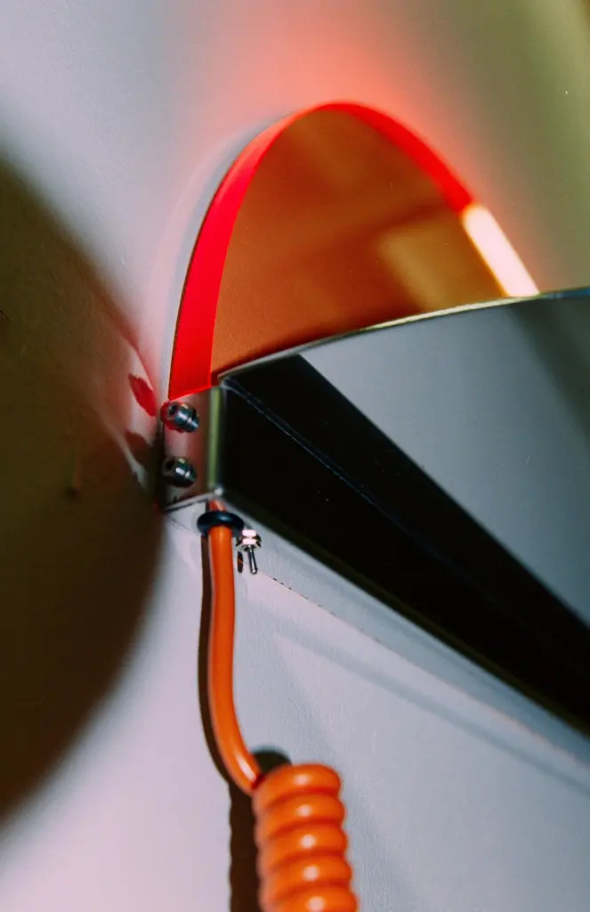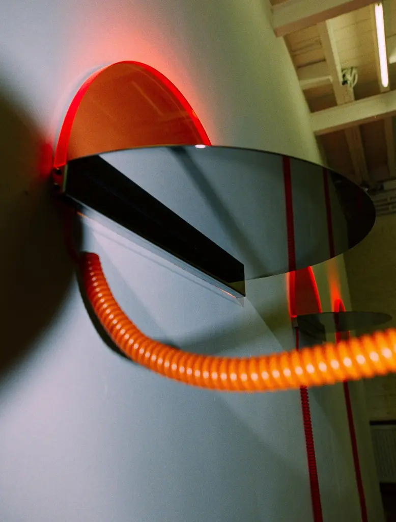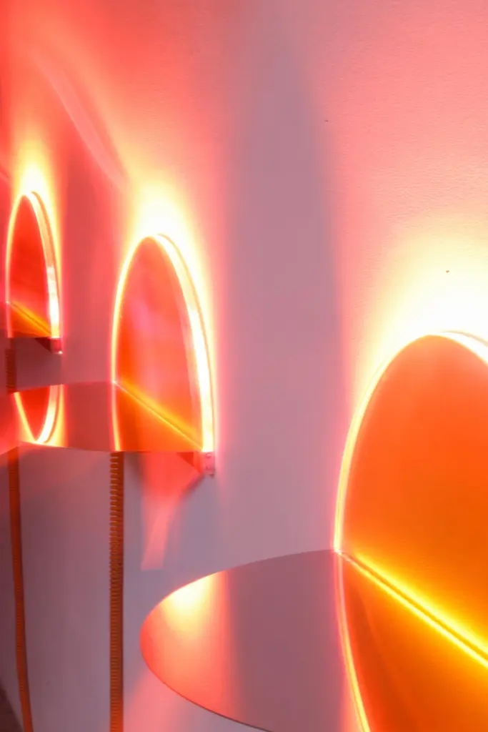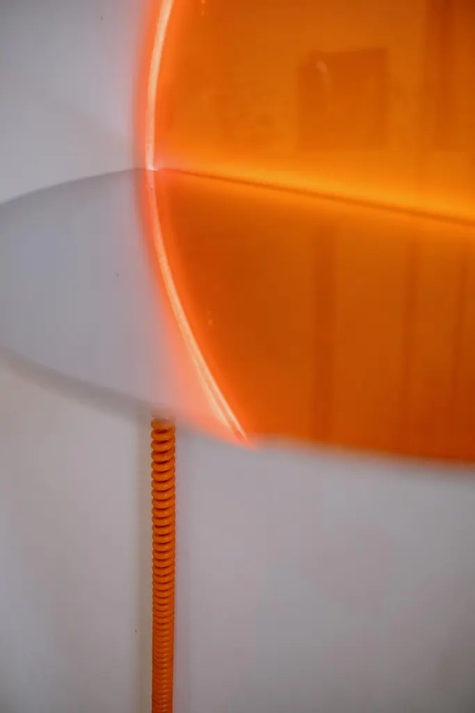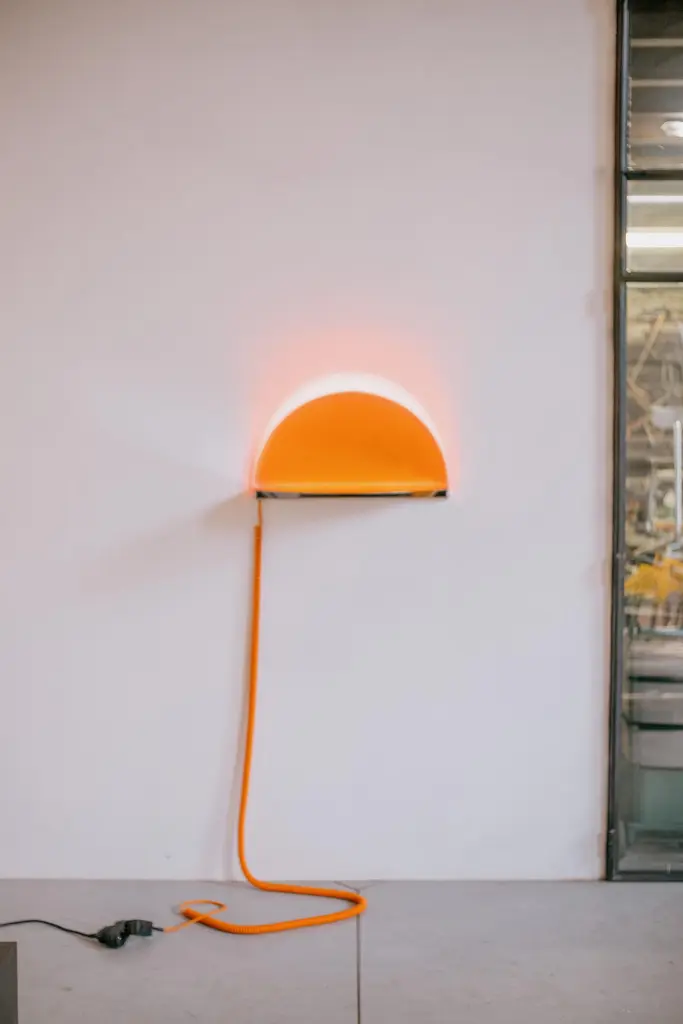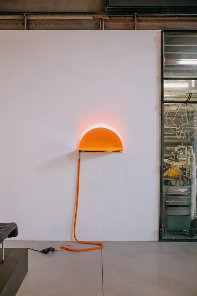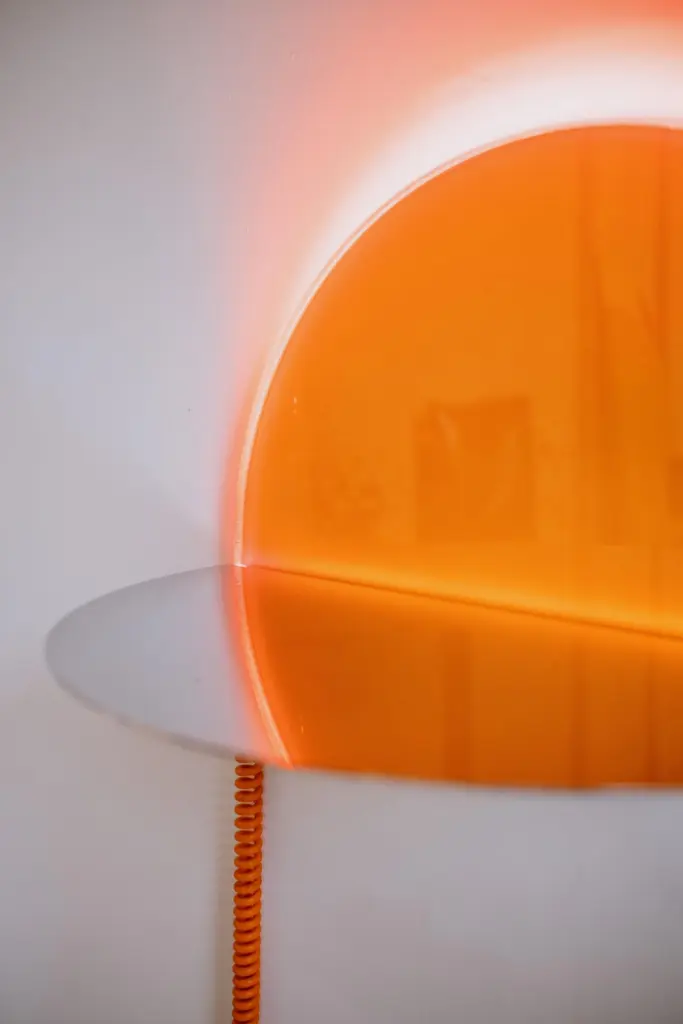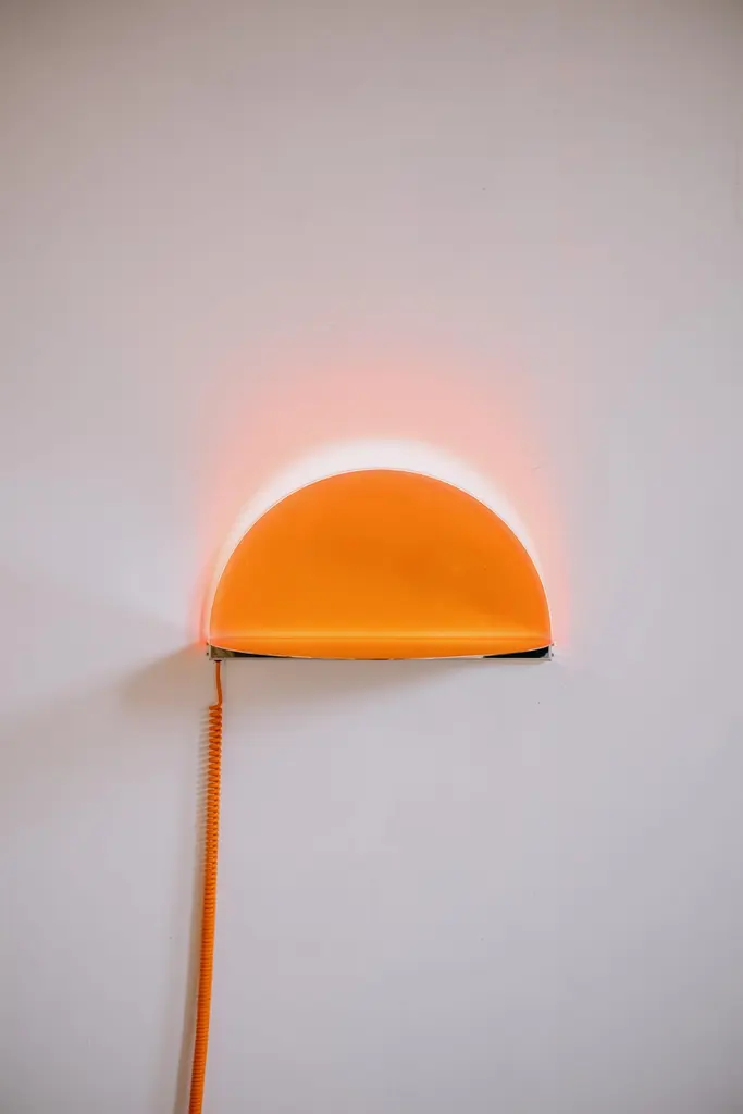Sunset Wall Light by Amber DewaeleDimensions: D 62 x W 32 x H 34 cm.Materials: Acrylic and polished stainless steel.Sunset Wall LightThe sunset wall light is inspired by that one beautiful summer evening when the sun sets in the sea. It is a moment to which we can all associate a certain memory. In this way the lamp manages to arouse specific feelings and emotions. All our lamps can be wired according to each country. If sold to the USA it will be wired for the USA for instance. Please contact us.Atmosphere CollectionA collection based on the beauty of the sky.For me the true essence of beauty is found when simply looking up to the sky. It’s the reaction between the light and the atmosphere that creates beautiful optical phenomena that for a brief moment makes you appreciate the world we are living in and forget about all the rest. It’s these wonders of the sky that were the inspiration for the atmosphere collection: from corona to coffee table, from light pillar to floor lamp and from sunset to wall unit. Using various materials and respective processing techniques in combination with artificial light, this collection brings the wonders of the sky into the interior.About the designer.Amber Dewaele is an Antwerp-based furniture and product designer. Born in 1997, her portrait reflects a young but driven woman ready to rethink the visual object world through her own playfull lens.Amber recently graduated from the Thomas More Hogeschool, where she was taught the arts and crafts of furniture design. Combined with her preceding studies in industrial product design, she has a perfectly balanced portfolio between functionality and creativity. When taking a step back to better understand her, one rapidly realizes that she seeks the simplicity in the boundless complexity, both in form and function.Her ideas germinate from a certain philosophy, material or production process. From rough idea generation up to decisive implementation, functionality is the common thread throughout the process. This common thread defines the artistic approach to a functional yet poetic end product. Her creations have been known to evoke specific emotions, trigger feelings and make people wonder.Although very mature, Amber never abandoned her inner child, to whom she still listens when in search for abundant inspiration. It provides her with a rich source of inspiration. Playfulness is therefore often reflected in her designs.