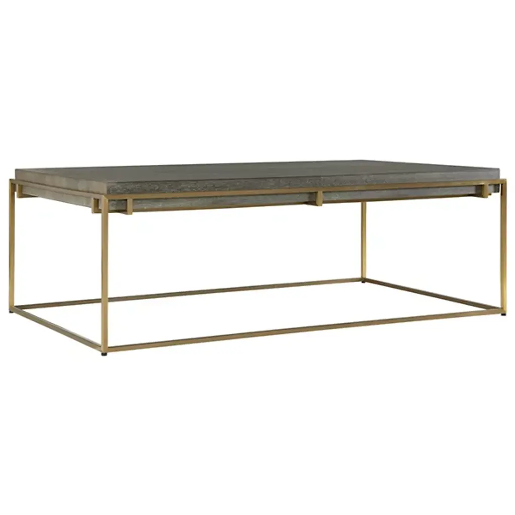 Transform your interior with the modern flair of the Surround Coffee Table by Uttermost. Crafted by designer Matthew Williams, this stunning piece seamlessly blends elements of Mid-Century Modern and Contemporary styles. Its acacia veneer top, finished in a dark walnut stain with a subtle light gray glaze, exudes warmth and sophistication. The wood top is suspended via a stainless steel framework plated in brushed brass, achieving a perfect balance of elegance and contemporary flair.