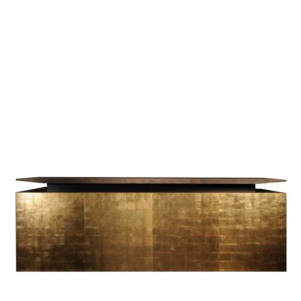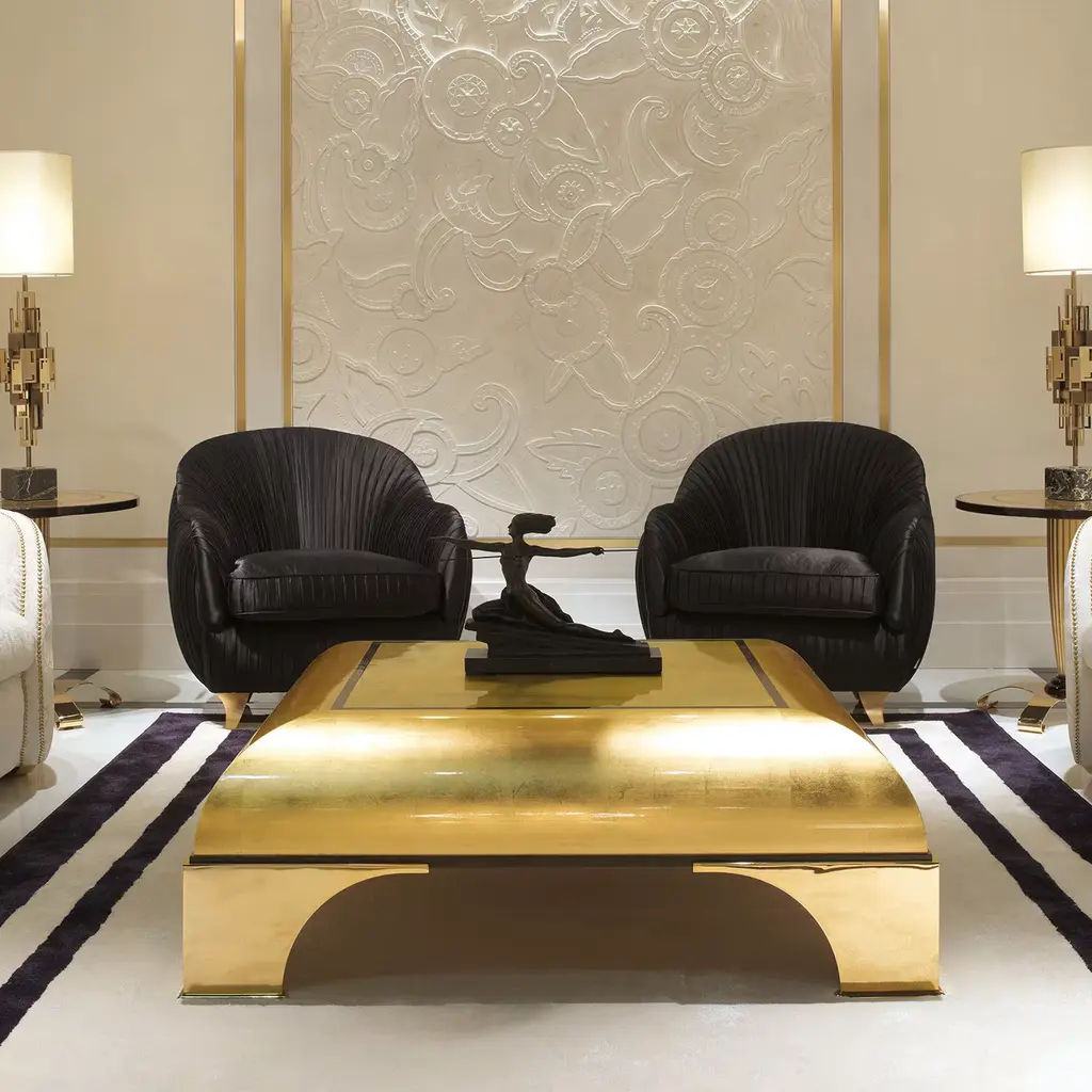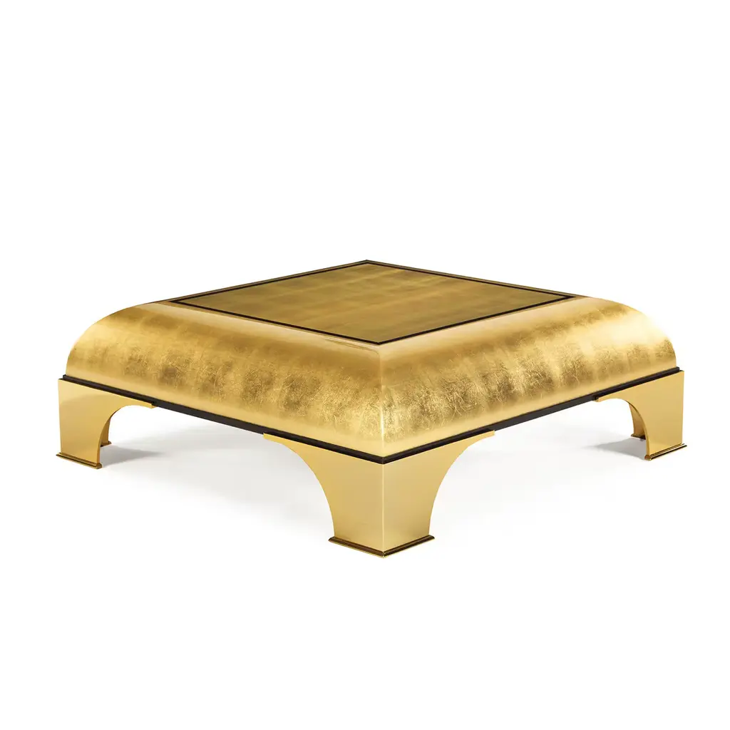 A magnificent piece that will elevate the look of a living room, creating a sumptuous ambiance and providing at the same time ample space to display collectibles and other objects, this coffee table will be a precious addition to any home. The four brass legs are curved and the same gentle curve elevates the wooden top, giving the piece a delicate and stunning silhouette. The wood is coated with precious gold leaf, which mirrors the warm glow of the metal.