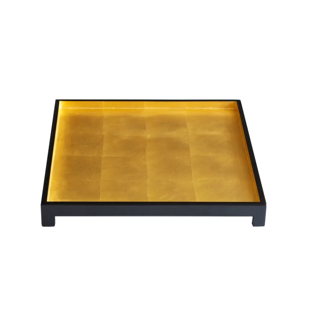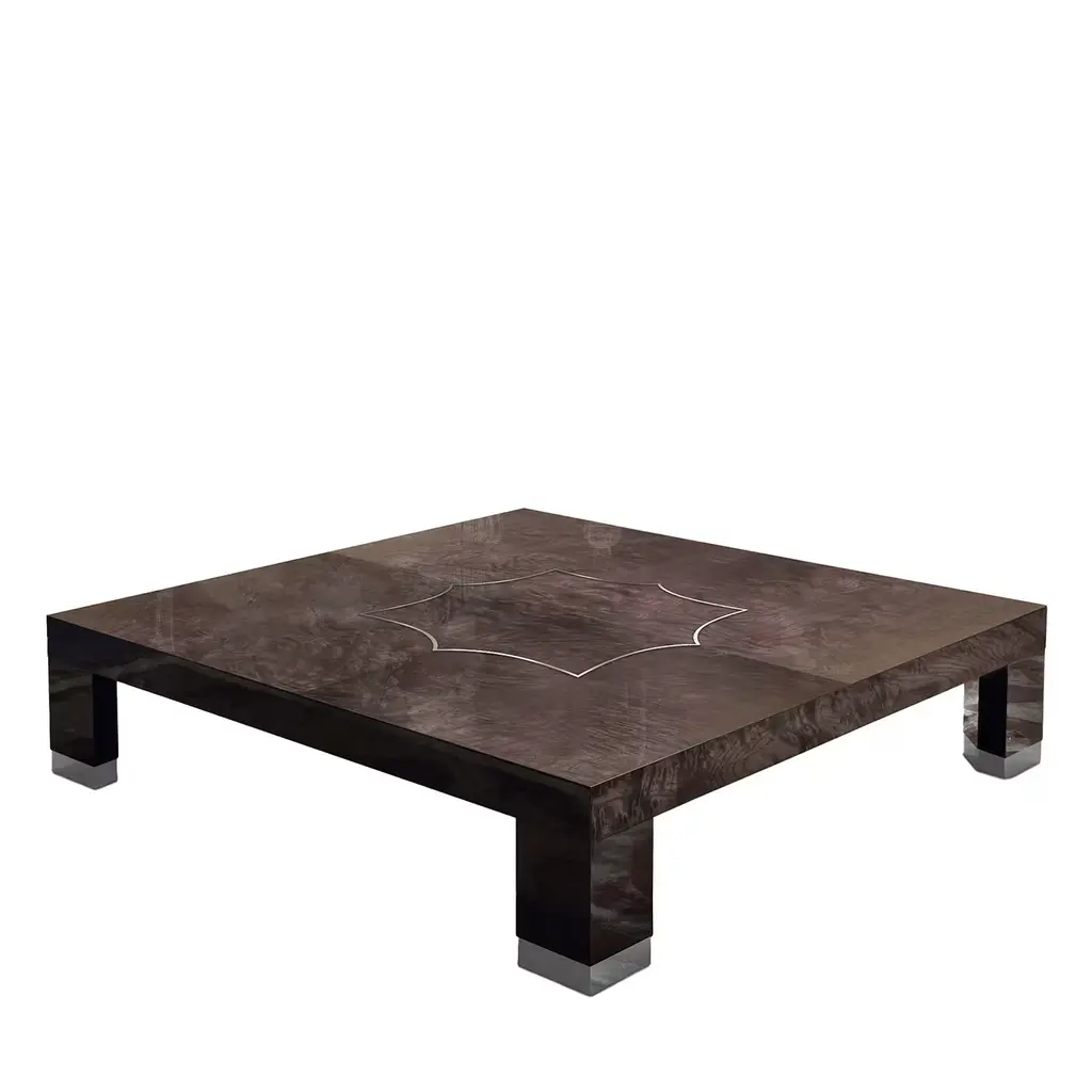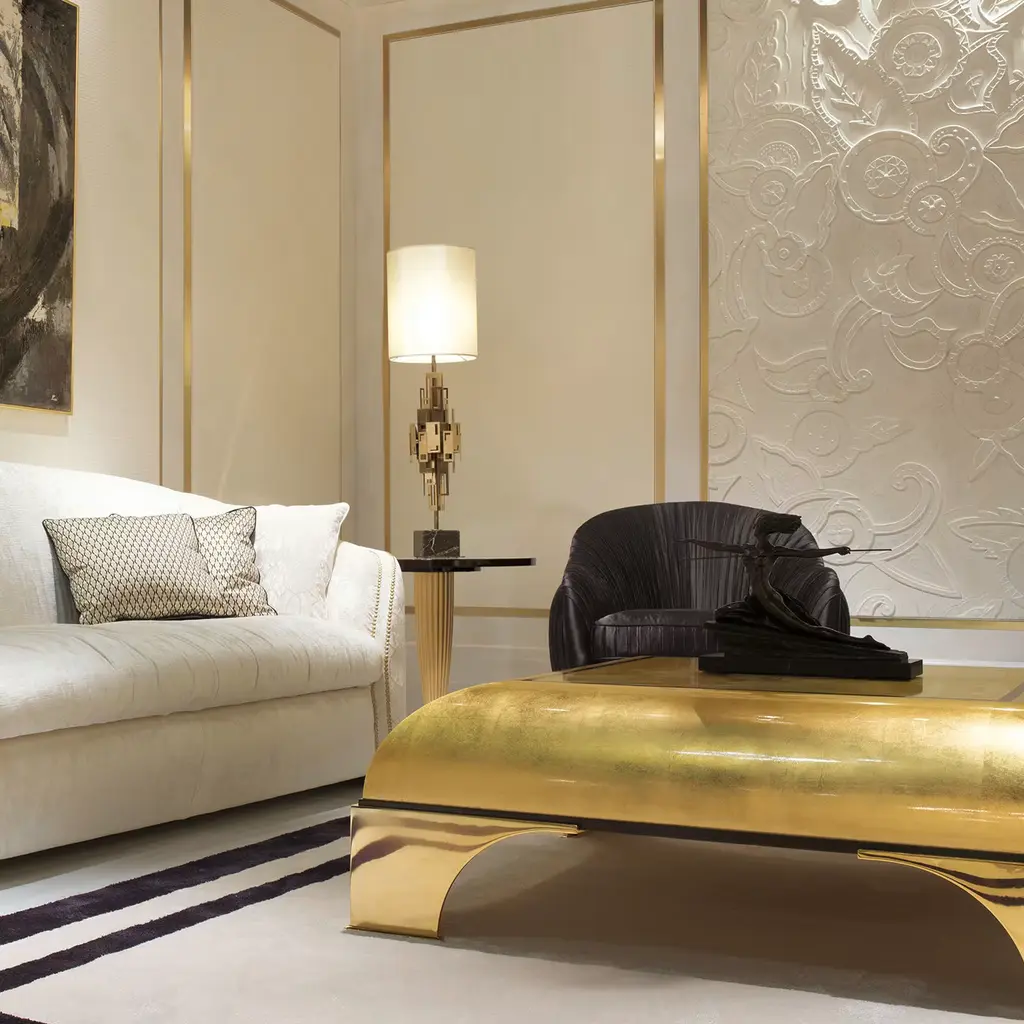 A magnificent piece that will elevate the look of a living room, creating a sumptuous ambiance and providing at the same time ample space to display collectibles and other objects, this coffee table will be a precious addition to any home. The four brass legs are curved and the same gentle curve elevates the wooden top, giving the piece a delicate and stunning silhouette. The wood is coated with precious gold leaf, which mirrors the warm glow of the metal.