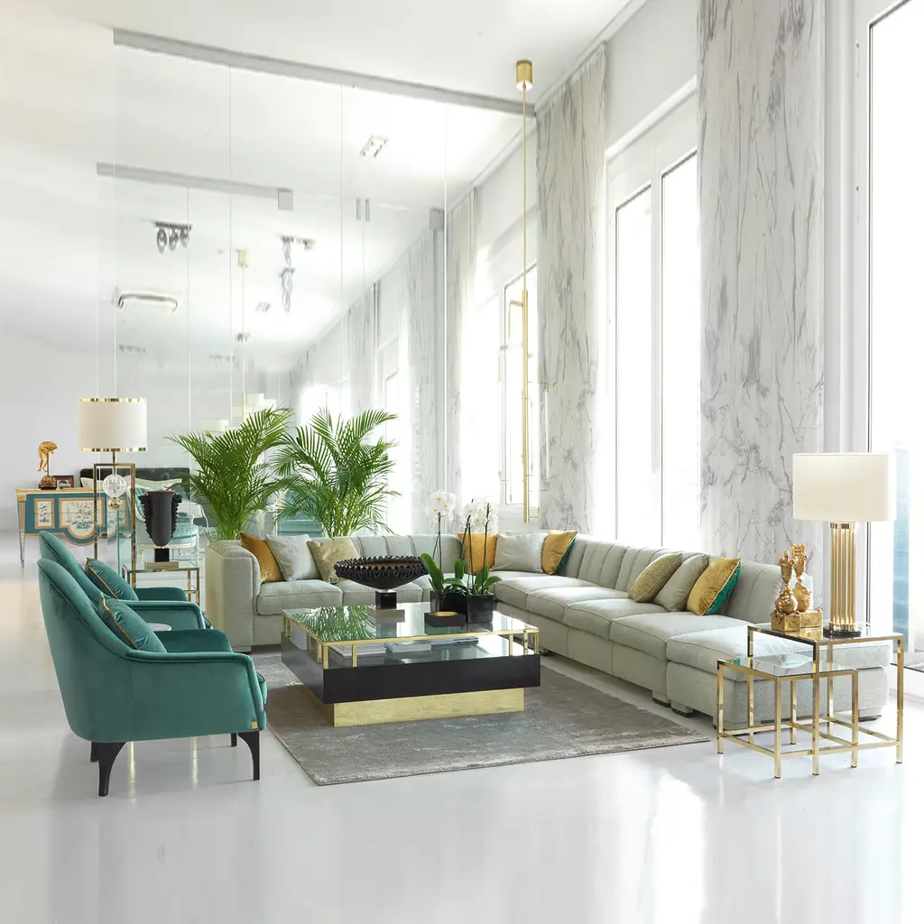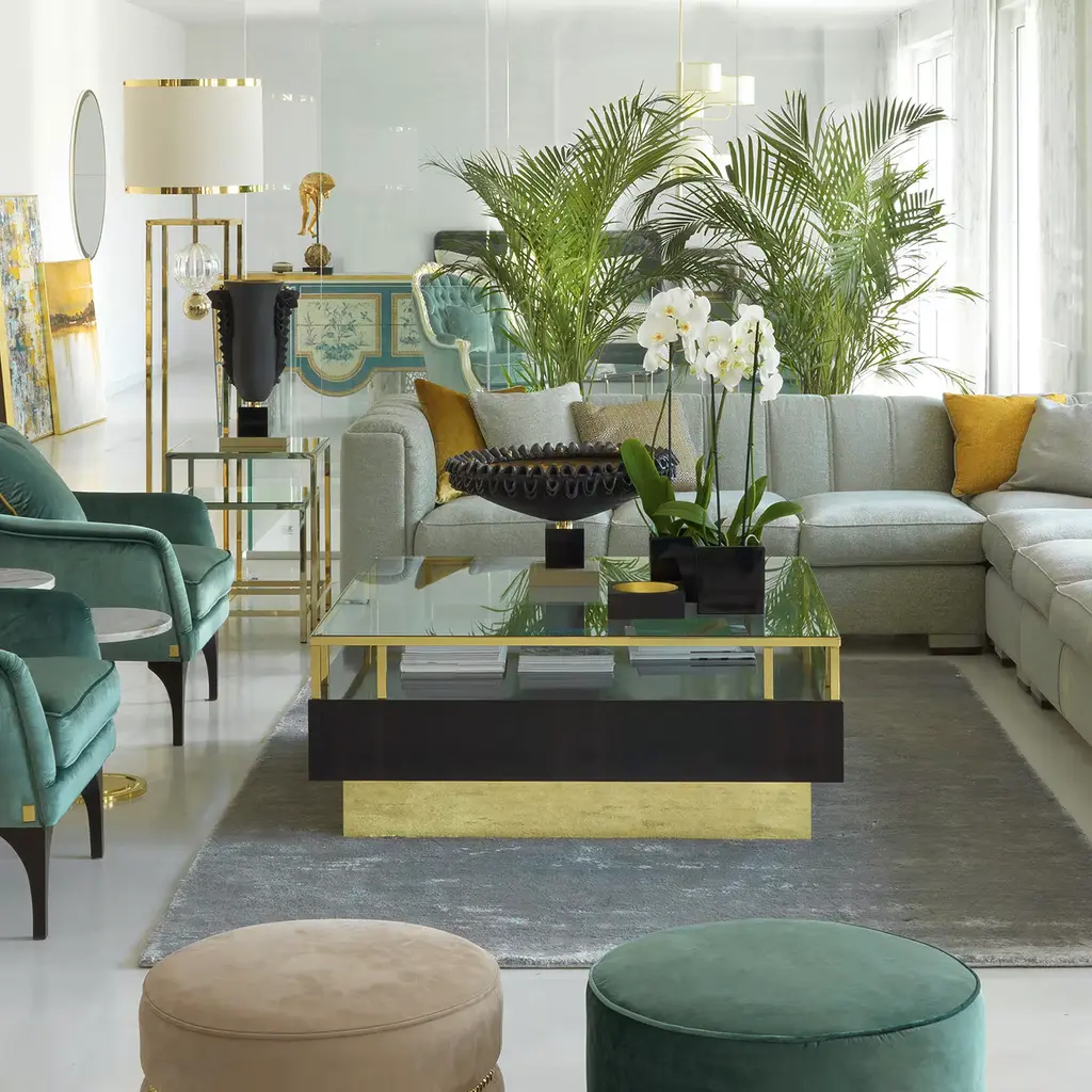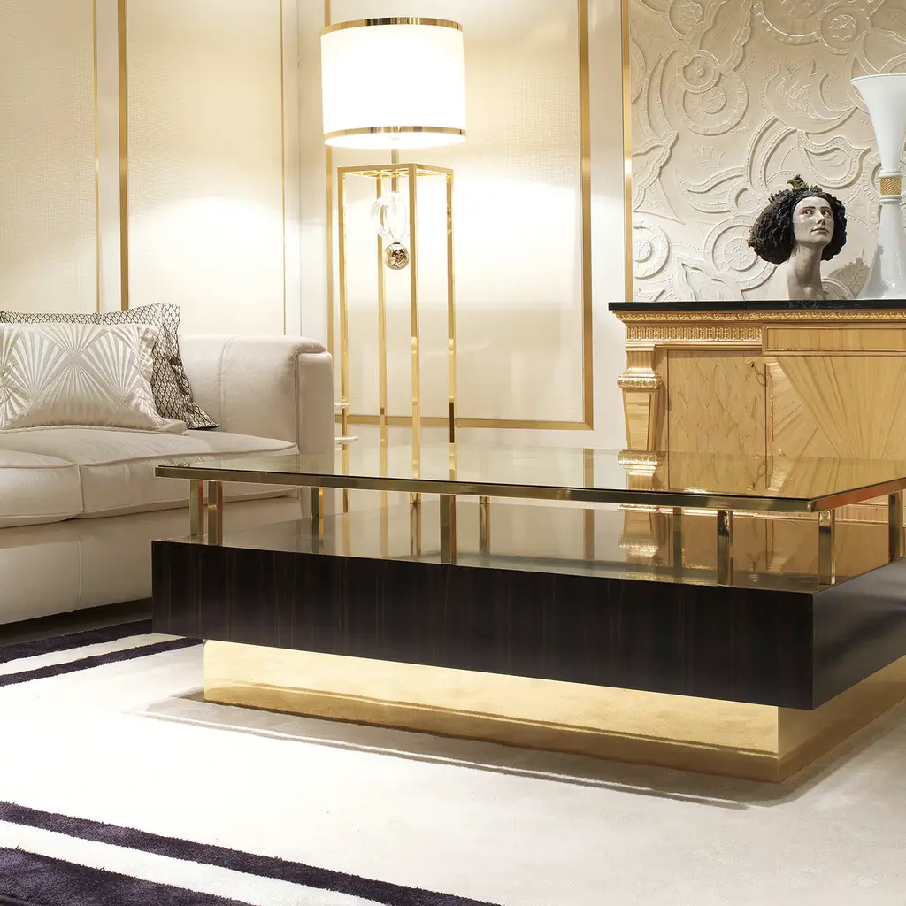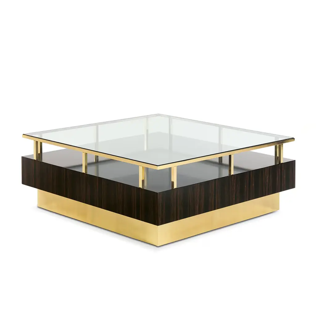 This elegant coffee table is part of a series of pieces with ebony as main element. The square base is in brass, and the luxurious hue of the metal strikingly complements the dark shade of the wood above. The table is adorned with a glass top supported by a series of brass elements stemming from the edges of the wood shelf, creating two surfaces to display books and other collectibles.