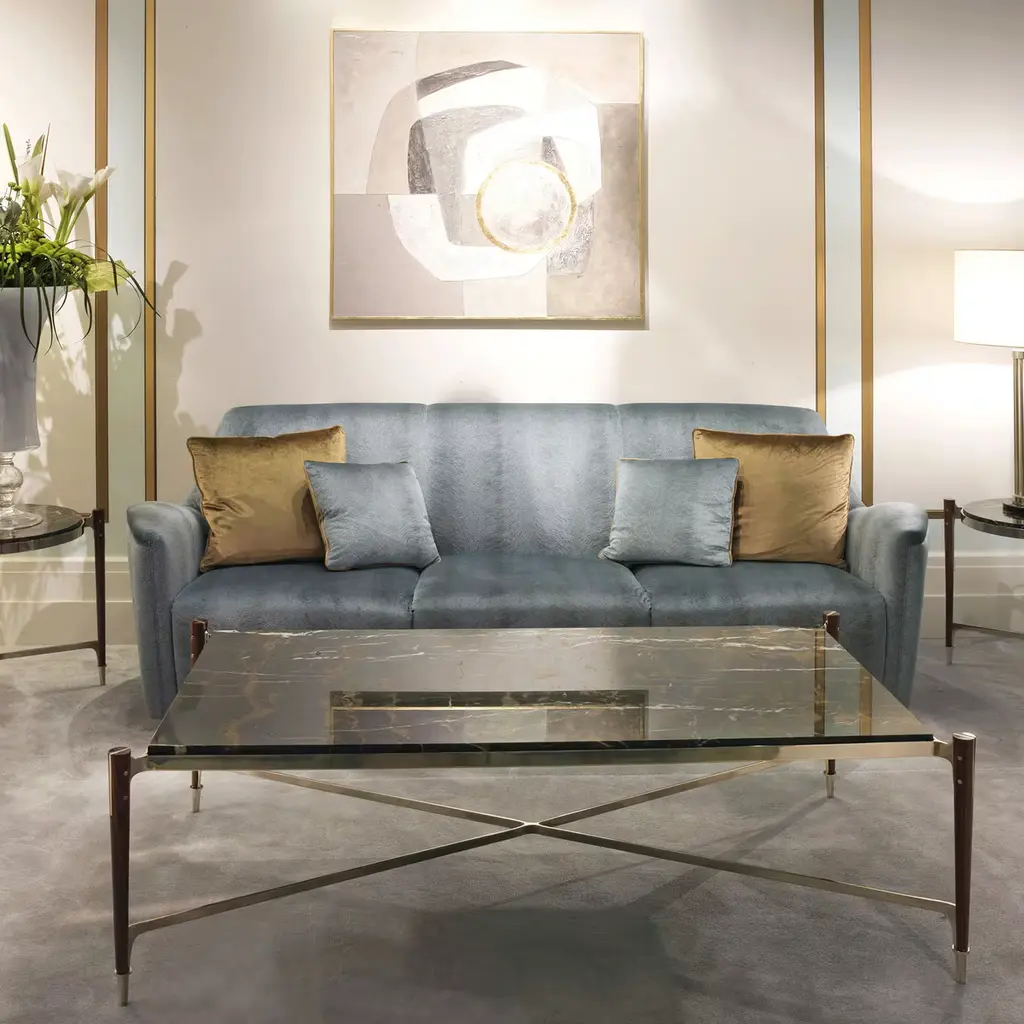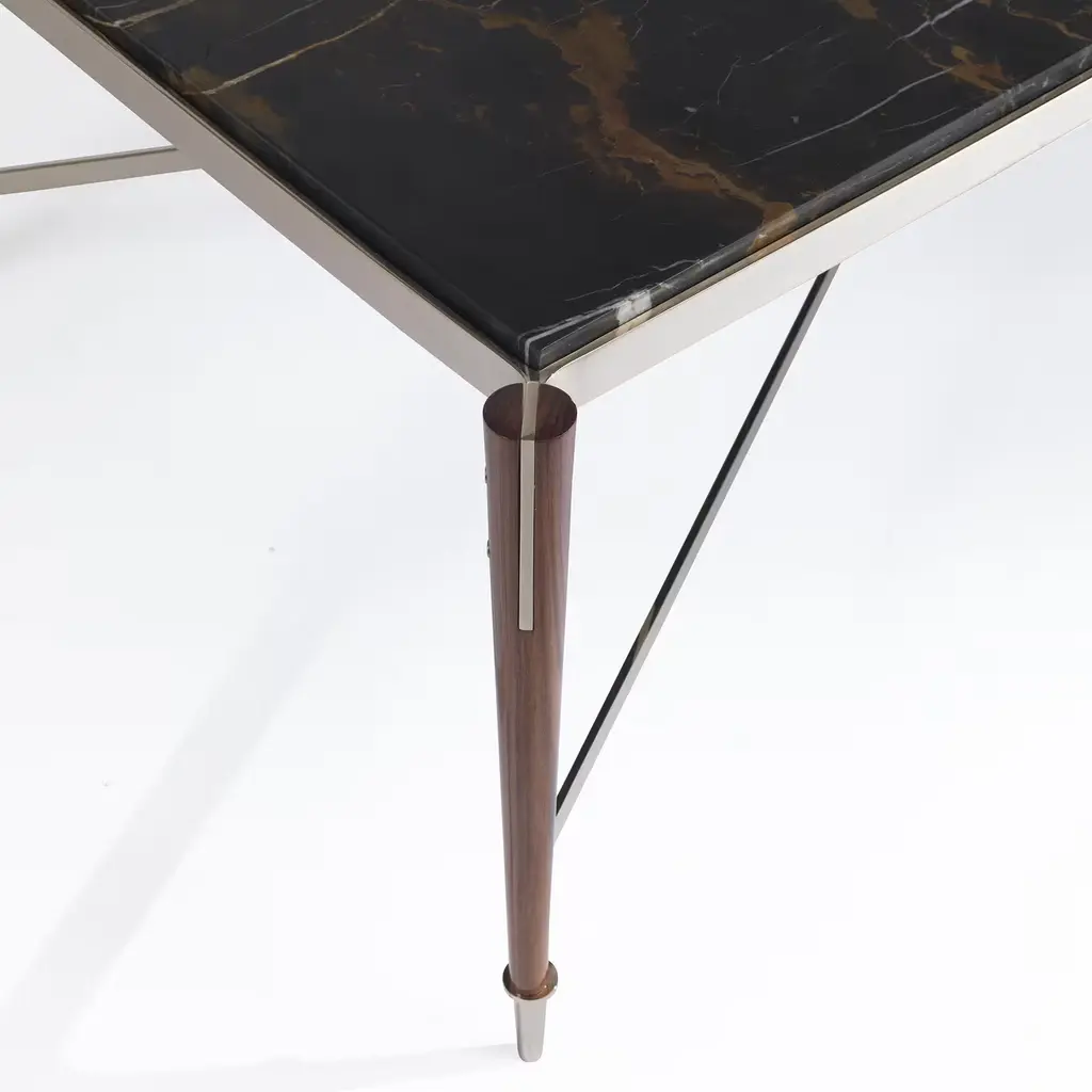 Meticulously designed by expert craftsmen, this table is characterized by balanced forms and prized materials. Fashioned of black and gold marble, the bold rectangular top is encased in an iron rim and supported by tapered legs in solid dark rosewood. Two intersecting iron rods create an X-shaped base, connecting the legs for structural support and aesthetic flair. This stunning combination of materials and colors will be a dramatic touch to any minimalist or traditional decor.