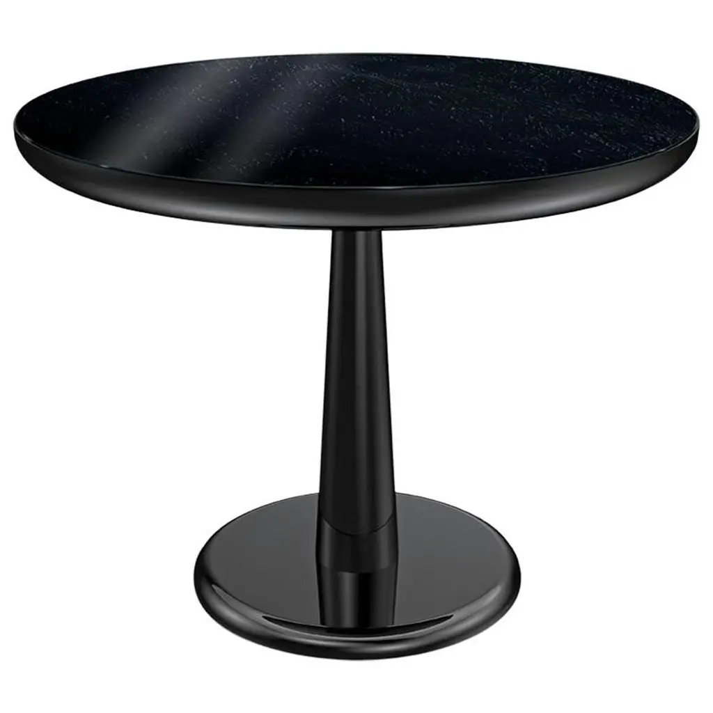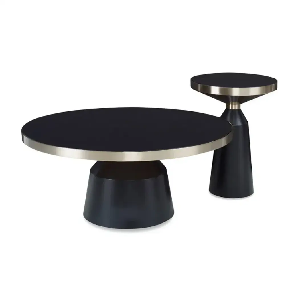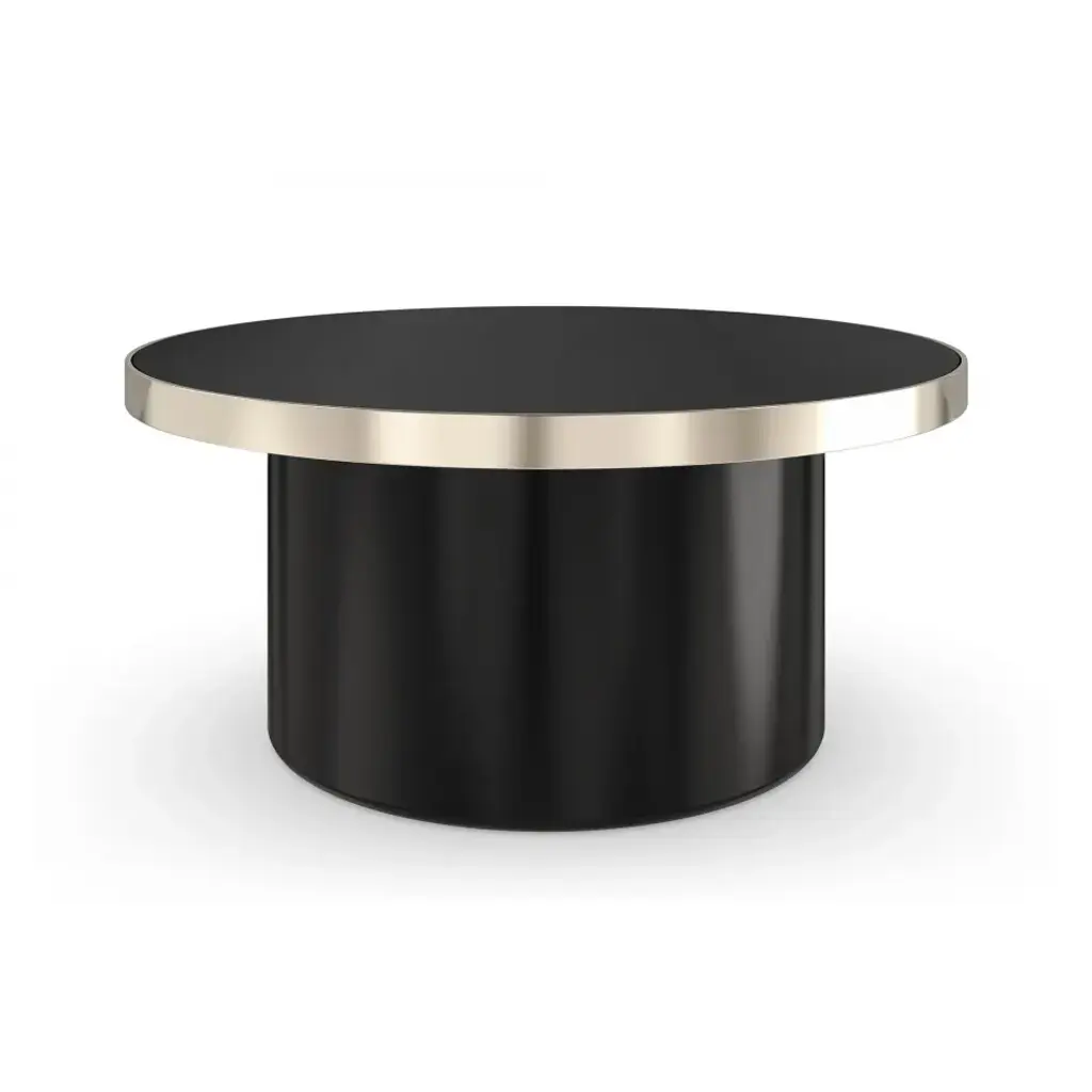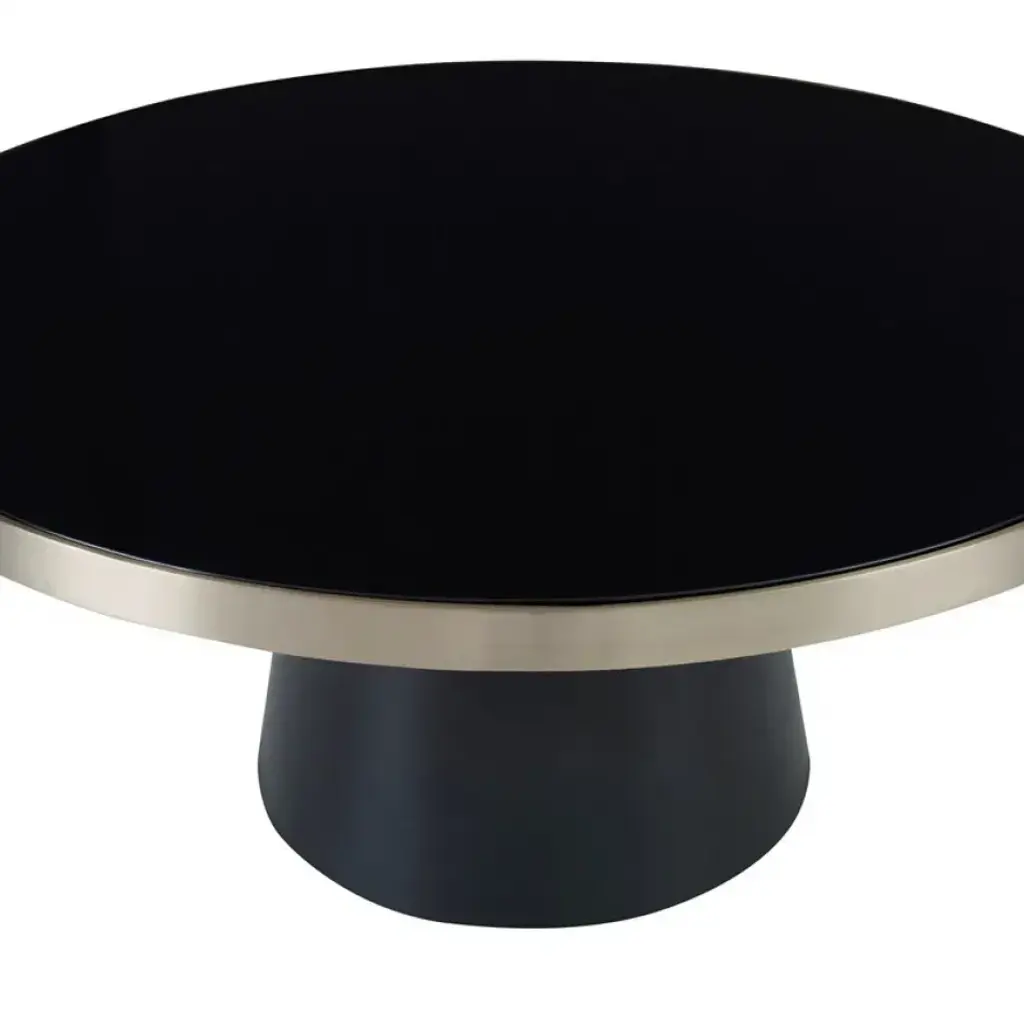 A round cocktail table featuring a matte black metal pedestal base and a black glass top with a brass apron.