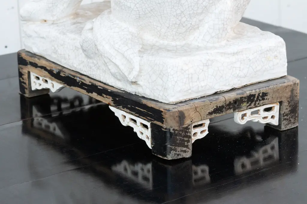 A large vintage elm wood coffee table featuring distinctive chow legs and a rubbed sealed and wax finish. This Chinese elm wood coffee table seamlessly blends understated elegance with sturdy functionality. The large square coffee table stands on uniquely designed chow legs, not only ensuring a stable foundation but also infusing a touch of Asian aesthetic into the piece.