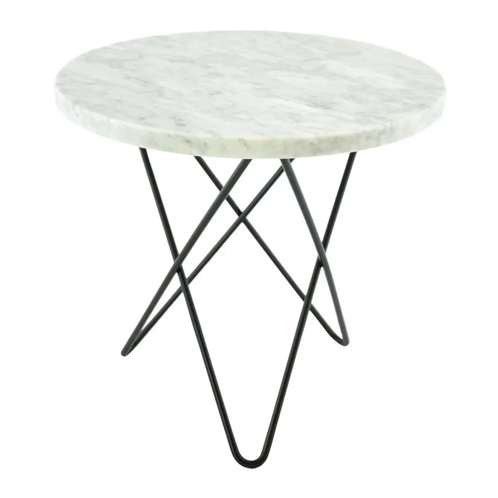The Tall Mini O Table is a smaller version of the O Table by OX Denmarq. The design is an interesting combination of two different materials: the softly bent metal frame gives the table a light appearance, perfected by the vivid surface of the thick marble top. Created by designer Dennis Marquart, the Tall Mini O Table is a perfect choice as a sofa table for a smaller couch, a coffee table for a reading corner or an extra table to other rooms of the house. The white, Italian Carrara marble is characterized by gray veins crossing the white stone, and small details such as cracks are also part of its natural character. The marble top is attached to the frame with screws.