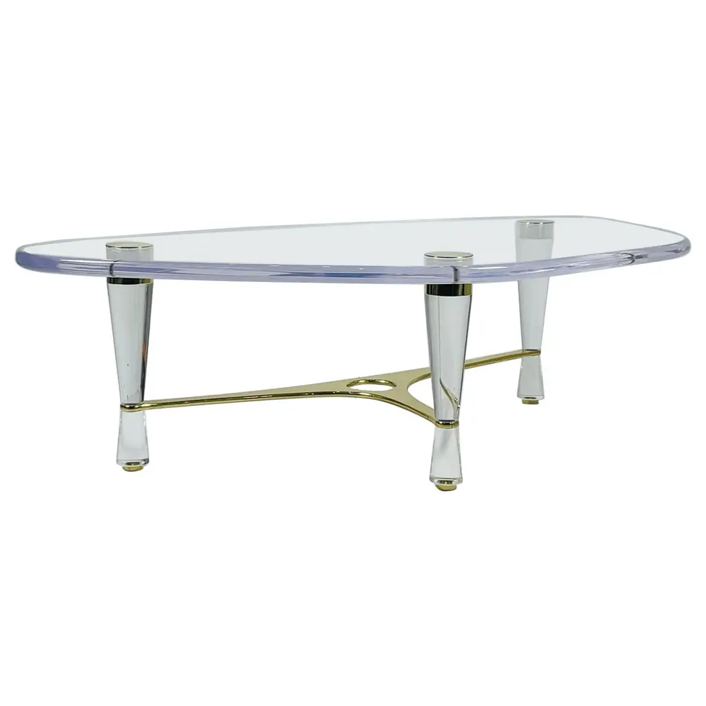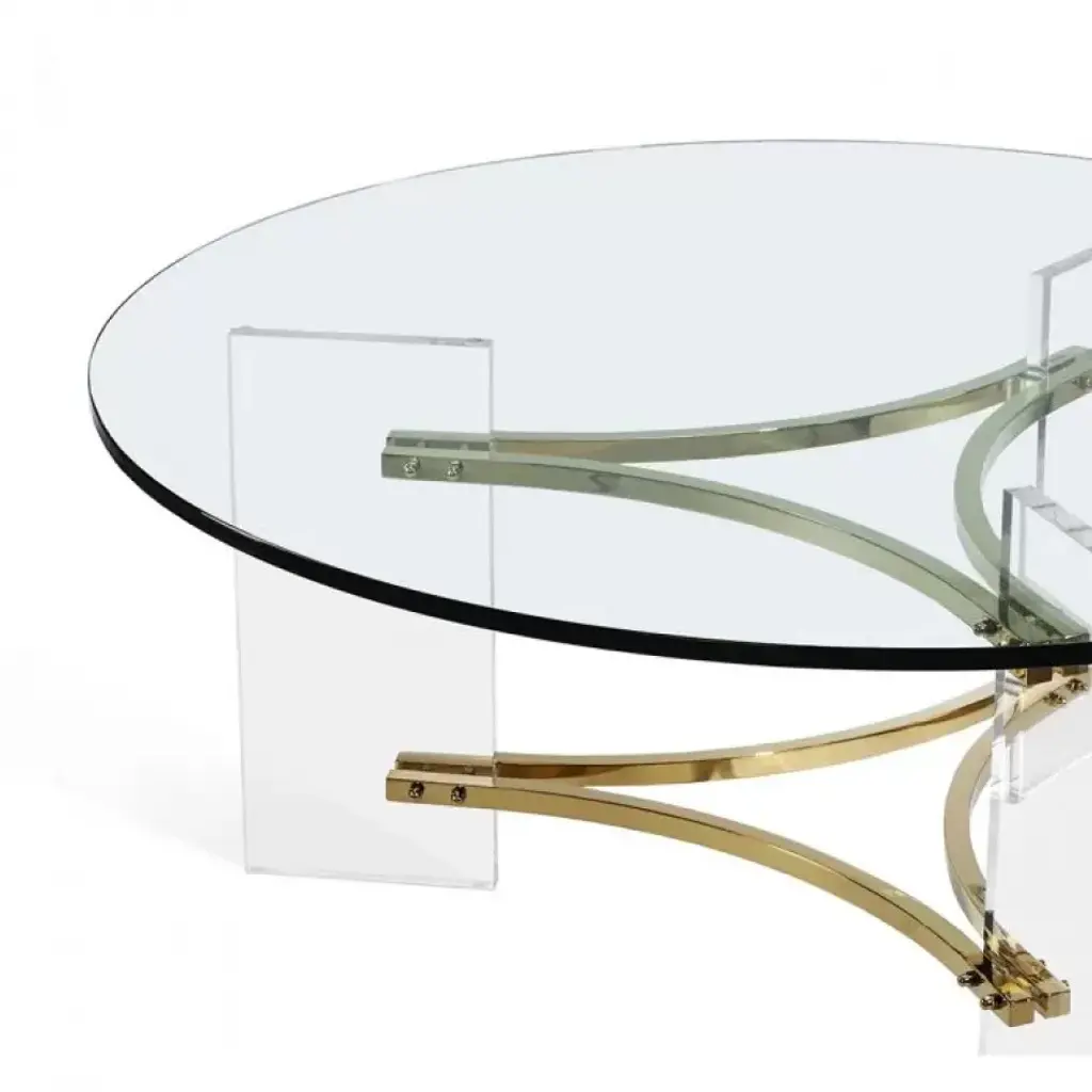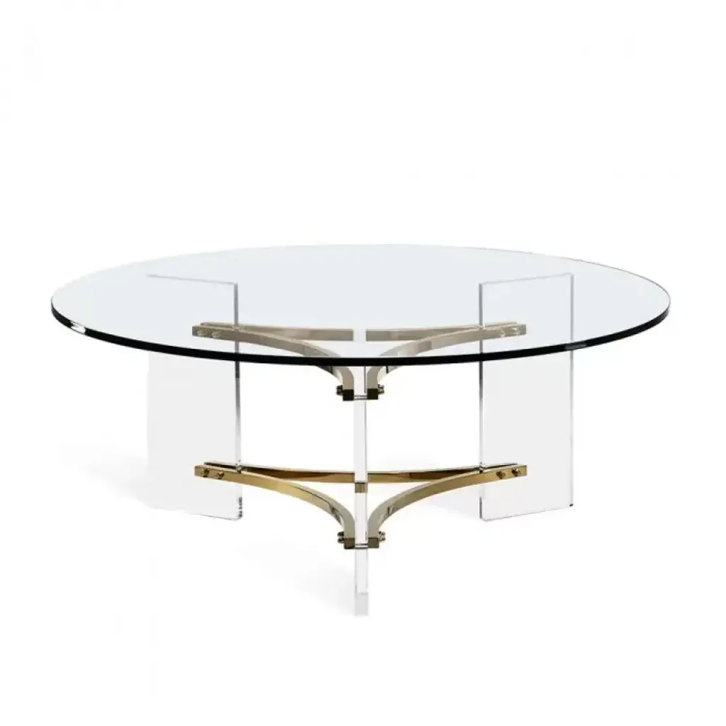 A unique acrylic and polished brass-finished stainless steel base makes the glass Tamara Cocktail Table into a statement piece.