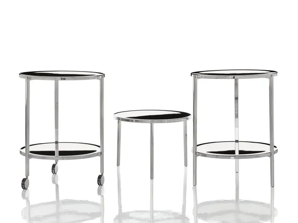 Low tables.Materials: frame in polished die-cast aluminium. Top in polished aluminium.