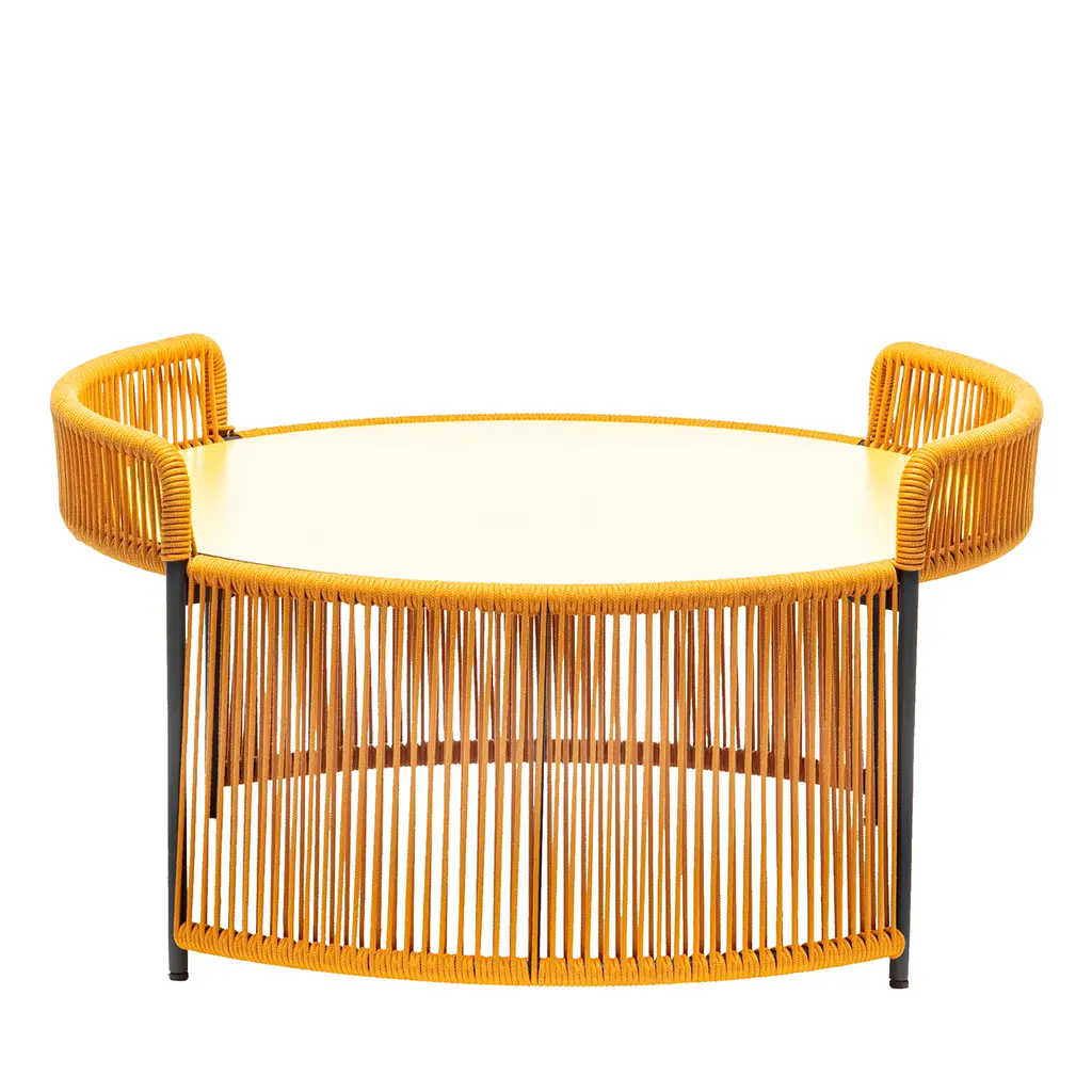 A lively addition to a pool area or patio around which to gather with a friend for a tea break or an aperitif, this coffee table is a showcase of deft craftsmanship. The circular, yellow-finished HPL top rests on a streamlined, X-shaped steel frame powder-coated in anthracite gray, the embracing effect obtained by hand-weaving yellow marine rope in an intriguing diamond pattern.