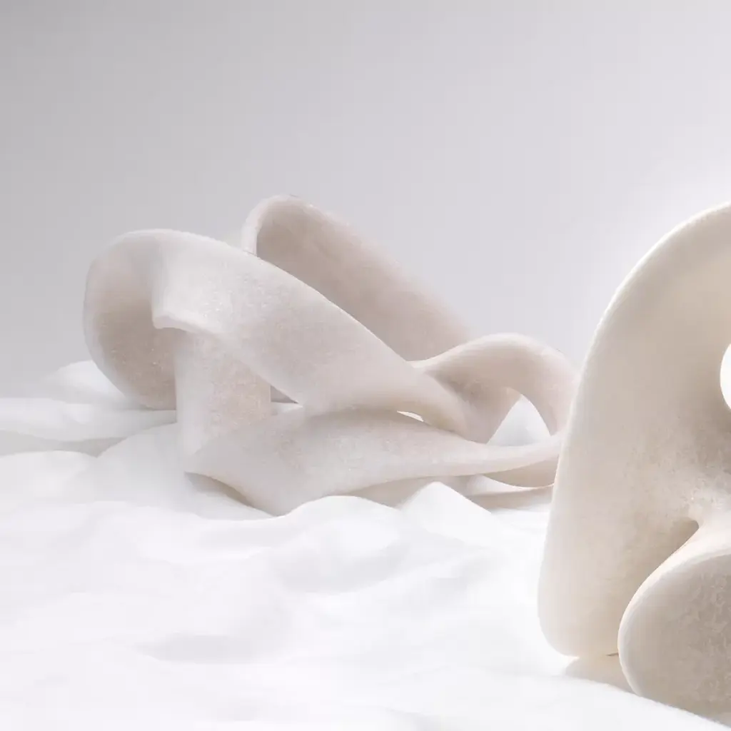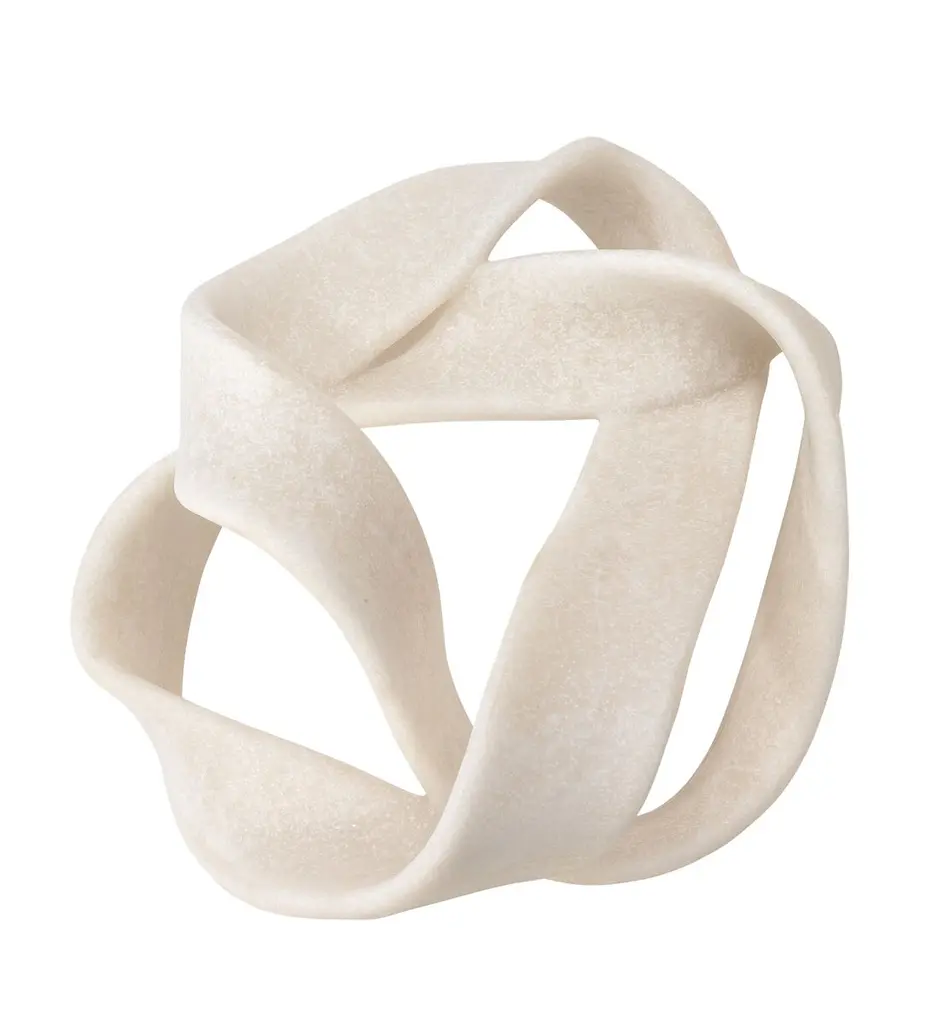 White resin straps curve around a center void creating an object full of smooth curves and visual interest. The Tangled Table Object is the perfect addition to any stack of books or coffee table curation.