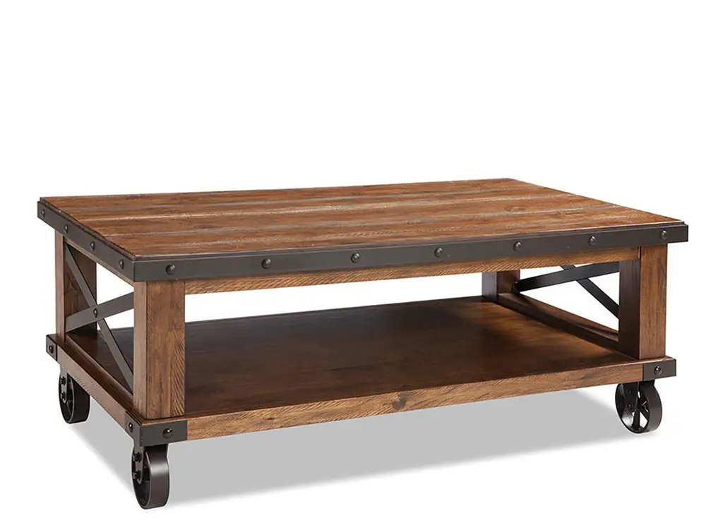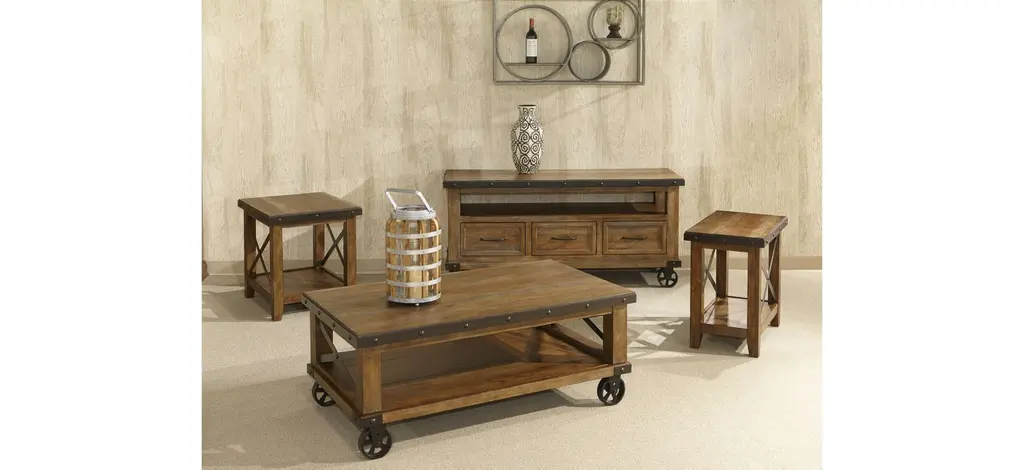 The Taos Living Collection is constructed from spruce veneers and select hardwoods and has a unique canyon brown finish. One TV stand and four accent Tables are available to meet your exact living room needs. Wrought iron accents and caster wheels combined with a gentle brushed finish gives this set a warm yet industrial feel. Perfect for rooms that are looking for that little something extra!