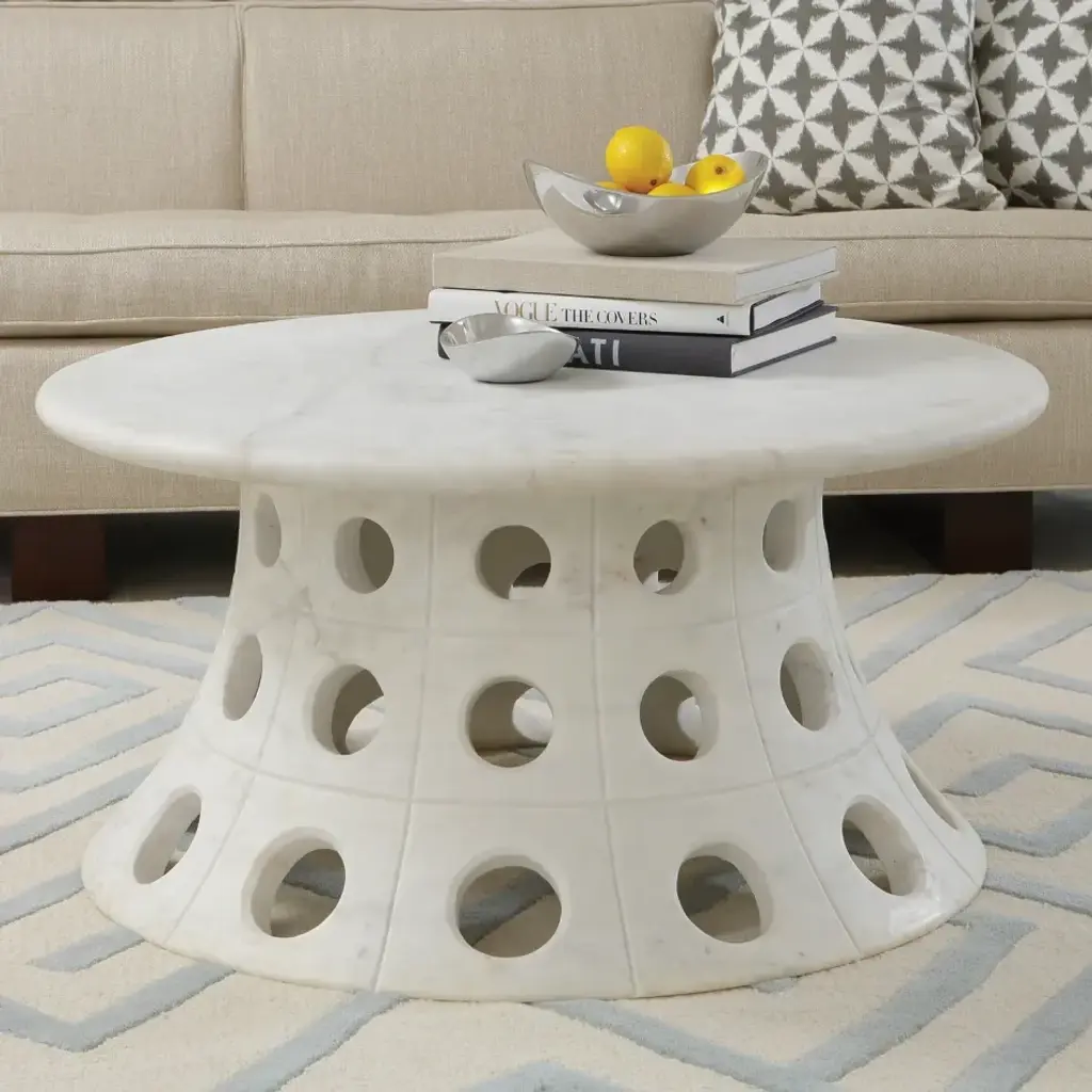 Solid marble, this tapered shape cocktail table is a modern update for any interior. From a fashion forward perspective, Global Views offers accessories, furniture, statement lighting, and an assortment of rugs and mirrors to add beauty and joy to your home.