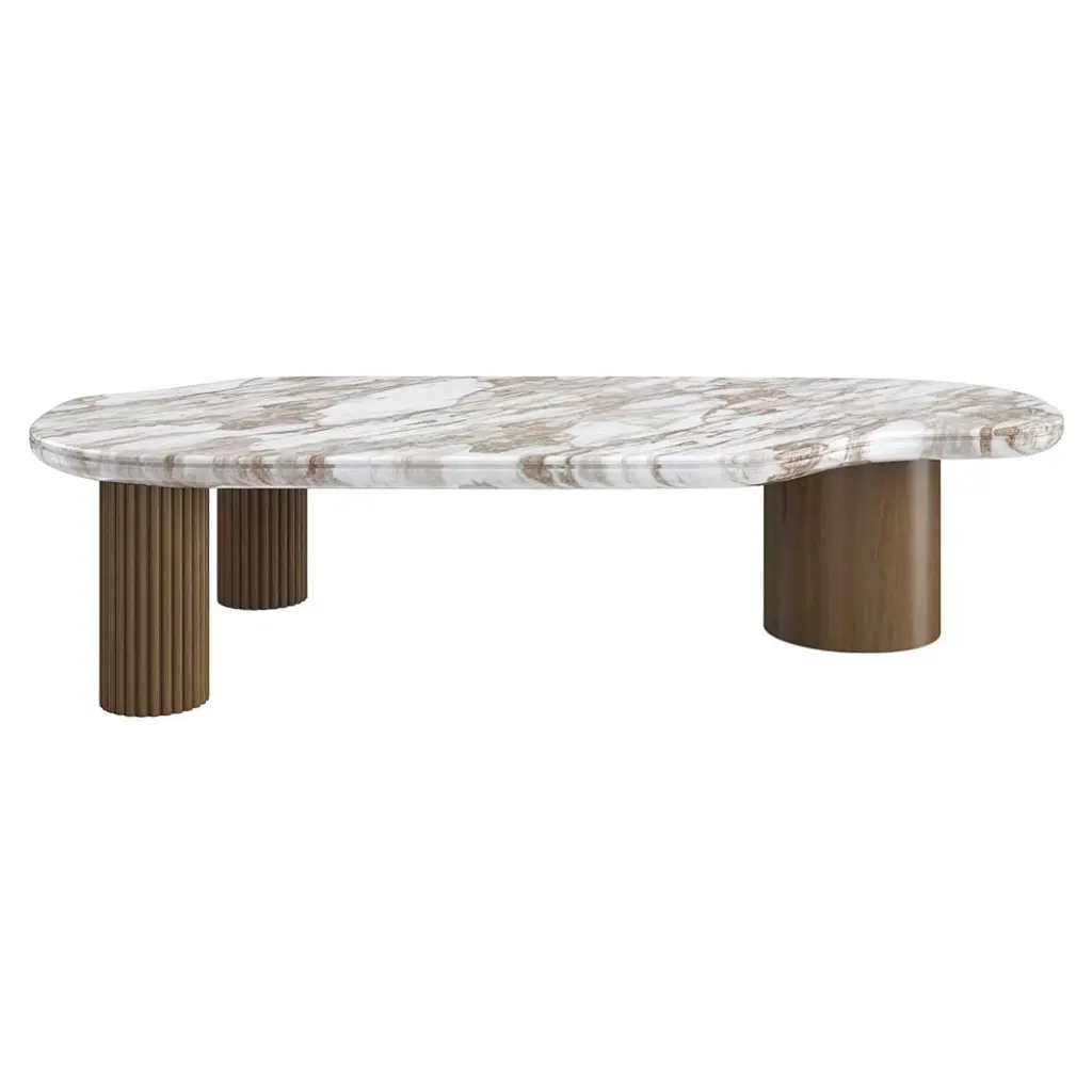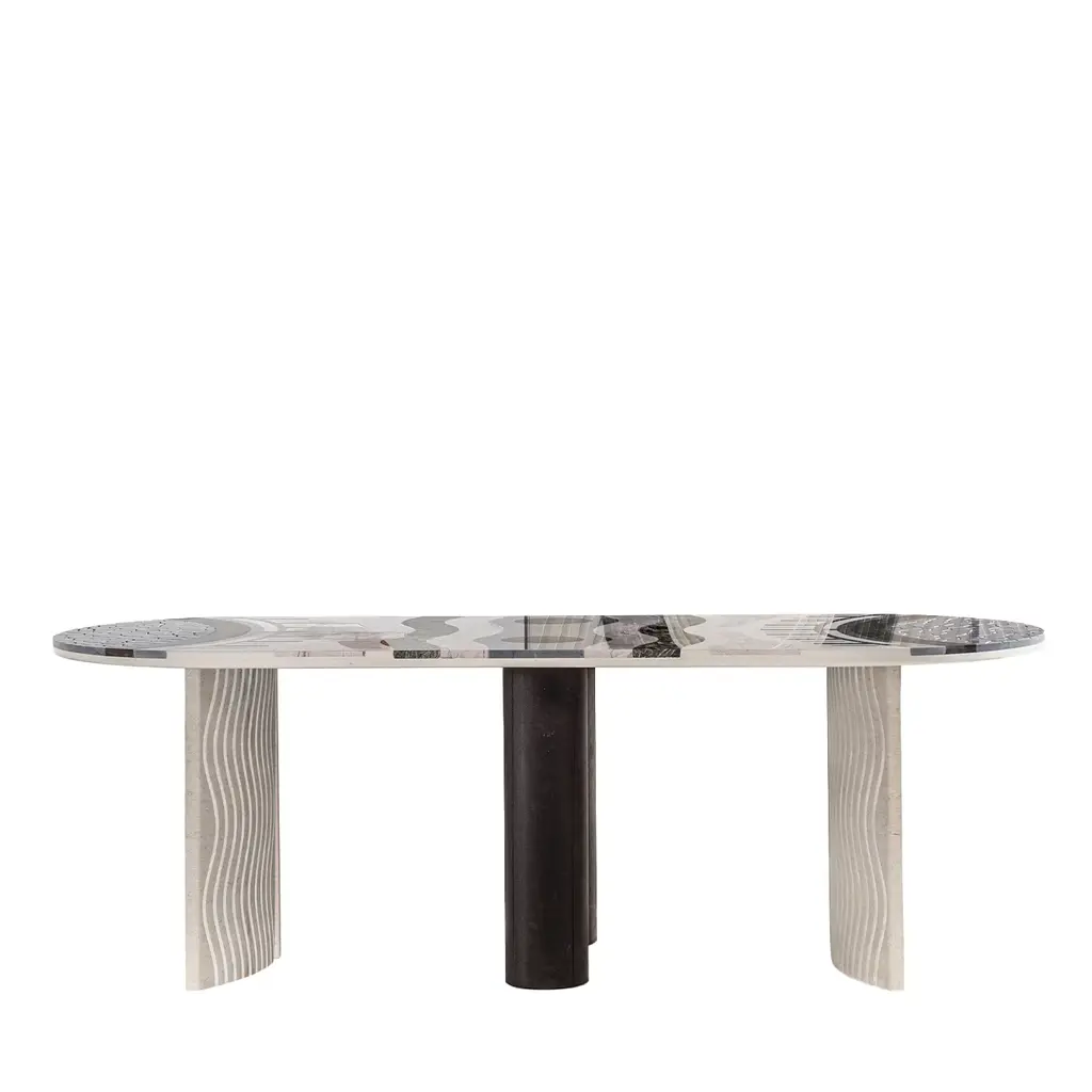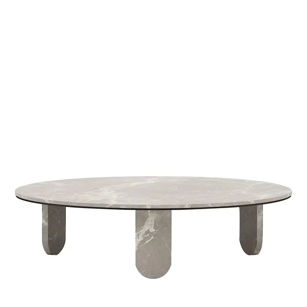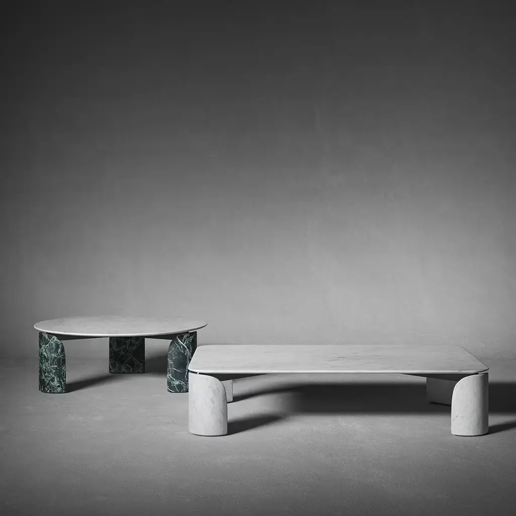A combination of prized marbles and captivating curves defines the exclusive character of this coffee table, a superb solution for serving tea, coffee, or refreshments on a luxe, natural canvas. Marked by intense traceries emerging from the deep-green background, the three curved legs in Verde Alpi marble sustain the struts onto which sits the circular tabletop in bright white Carrara marble. A version in Avola stone is also available.