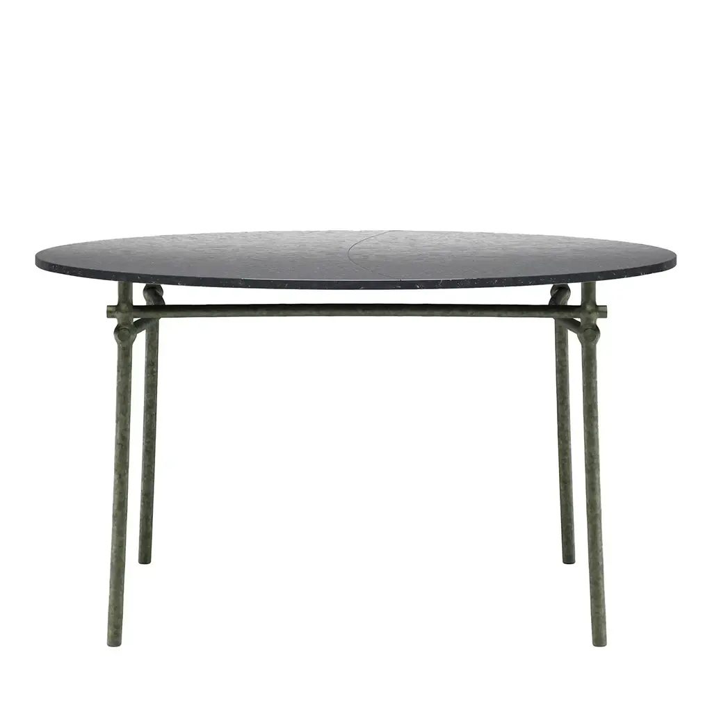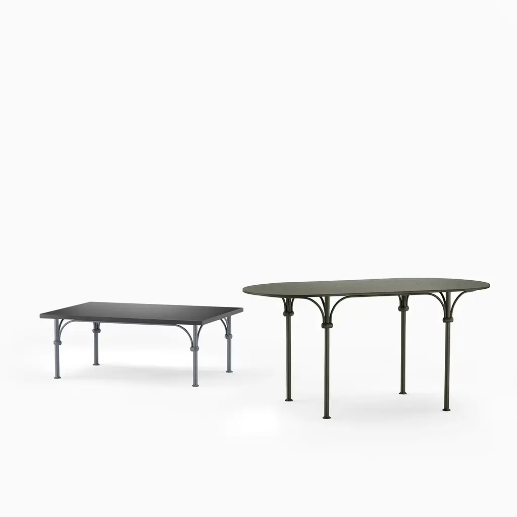 A bold and essential silhouette softened by elegant arched elements extending from its legs defines this coffee table as a clever synthesis of femininity and rigor. Sporting a rectangular top fashioned of precious lava stone, the galvanized metal structure boasts a gray-toned powder coating for exceptional weatherability. Please explore available color variants with the Concierge.