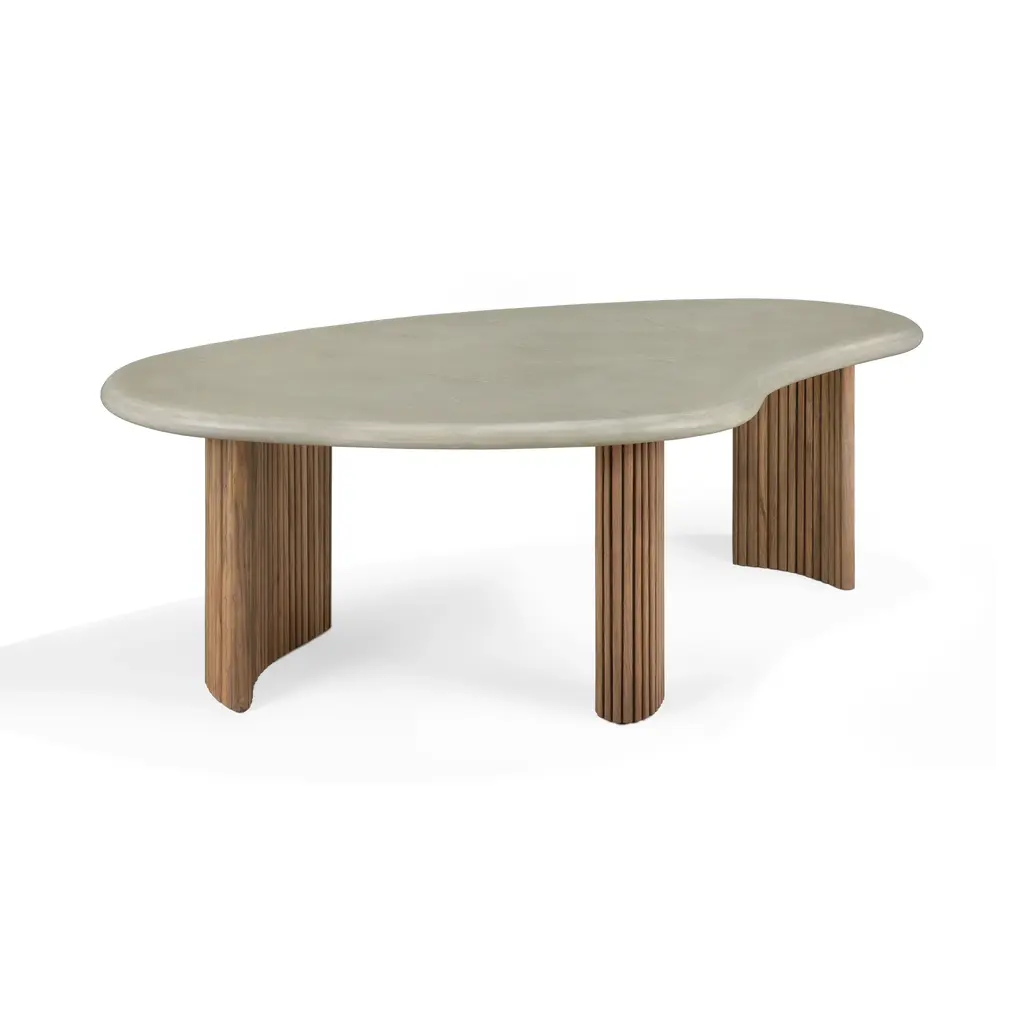 Playful, pebble shapes set on a beautiful, folded, base. Inspired by its popular indoor design, the Boomerang outdoor coffee table features a hand-finished concrete top, paired with a reclaimed solid teak base, a beautiful material mix provides durable practicality to both indoor and outdoor spaces. Configured with the two sizes together, or as a stand-alone, this well-proportioned design is sure to capture attention.