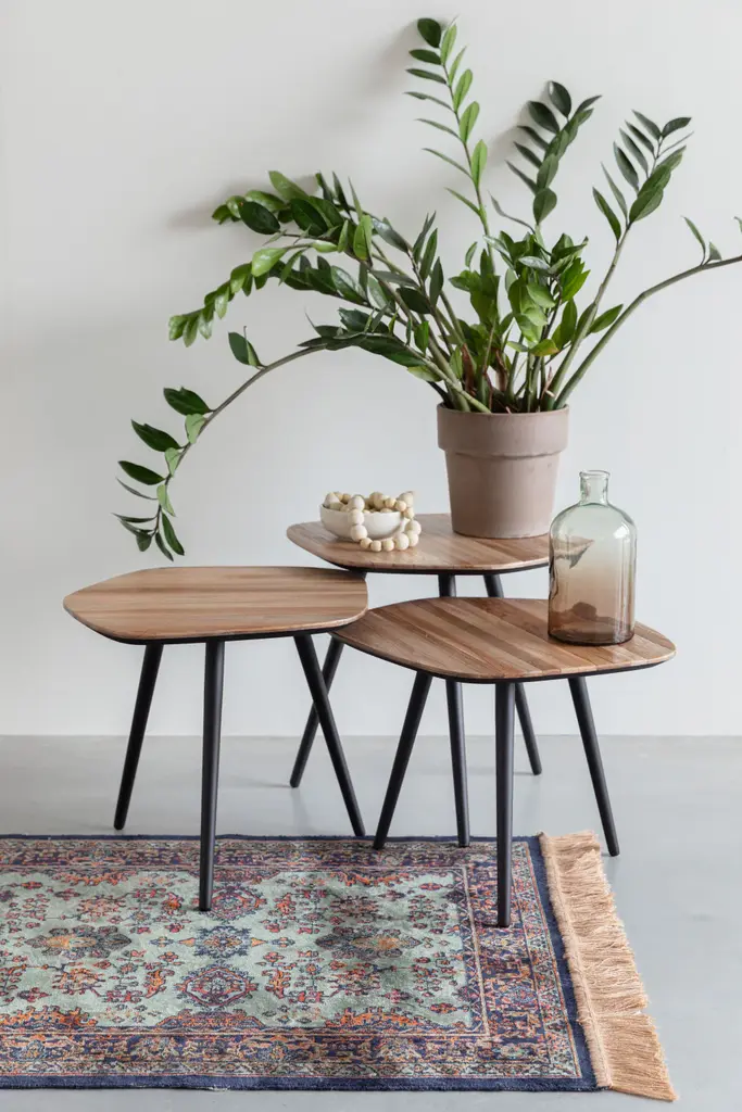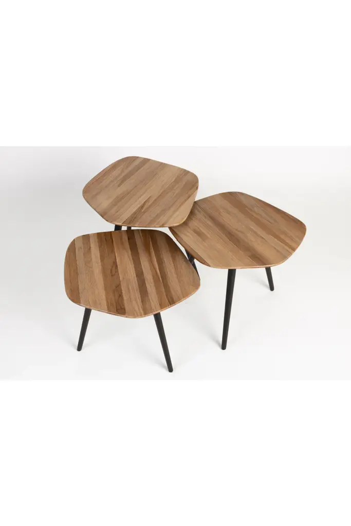 Transform your living space with the versatile Set of 3 Cuties Coffee Tables by DF. Crafted with recycled teak veneer tabletops in natural lacquer finish, these eco-friendly tables evokes a distinct sense of warmth and nostalgia. Each table is supported by three sleek black iron legs and showcases pentagonal tabletops with rounded edges. Their adaptable design allows you to use them individually or as a set, making them a dynamic addition to your interior design. Create a harmonious arrangement, and switch them around to suit your needs, all while maintaining a sleek and modern aesthetic.
