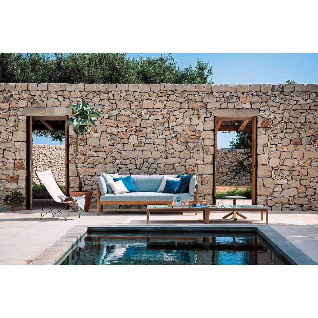 TEKA spotlights all the expressive force of teak, a wood whose high value is equally matched by its malleability, in a complete collection of outdoor sofas and low tables, dining tables, and chairs. Designed by Gordon Guillaumier, TEKA is developed around a particular prism-shaped geometric construction of great impact which, at the same time, confers a sensation of lightness to the product, while retaining its intrinsic durability. The tops of the outdoor tables are in stoneware slates, with elegant opaque natural tones or vibrant glossy colors.