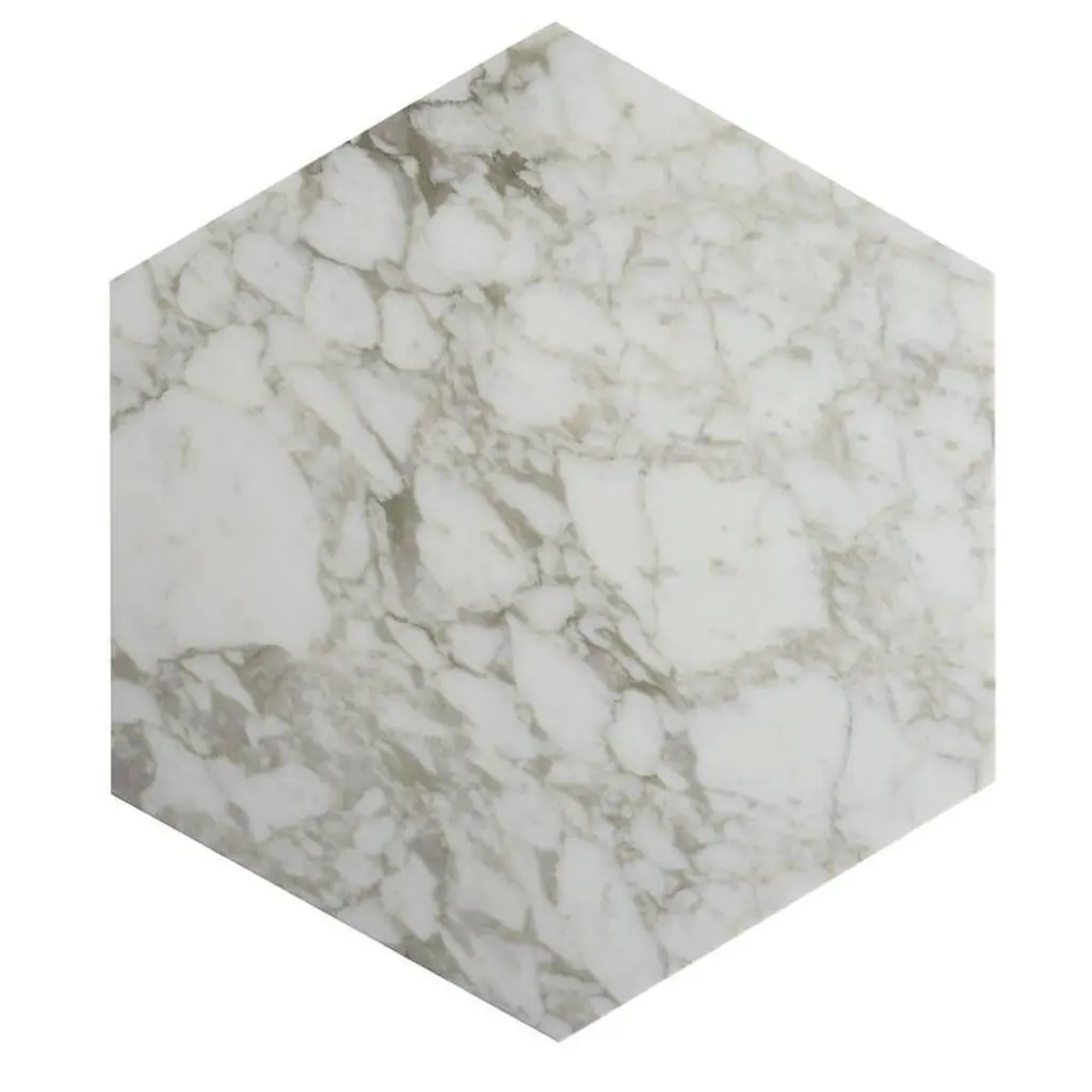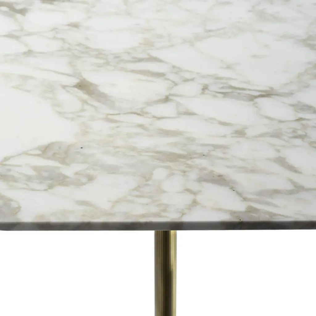 The structure of this striking coffee table is a brass hexagon supporting the marble top with the help of a single leg decorated throughout with ridges. This piece is available in several configurations of finishes and marbles. In this case the brass structure supports a top in gold Calcatta marble.