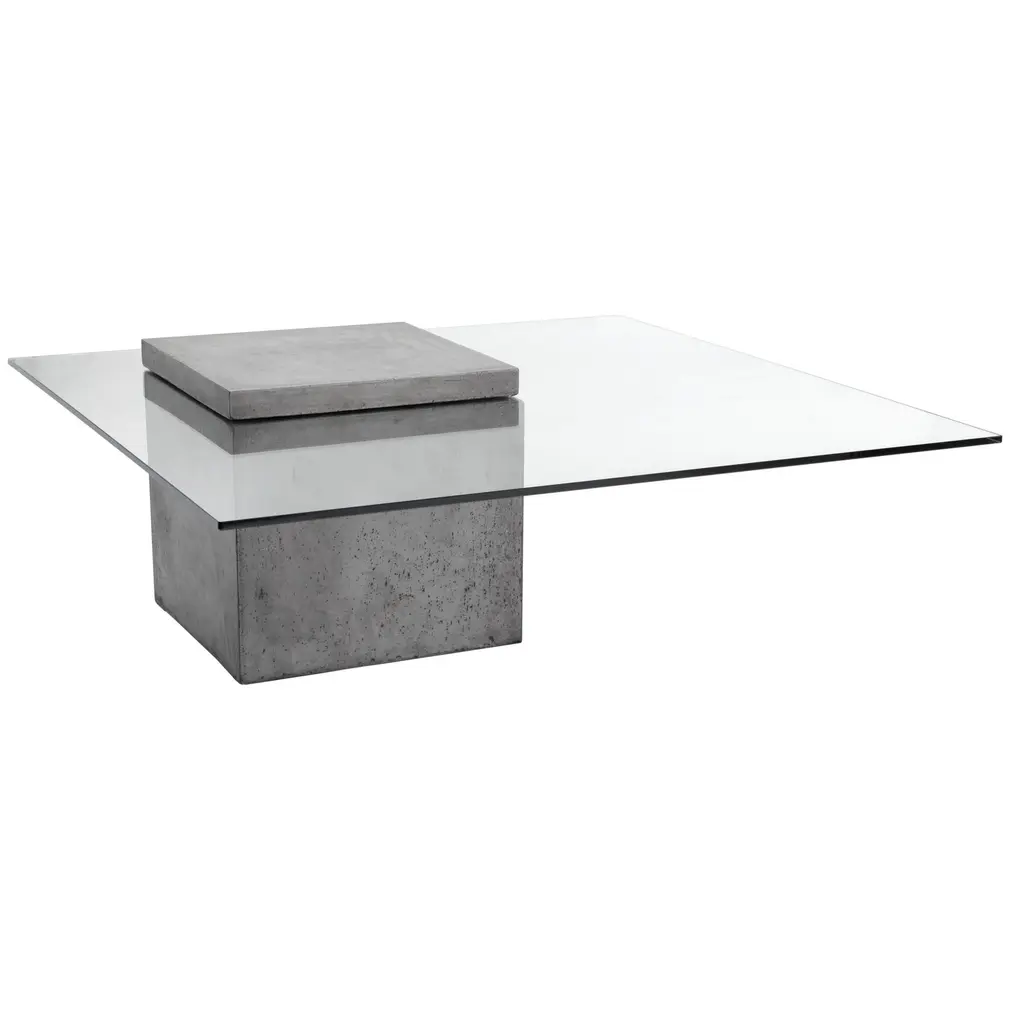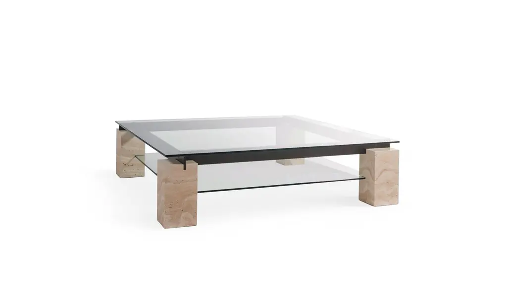 Square cocktail table, structure in 19 mm-thick MDF and oak or walnut veneer. Top tray in 12 mm-thick clear tempered glass, metal crossbars with epoxy lacquer finish. Bottom tray in 10 mm-thick glass. 17x17 cm base in classic concrete-like resin, concrete 350, white Carrare marble, Travertin or lacquer. Available patinas: concrete, col. dark or light grey, dark or light beige, concrete 350, col. light grey. Lacquer available in all RAL colors, satin finish. Other dimensions also available. <br><br>Manufactured in Europe