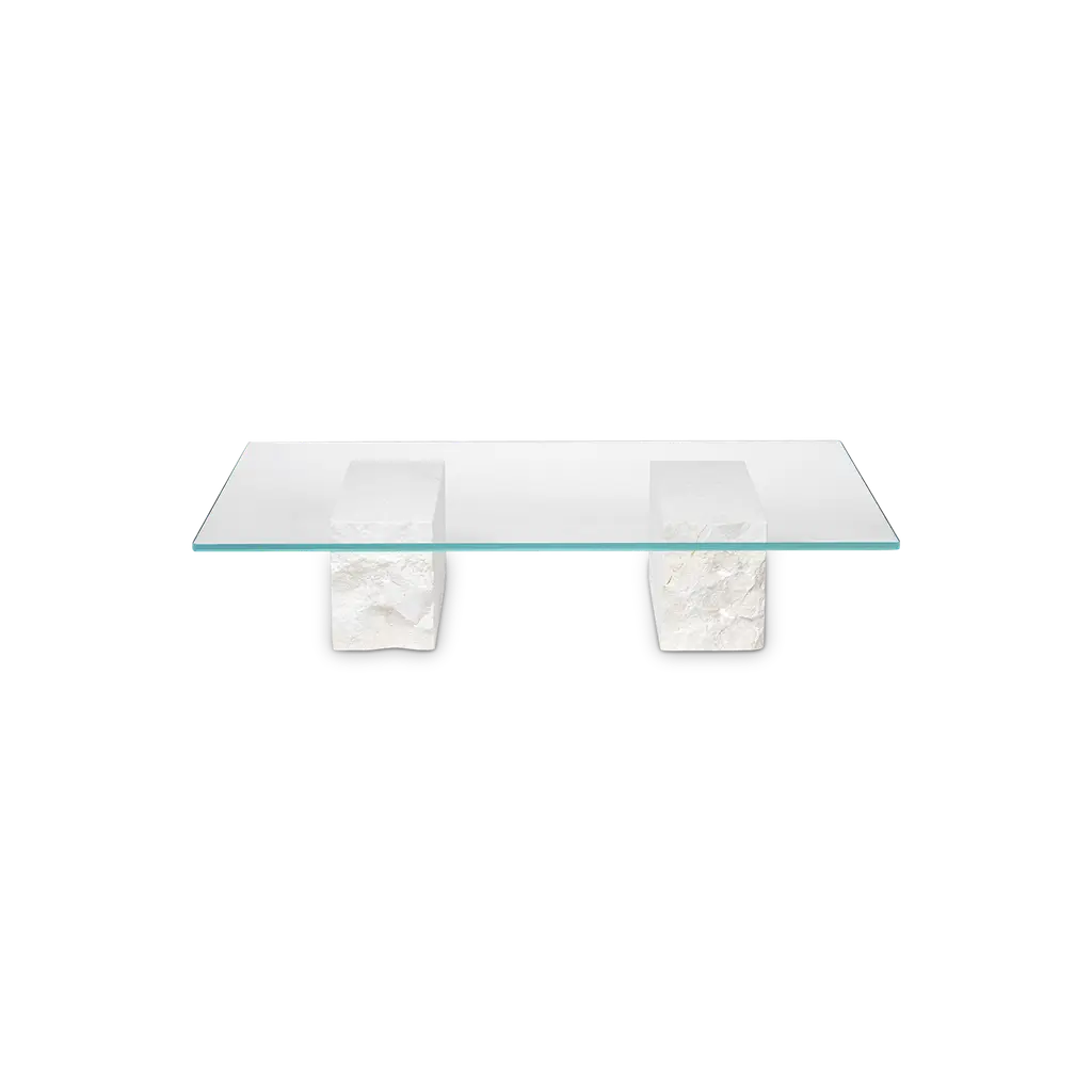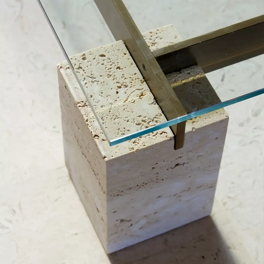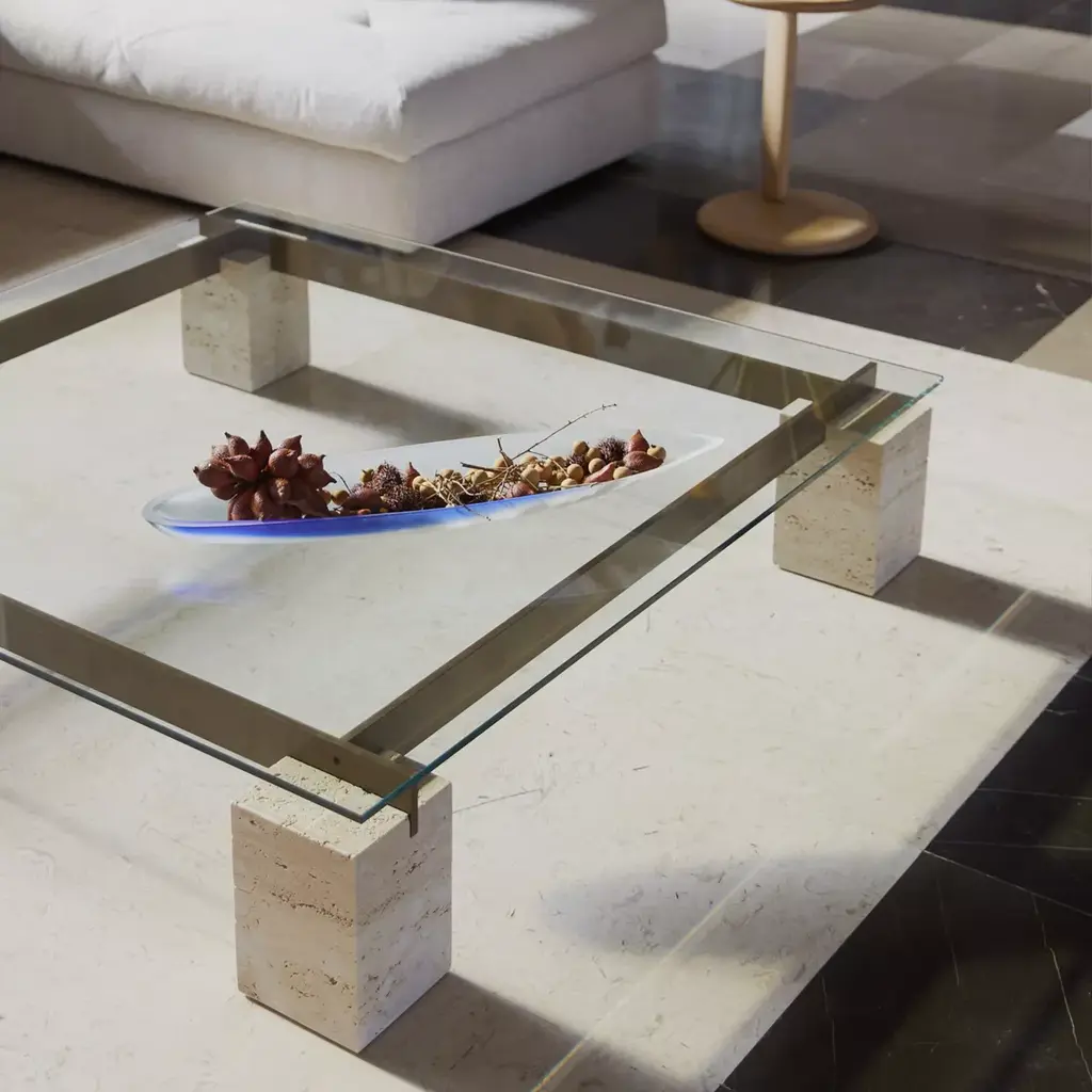 Square cocktail table, structure in 19 mm-thick MDF and oak or walnut veneer. Top tray in 12 mm-thick clear tempered glass, metal crossbars with epoxy lacquer finish. Bottom tray in 10 mm-thick glass. 17x17 cm base in classic concrete-like resin, concrete 350, white Carrare marble, Travertin or lacquer. Available patinas: concrete, col. dark or light grey, dark or light beige, concrete 350, col. light grey. Lacquer available in all RAL colors, satin finish. Other dimensions also available. Manufactured in Europe