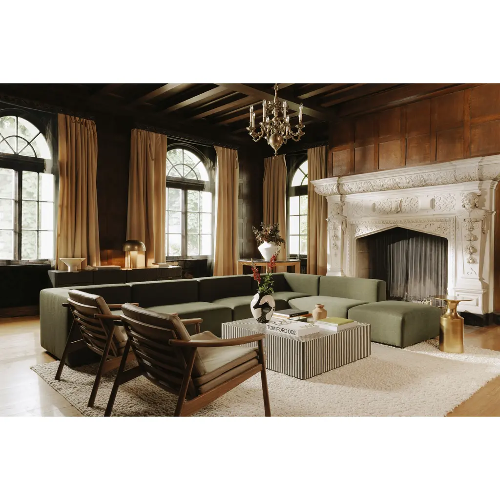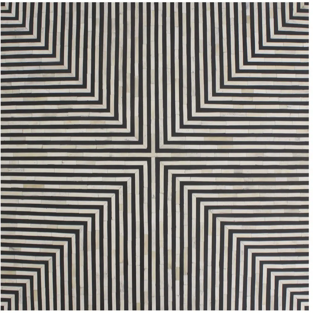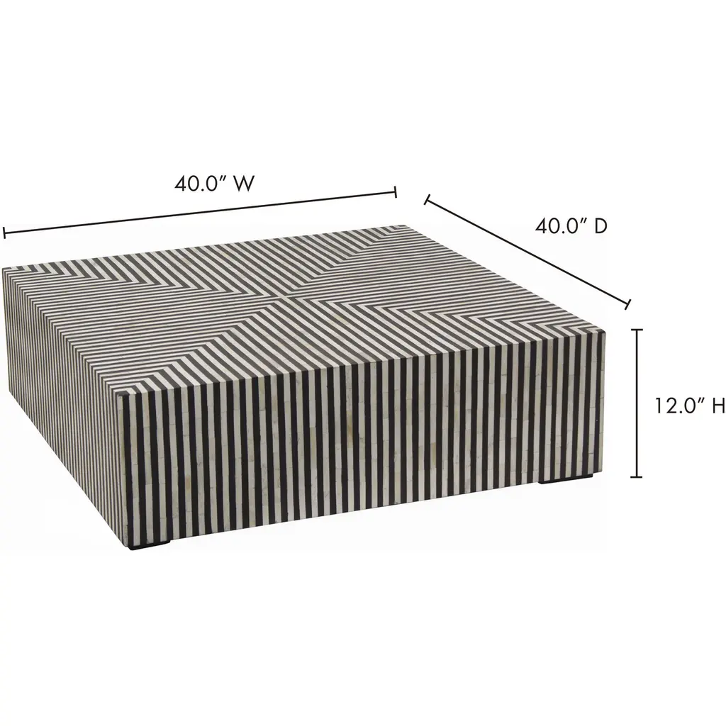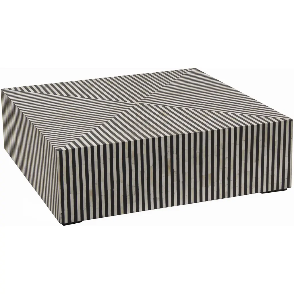 Simplistic and bold, the Ternin coffee table’s hypnotic art deco design is an exercise in contrast. A veneer of ethically sourced white and black camel bone with resin adds a visual statement that contrasts with its simple construction and square shape. The Terning series features a coffee table and a side table to better suit living spaces of all sizes and shapes.
