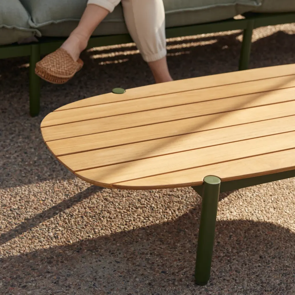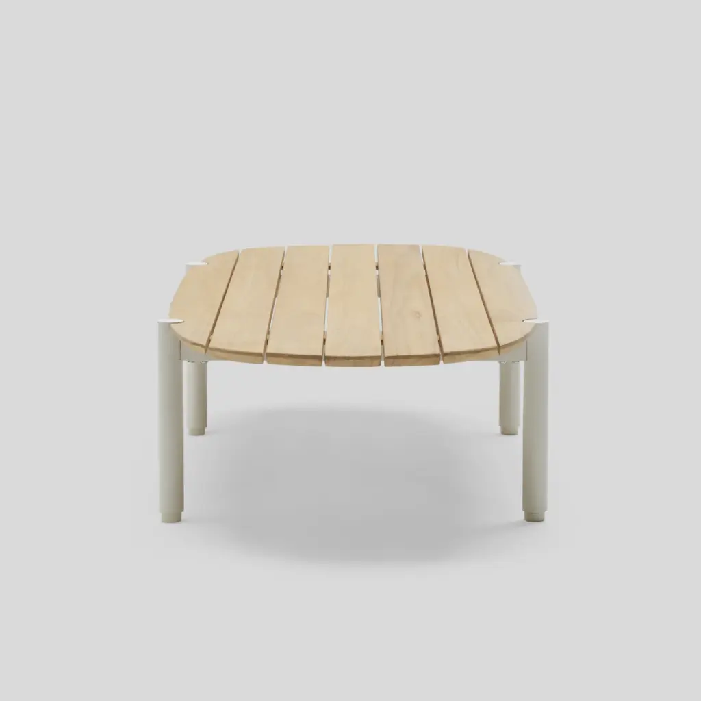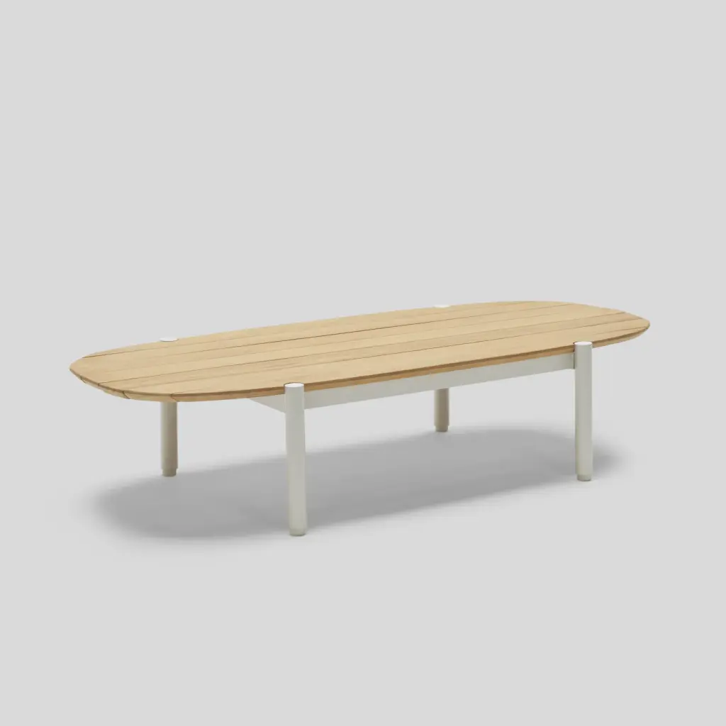 Long and low-profile, the Terra Coffee Table offers plenty of surface area for drinks, bites and the like. Features handcrafted solid teak slats atop sturdy powder-coated tubular aluminum legs. Part of the Terra lounge collection, this outdoor coffee table sits comfortably in front of a sofa, sectional or several chairs.
