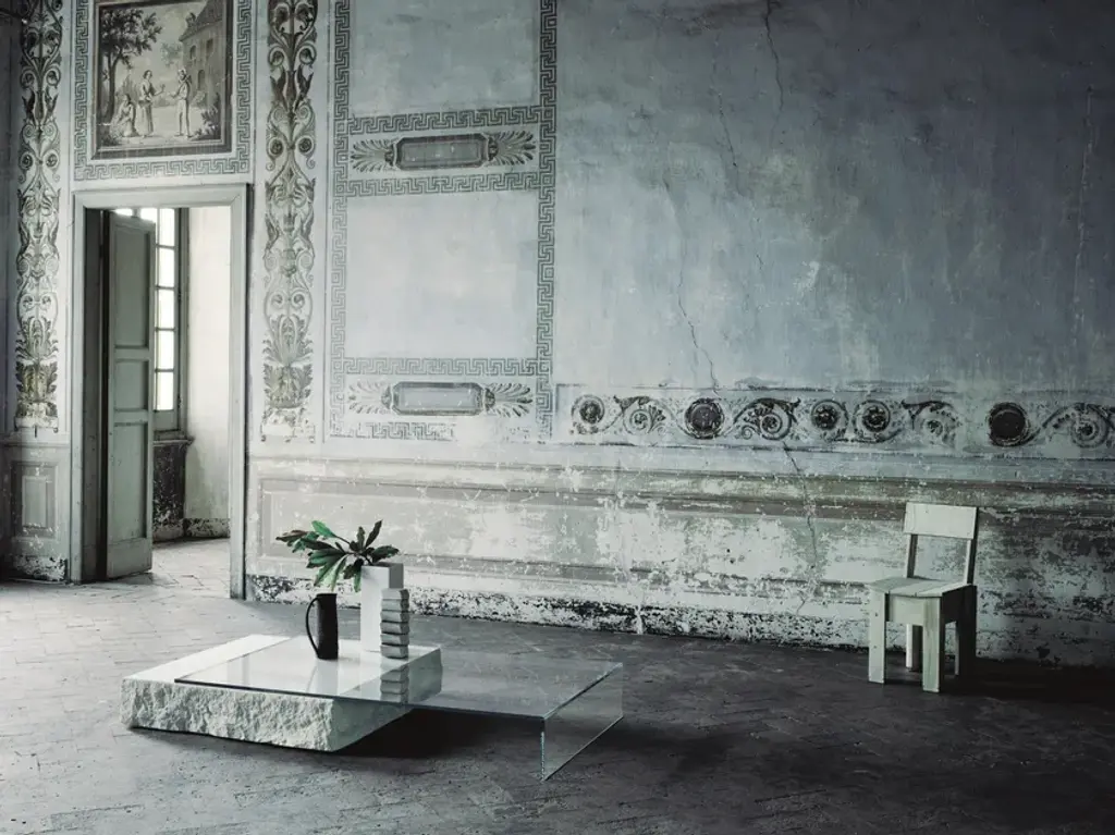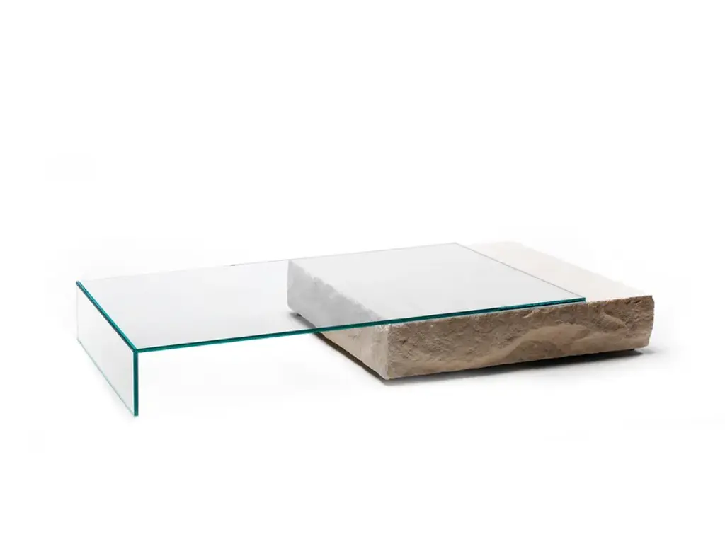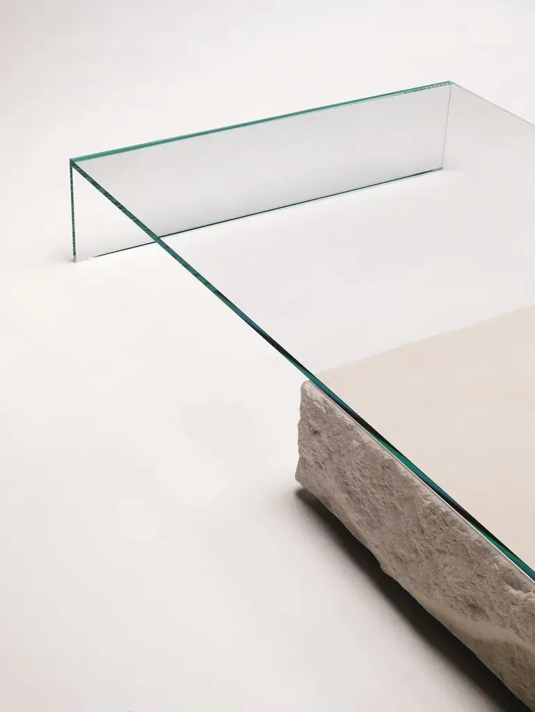 Low table composed of a parallelepiped Limestone stone with a monolithic appearance and an element in tempered 15 mm thick glued 45° transparent extralight glass that rests on it. The stone parallelepiped has the sides in a splitface finish, whereas the top is flamed.The materiality, the gravity and the solidity of the stone juxtapose the lightness, the purity and the ethereality of the glass.