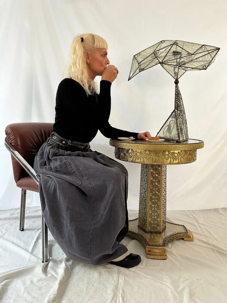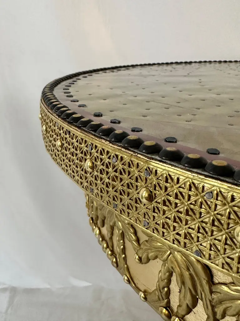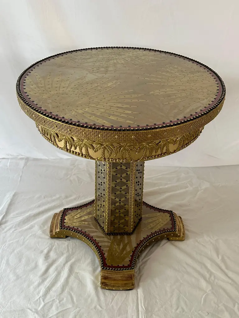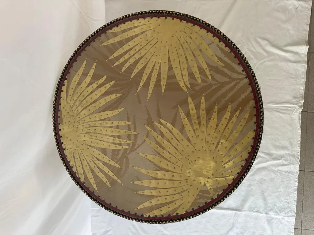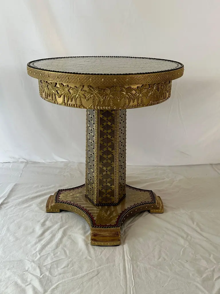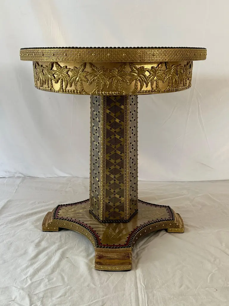 Terrific Palmeto Coffee Table by Valentina GiovandoDimensions: D 60 x H 65 cm.Materials: Wood, Brass, Fabric, Fiberglass. Valentina Giovando, Lives and works in Sarzana, in Liguria, and for over 20 years she dedicated herself to the production of a new style. Her style is personal and full of splendour that she declines in the interior decoration through a range of high-craft artistic products. All these products are completely hand-made. Everything contributes to create unique and original pieces that mix ancient and modern, primitive and industrial, poor and precious materials, in a fascinating mix, by the capable Valentinaʼ and her artisanal team hands.