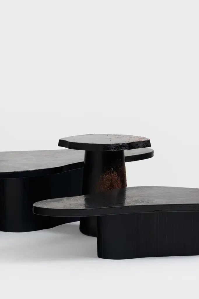 Each coffee table is part of ROU Materiaal’s Tessella Collection and can be composed in a mosaic fashion together with other sculpture tables of different sizes. Stratifications of materials given and removed several times continue to be ROU Materiaal’s field of research. The result is a surface mimicking the feeling of stone, thus creating unexpected material depths.The sculptural tables and wooden sculptures originate from the search for wood from centuries-old Italian trees that were felled due to disease or standing death. The wood is treated in a way that combines techniques that highlight the veins or natural imperfections with others that give a more contemporary texture, such as fire, sands, gilding, and resins.ROU Materiaal works in close collaboration with highly skilled local artisans who bring decades—if not generations—of tradition and expertise. The carpenter, whose family workshop has been active for generations, also specializes in the restoration of antique furniture and historic architectural woodwork. The blacksmith is both artisan and artist, crafting the bases and pedestals of ROU Materiaal’s works by hand in his countryside workshop near Ravenna, using time-honored traditional techniques that he also applies to his own artistic creations.Since the foundation of ROU Materiaal, Marzia and Monica have developed a unique surface treatment technique that is constantly evolving. Rooted in both traditional restoration practices and the art of Chinese lacquer, this method is reinterpreted with a contemporary sensibility. Layers of acrylics and resins are applied and then partially removed after drying, sometimes combined with other materials such as sand, cement, mortar, stucco, mosaic tesserae, gold leaf, lapis lazuli powder, straw, and more. Fire is also used as a material and gesture within the process.The method of layering and subtracting follows an intuitive rhythm, ending when Marzia and Monica feel that a specific version, texture, or balance has been achieved. Much of the final outcome depends on their emotional state, instincts, and the element of surprise introduced by chemical reactions. These reactions are often deliberately provoked through "wrong" or unexpected combinations, in order to obtain unique, imperfect, and unrepeatable effects.Though the Tessella Collection is conceived as an open edition, each piece is rendered one-of-a-kind due to the chromatic nuances and the three-dimensional depth achieved through this distinctive, expressive process.Open edition.Standard production time is approximately 8–9 weeks once current stock is sold out.One piece available for immediate delivery. For projects involving multiple units, production time may vary.