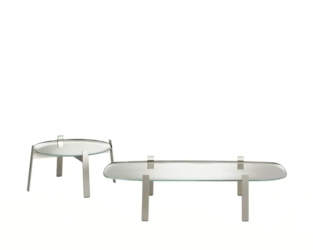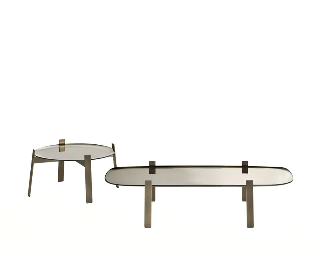 THE 5 O’CLOCK LIE is a round low coffee table.The 5 O’Clock Lie is a collection of low tables in 8 mm bronze or extra-clear glass, skillfully curved along the entire perimeter using innovative and complex processing techniques, then manually silvered to perfection.The result is mirrored tops with a raised edge that reflects images in unexpected, distorted ways, while the central surface remains perfectly flat, offering a true reflection.The slightly angled legs and supporting structure are made of steel with a nickel finish (for the extra-clear mirrored top) or bronze finish (for the bronze mirrored top), both achieved through galvanic treatment.Available in two sizes with different heights.