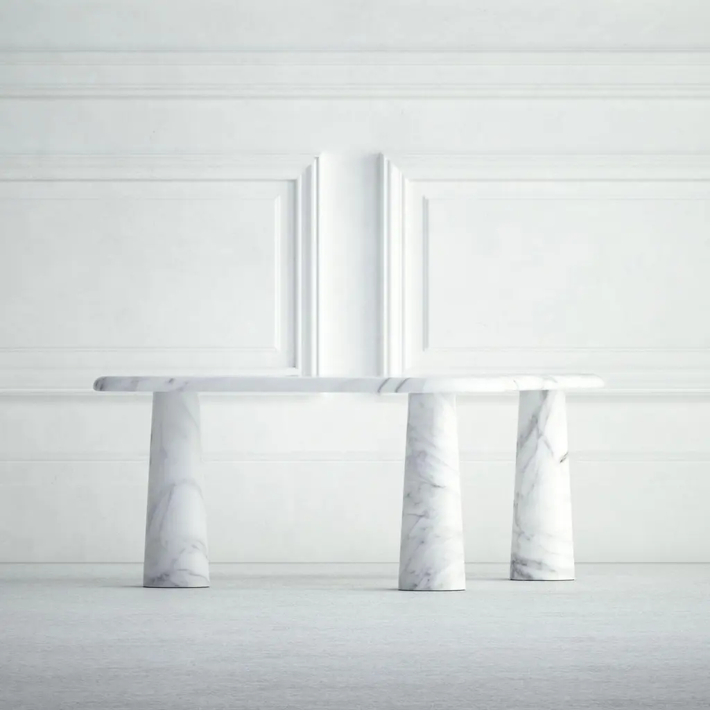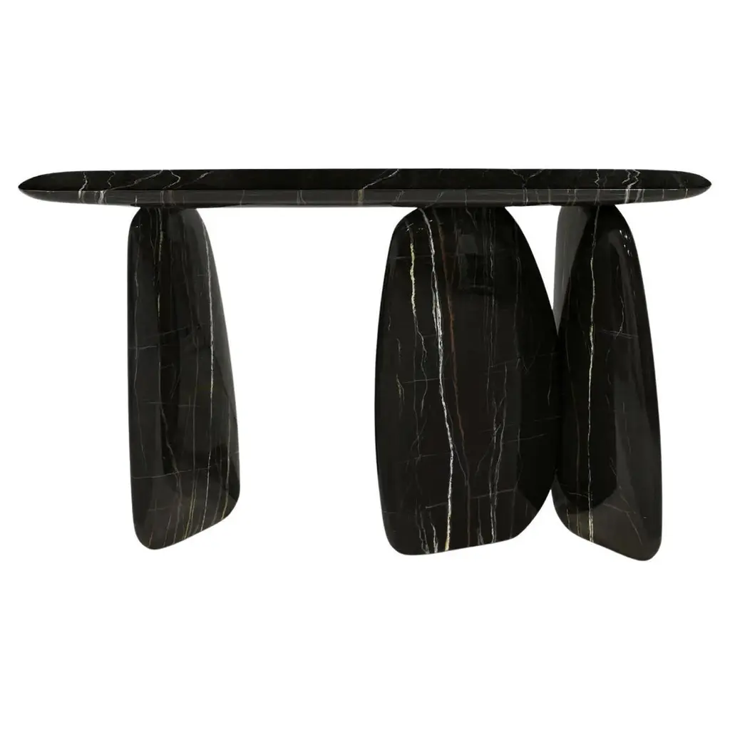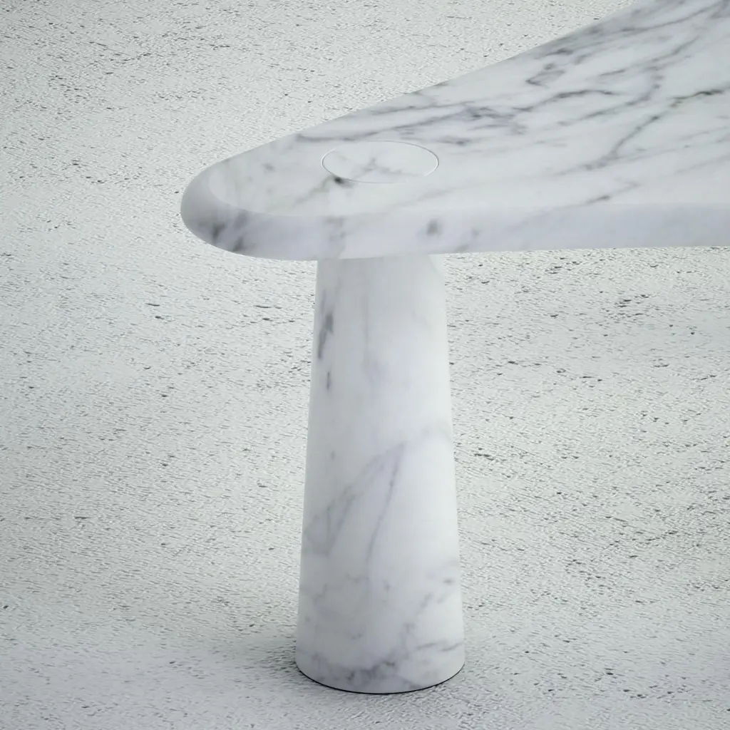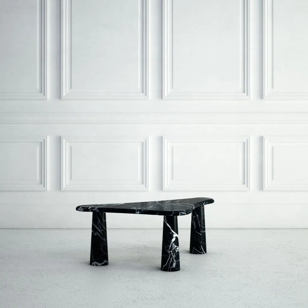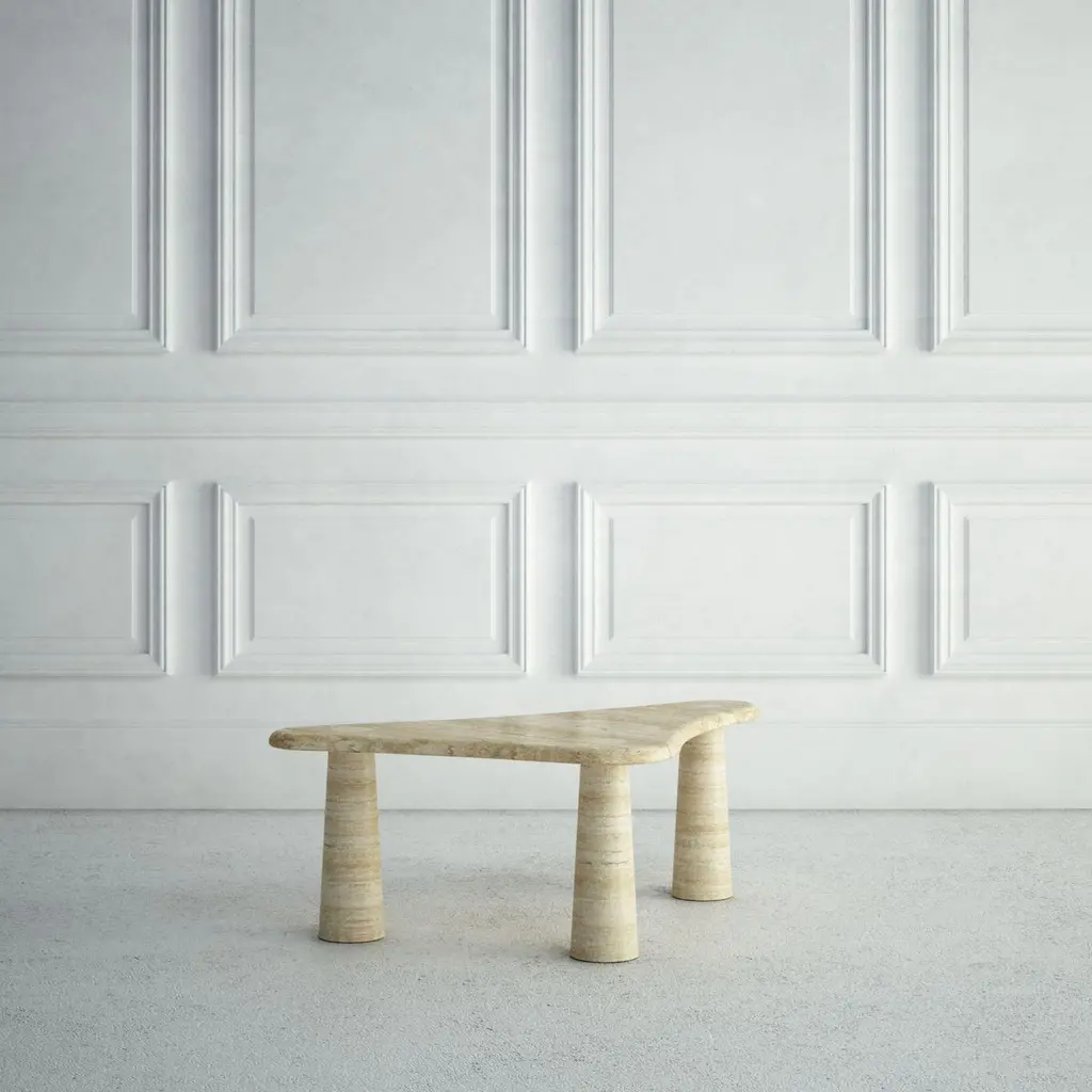 The Chloe is a playful, smaller coffee table, full of curves. Each of the 3 legs are rounded and taper up into a conical shape. The table top's triangular shape continues the theme of three. With three rounded corners, and curving sides and edging detail, its shape is soft, but its material is strong. The table is available in our cream travertine, white marble or black marble - all durable stones that will hold up well with time. This table would work wonderfully well as a main coffee table or a generous side table, in a Great Room, Living Room, and even Primary Bedroom.