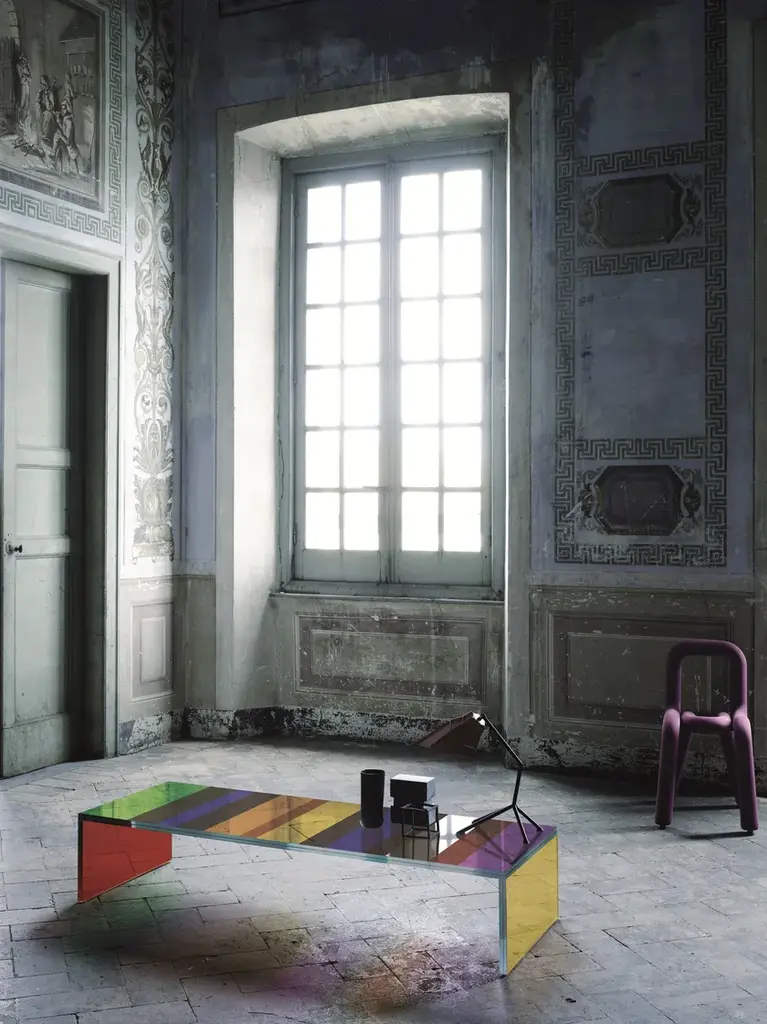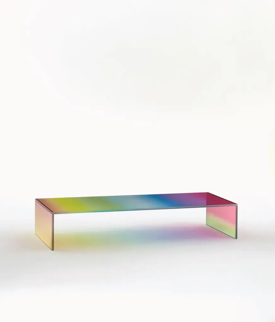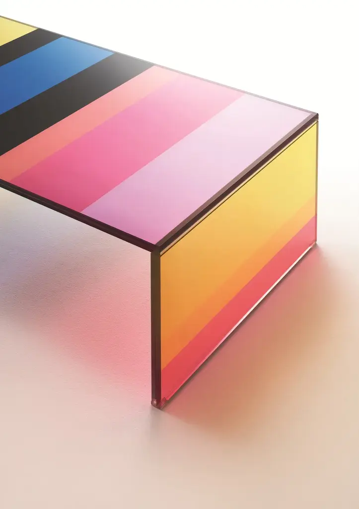 The Dark Side of the Moon is a low table with bridge shape in laminated transparent extralight glass with a sophisticated and innovative technical process, thanks to which the top and sides are characterized by a multi coloured finish. Available in two versions: one is striped, and the other one with faded colours.Attention: the presence of small irregularities is feature and guarantee of the artistic workmanship, not seria