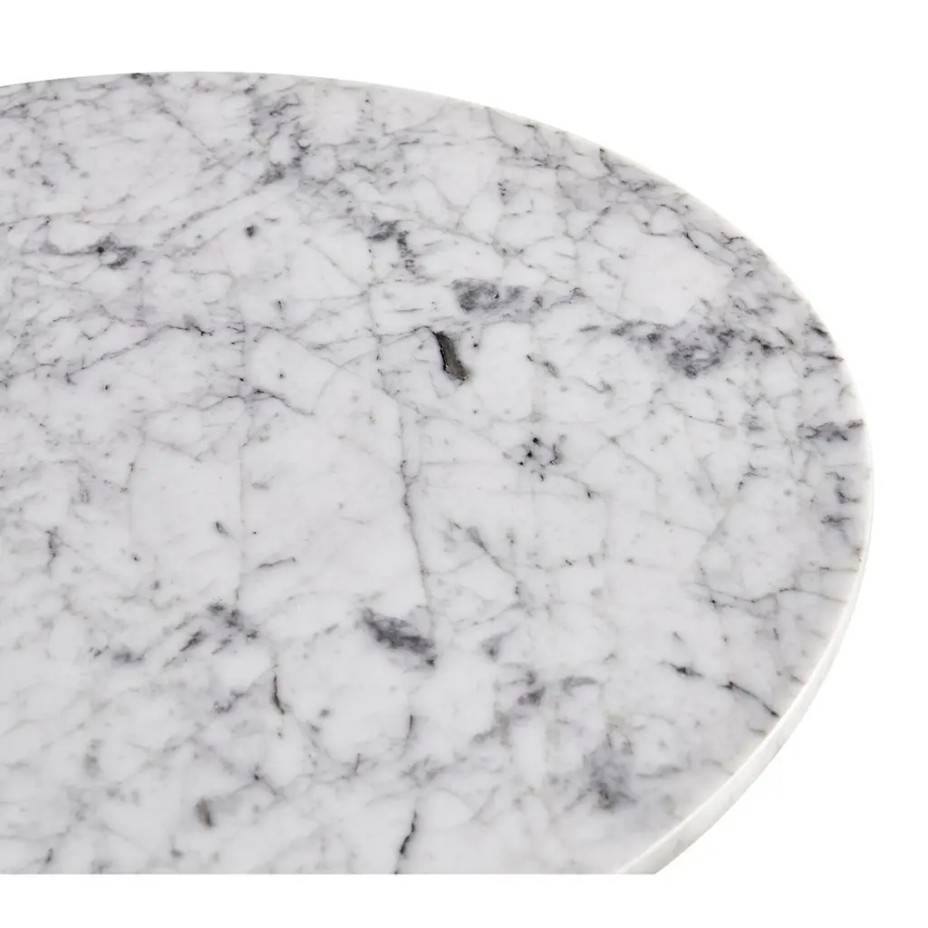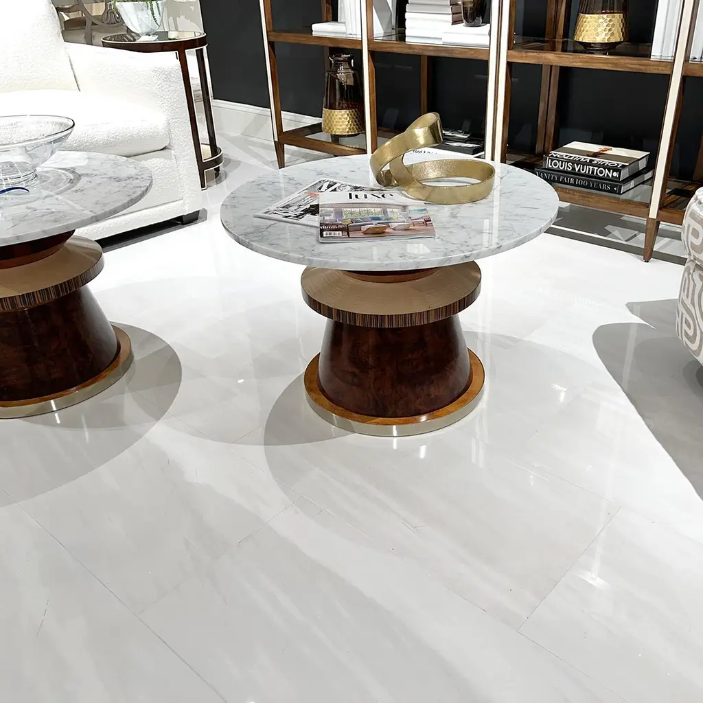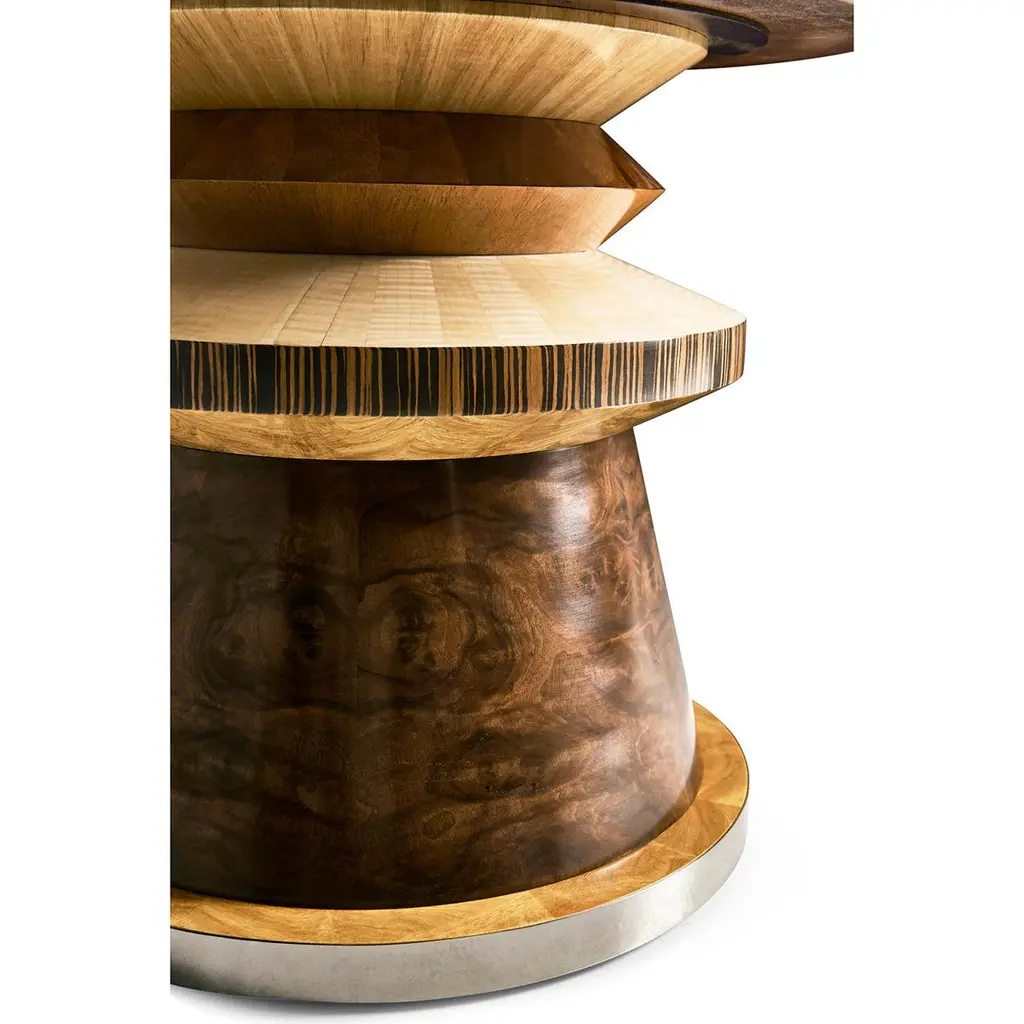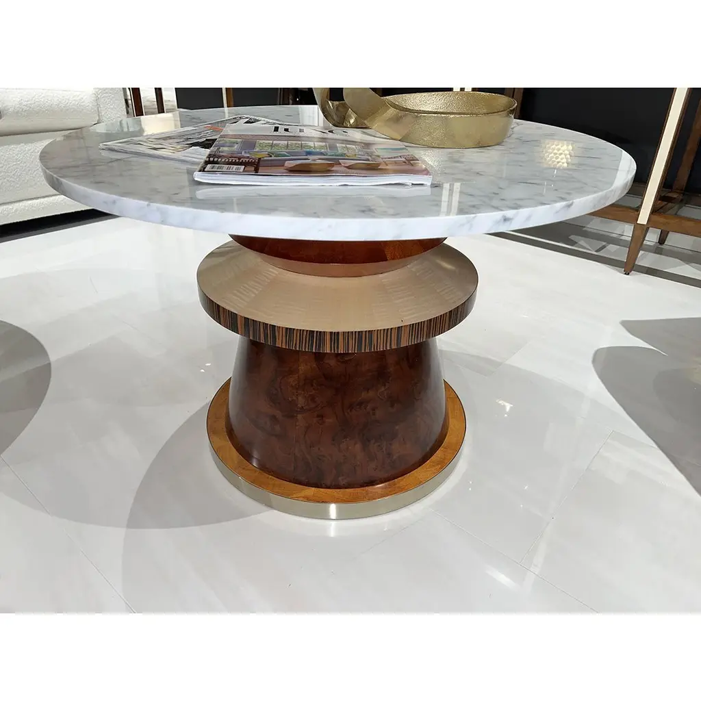 Crafted from an array of layered veneers - walnut burl, cerajeira, ebony, maple, chestnut, and eucalyptus—this table boasts a rich and captivating appearance. The various finishes highlight the intricate patterns of the veneers, creating a visual masterpiece. The round Carrera marble top and metal base are the finishing touches to this imaginative table.Dimensions: 30" W x 30" D x 20" H