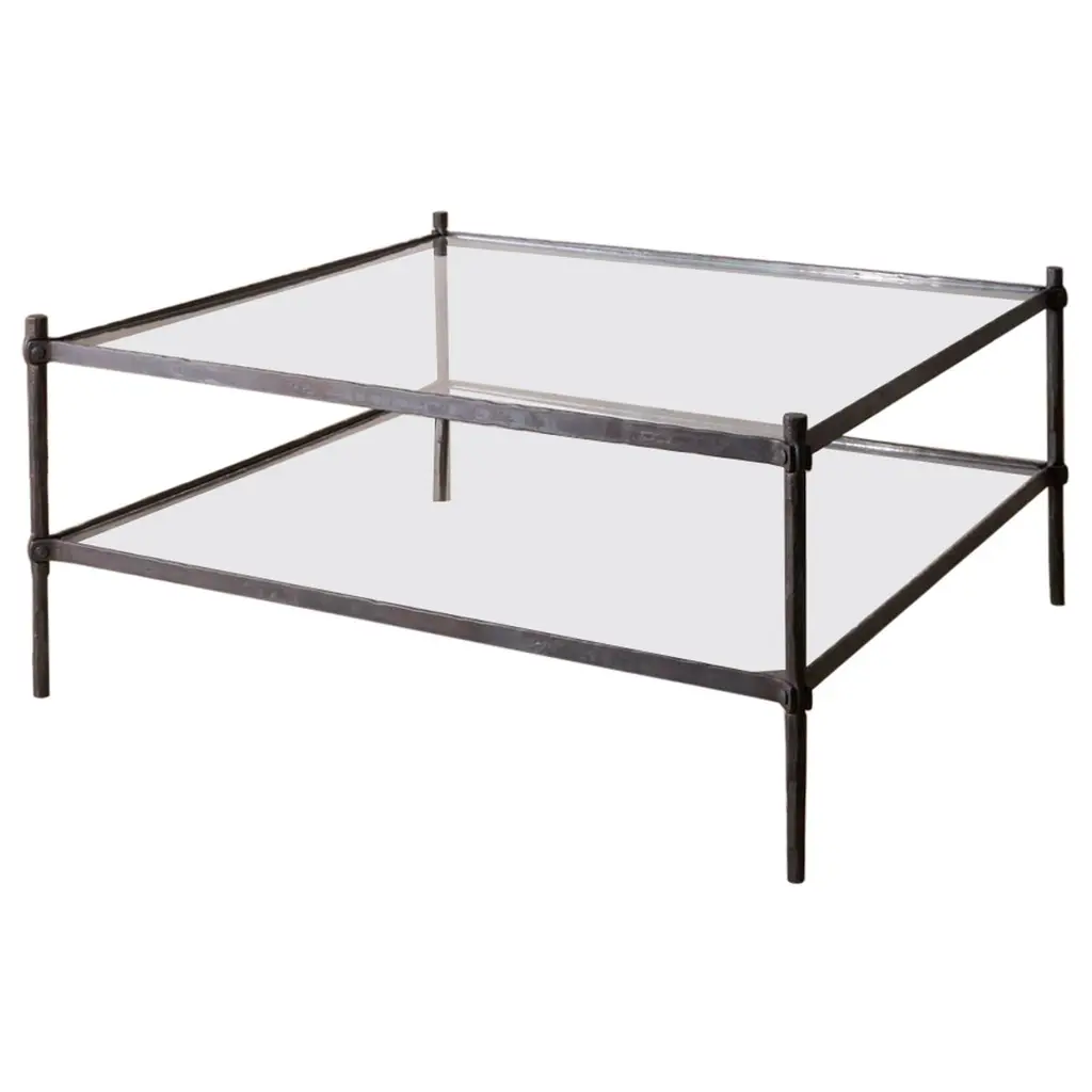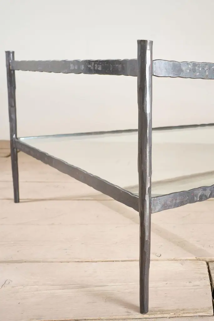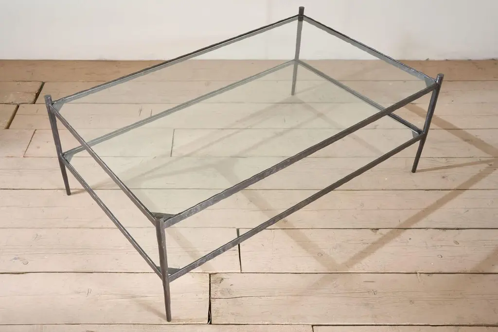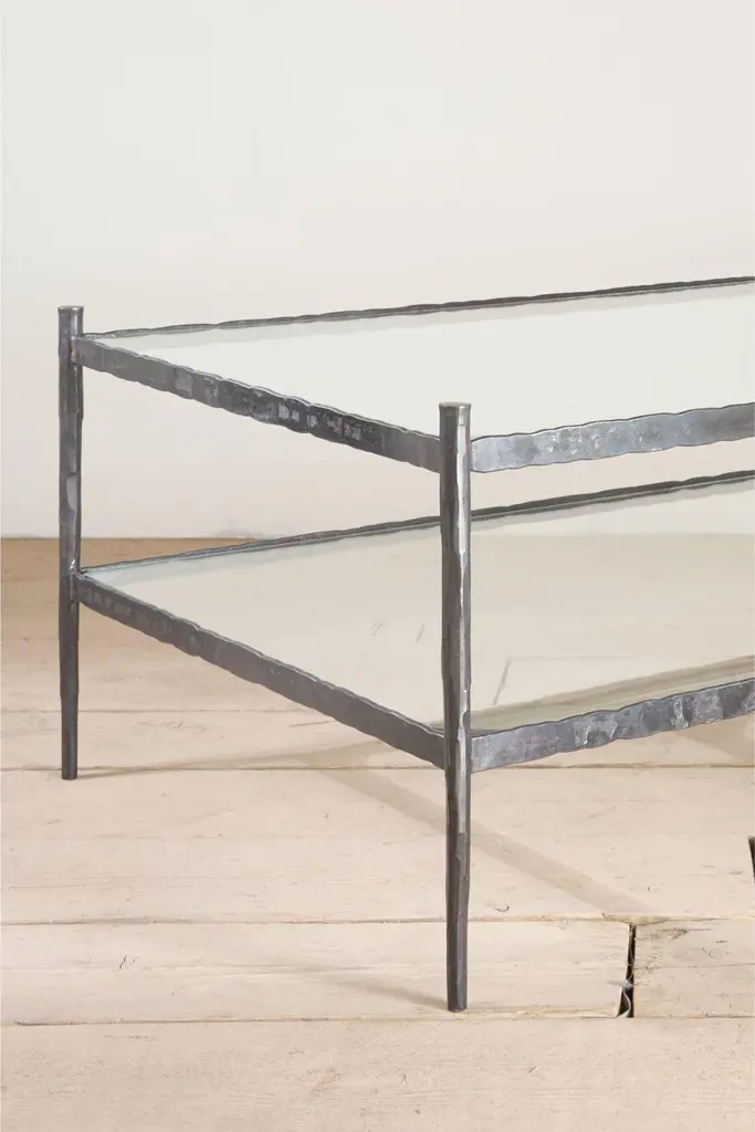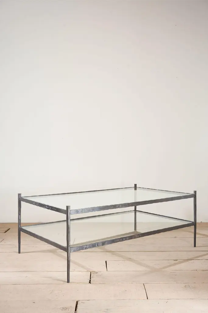 This is our 'Mjolnir' Coffee table. The hammer of Thor. An homage to the hammering techniques used in the manufacturing process. Made from forged steel and crafted right here in Yorkshire by Sam our incredible blacksmith.The way Sam forges the steel on this piece generates a natural patina and colour that make this table extremely impressive. The design was inspired by the two tiered mid century tables we have found in Italy over the years but given the full forged treatment. The legs have been beaten and tapered. This differs from our riveted 'Mjolnir' coffee table as this has forged corners for a more minimal look. The glass tiers are 6mm thick with polished edge.Height 49cm to top Height to top of glass 46cm Width 130cm by Depth 80cmCan be made in different sizes. Available in riveted corner design as well.All pieces are made to order, lead time 3-6 weeksPrice quoted includes UK mainland delivery and VAT.