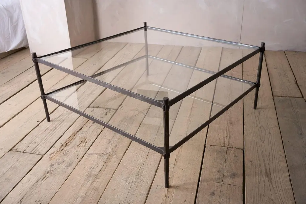This is our 'Mjolnir' Coffee table. The hammer of Thor. An homage to the hammering techniques used in the manufacturing process. Made from forged steel and crafted right here in Yorkshire by Sam our incredible black smith.The way Sam forges the steel on this piece generates a natural patina and colour that make this table extremely impressive. The design was inspired by the two tiered mid century tables we have found in Italy over the years but given the full forged treatment. The corners are riveted and again entirely hand beaten. The glass tiers are 6mm thick with polished edge.Height 49cm to top Height to top of glass 46cm Width 105cm by Depth 105cmCan be made to order in different sizes.Price quoted includes UK mainland delivery and VAT.