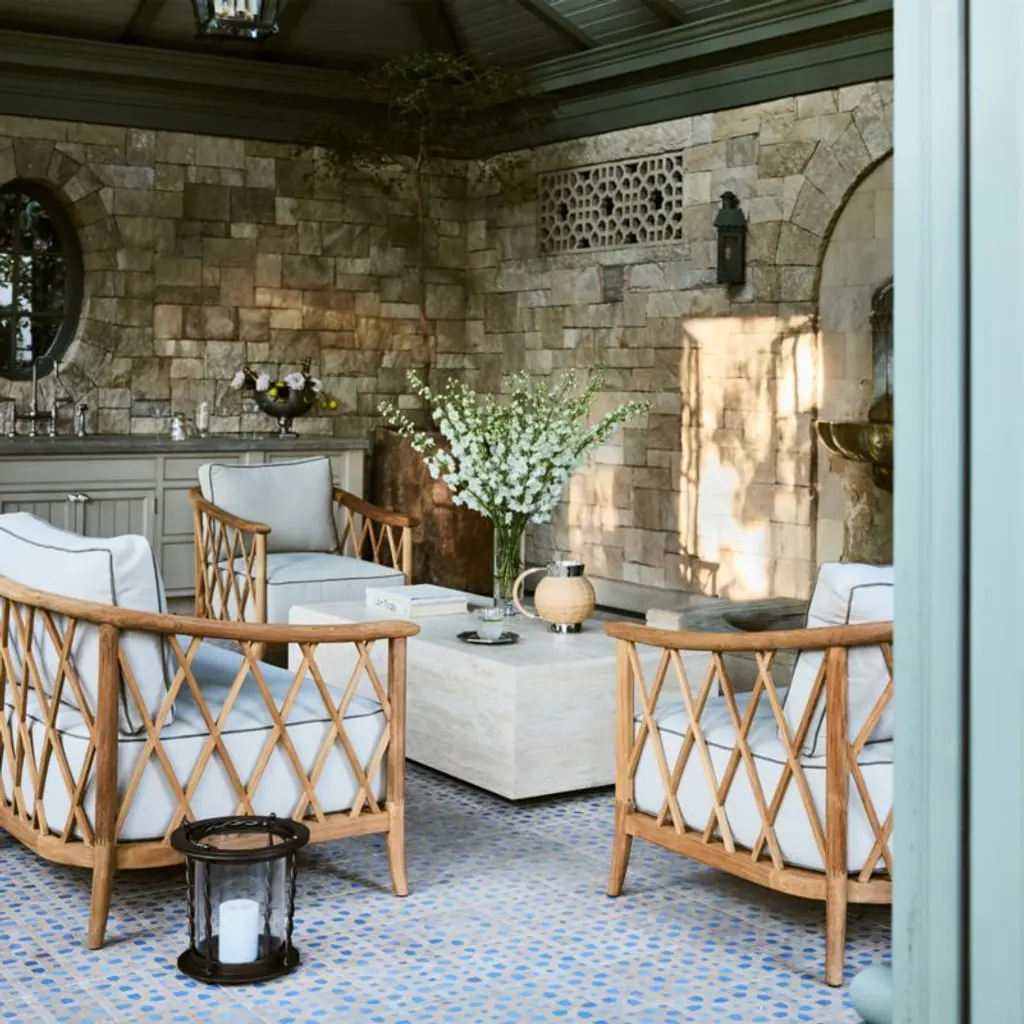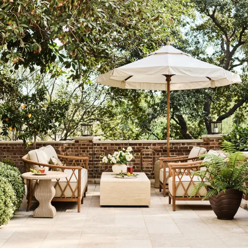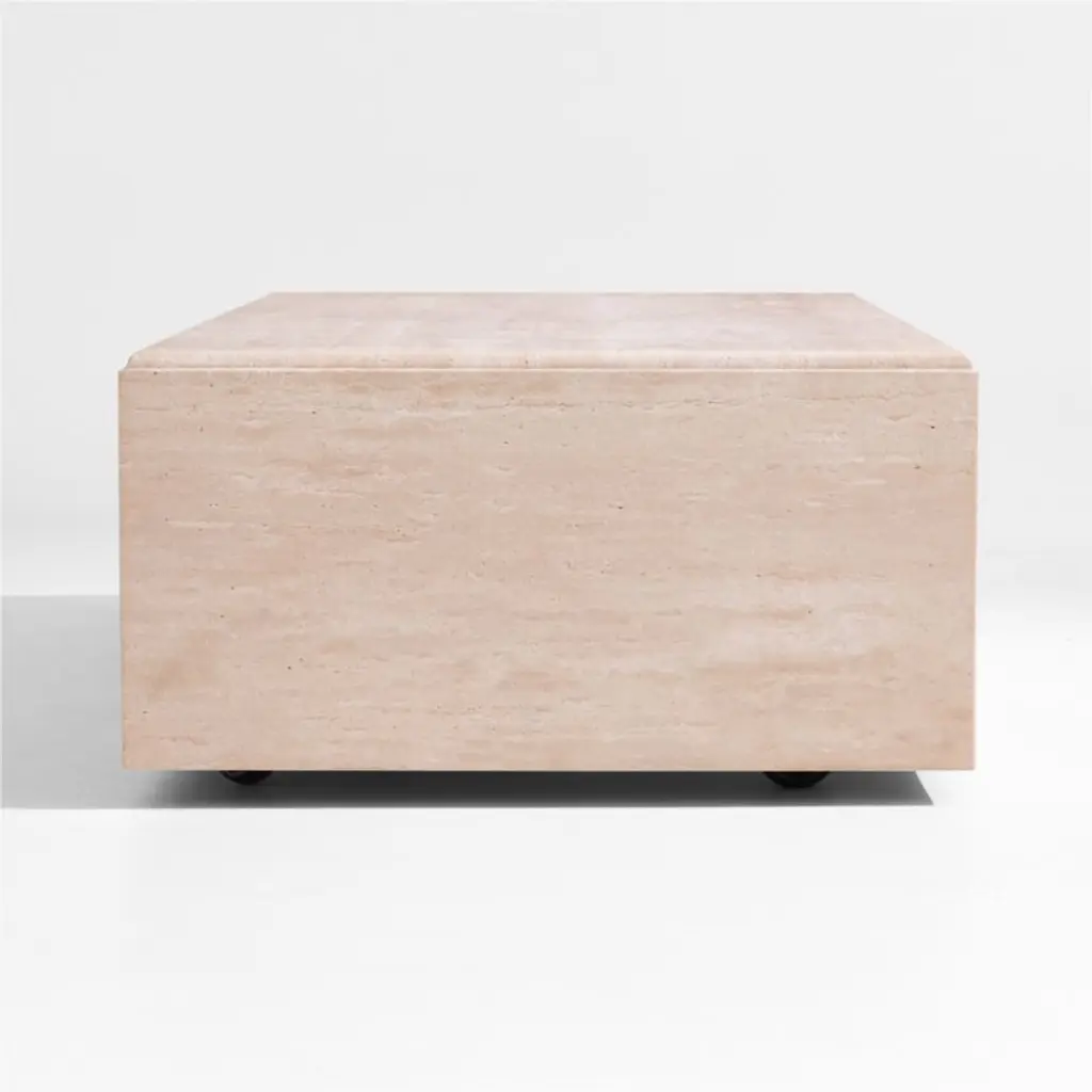 This contemporary coffee table pays homage to the timeless beauty of travertine, a stone long revered for its elegance and durability. The minimalist design devotes its simple rectangular shape to the unique veining and cream and beige coloring of travertine. Honeycomb construction and caster wheels make the table lightweight and easy to configure on your patio or deck.Jake Arnold's first-ever outdoor collection elevates your oasis with his fresh L.A.-meets-London style. Think insider-worthy details, real-life comfort and materials chosen to weather the elements.