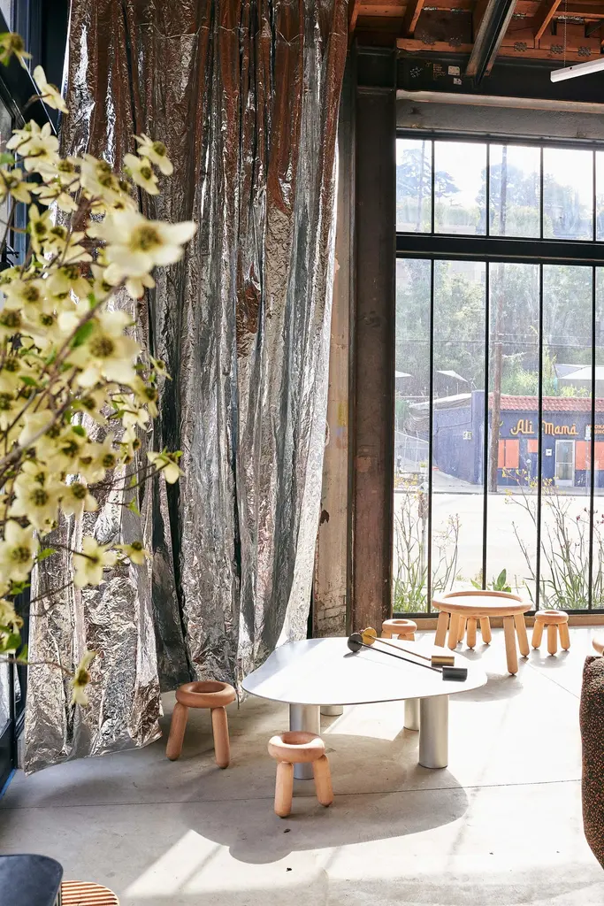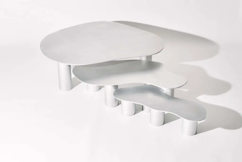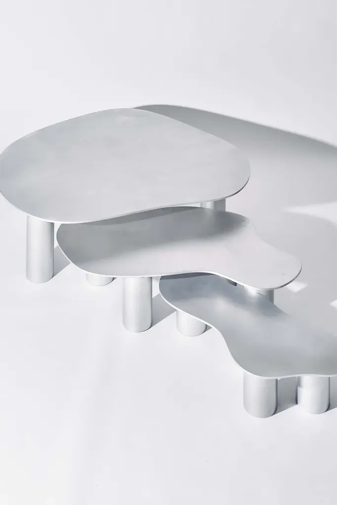 Enamored by the versatility and performance of sheet aluminum on our custom architectural projects, we worked to introduce a new family of aluminum only tables. Nesting their imperfect, puddle-like tops on a sheet of 3/8” thick aluminum, we attach stock 6” diameter aluminum tubes as their legs. Once the laser cutter does its job and our metal workshop prepares the piece, the tables are then passed over into the hands of our metal finishers. Over 4 hours are spent on average, sanding, softening and polishing the aluminum surface. Tops are either waxed or lacquered, per clients preference. We offer the Puddle tables in a leather top finish as well - where 10oz leather hide is cut to fit the top and attached to the aluminum surface.The Puddle tables come in a variety of shapes and are offered in counter height, dining height or three, stackable options for coffee table heights.