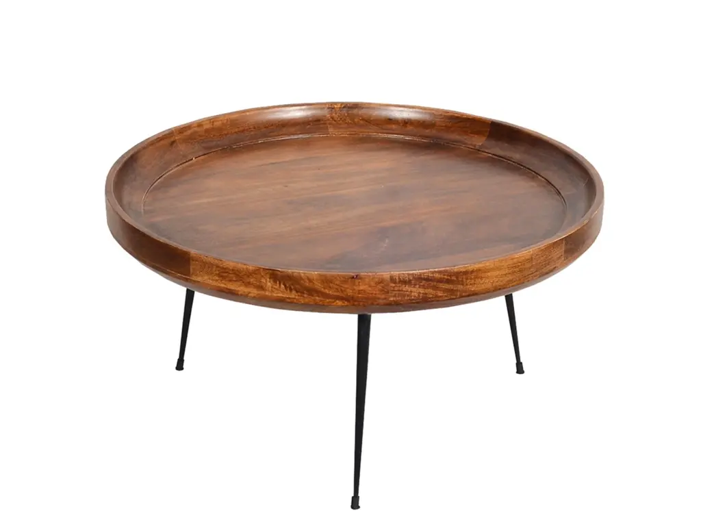 This coffee table is finely constructed from quality mango wood and supported by splayed metal legs. Round in shape, this table features a smooth top with elevated edges that secure objects from falling. Place it in your living room or in garden spaces for instant causally-cool style.