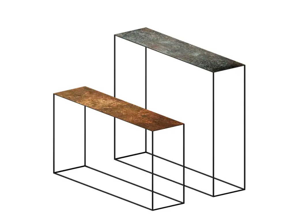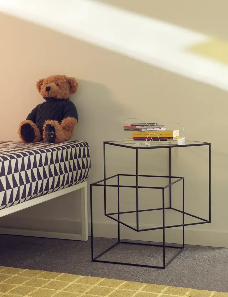 Delicate and striking: for the Thin Black Table, Nendo designed a low geometric structure – created from the L-shaped intersection of two off-axis cubes – that supports an ultralight glass table top.The clever interlocking transparency of the matte anthracite metal structure of the Thin Black Table is reminiscent of an Escher labyrinth – a decidedly eye-catching piece that gives a peculiar allure to any setting.Structure: square metal barStructure finish - matt varnished: 48 anthraciteTop: square with extralight glassFeet: black rubber tipsNotesMaximum load on top centre 50 kgMaximum bearable weight 2,8 kg on its protruding corners