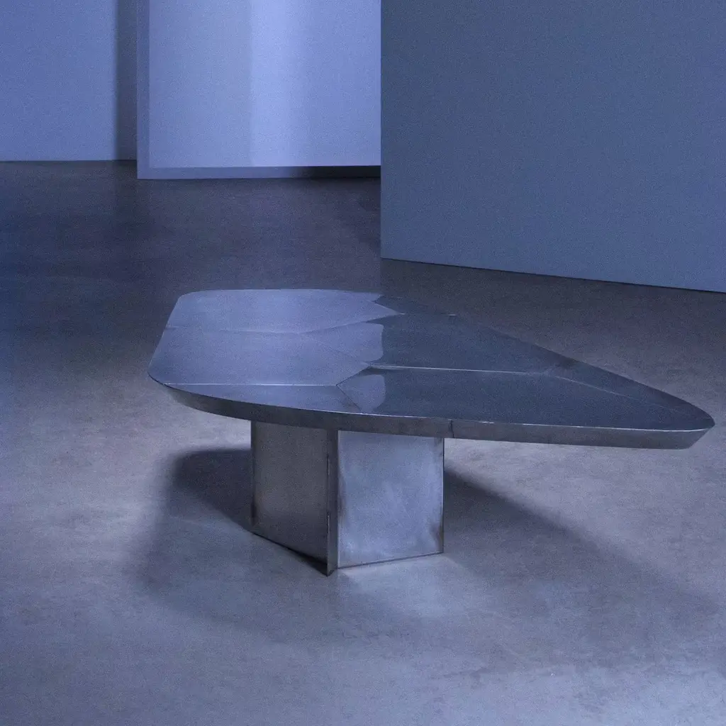 This unique and sophisticated coffee table is part of the Thinking Klein collection, inspired by the work of French artist Yves Klein. It was crafted entirely of steel with a multi-faceted base that supports a strikingly textured top with an irregular silhouette. The surface of the piece is finished by hand at the end of the production process, making each table a one-of-a-kind. It is possible to craft this table also in the exclusive material Frisoli Yves, made of a mix of carbon fiber, glass fiber, and International Blue Klein pantone color fora stunningly colorful effect. Ask the Concierge.