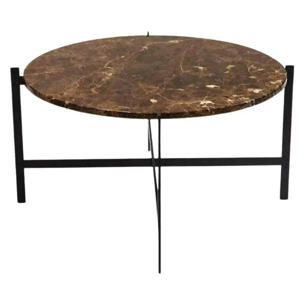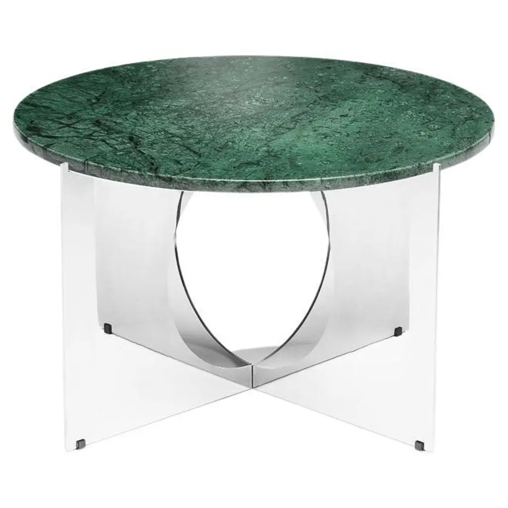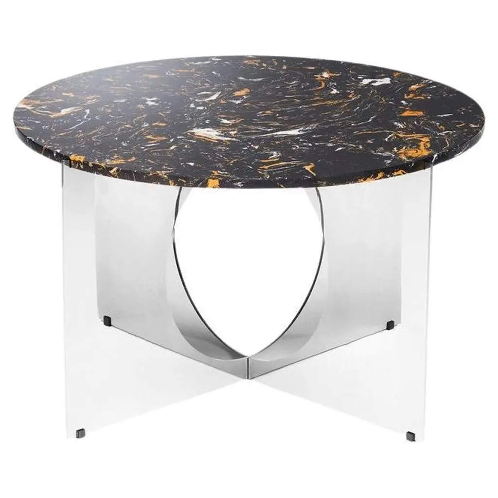 “This Is Art” table is a very sculptural coffee or side table. The shape of the base is like an optical illusion with an alluring effect. The table is available with marble or composite top.MaterialMarble Top : Selection of natural Marble Stones: Gray, Green, Dark BrownTop Composite : Selection of composite stones: Black, Bordeaux, Cream.Metal FinishesBase in coated stainless steel Chrome or Gold finishDimensionsTop : Ø 23Base : H 14” x W 23” 1/2Feet : Rubber.