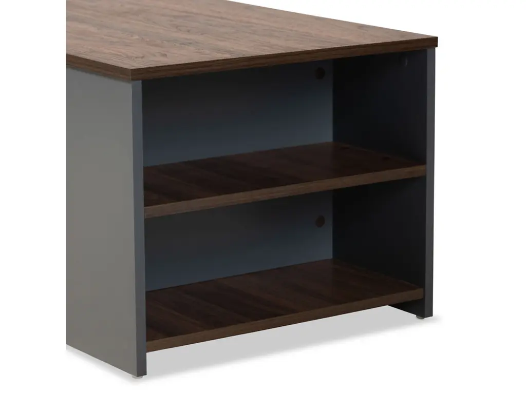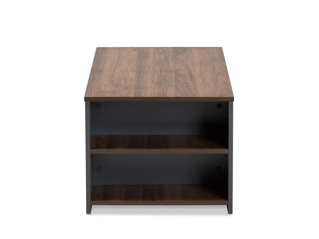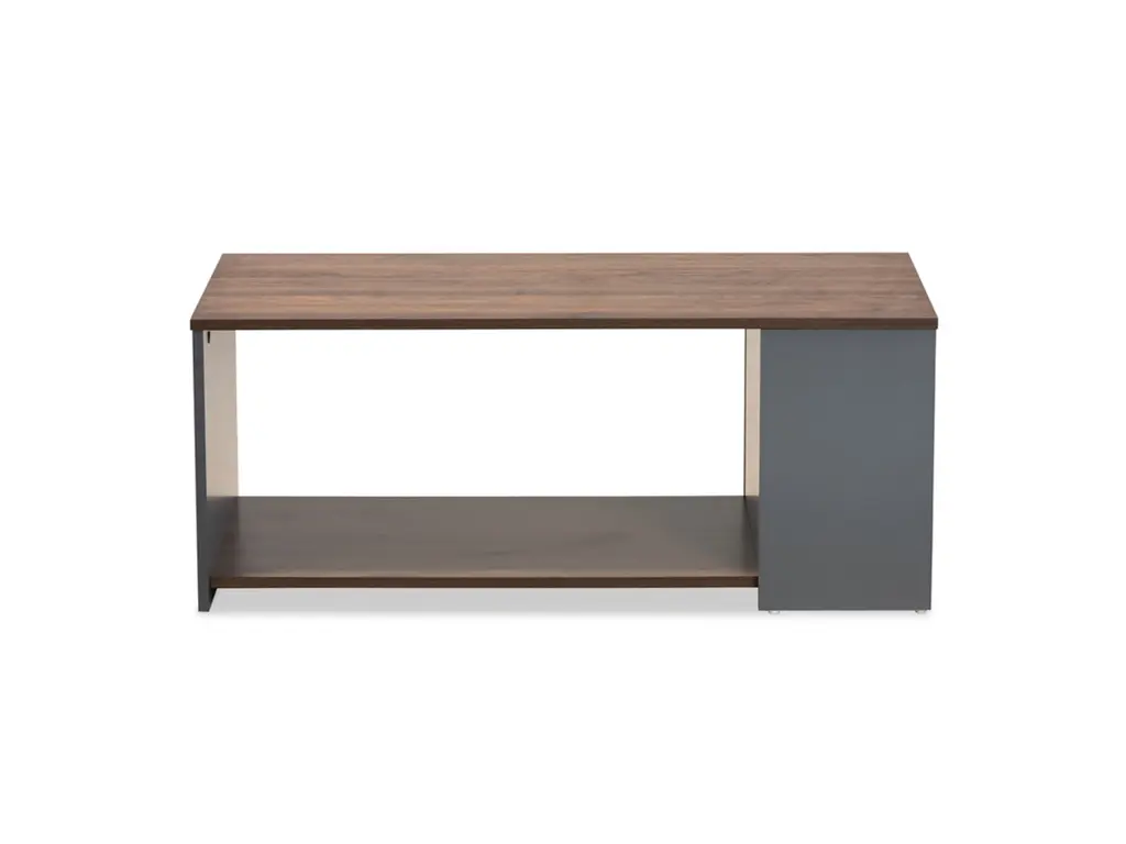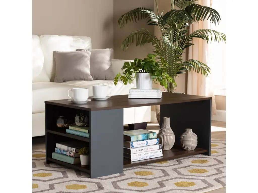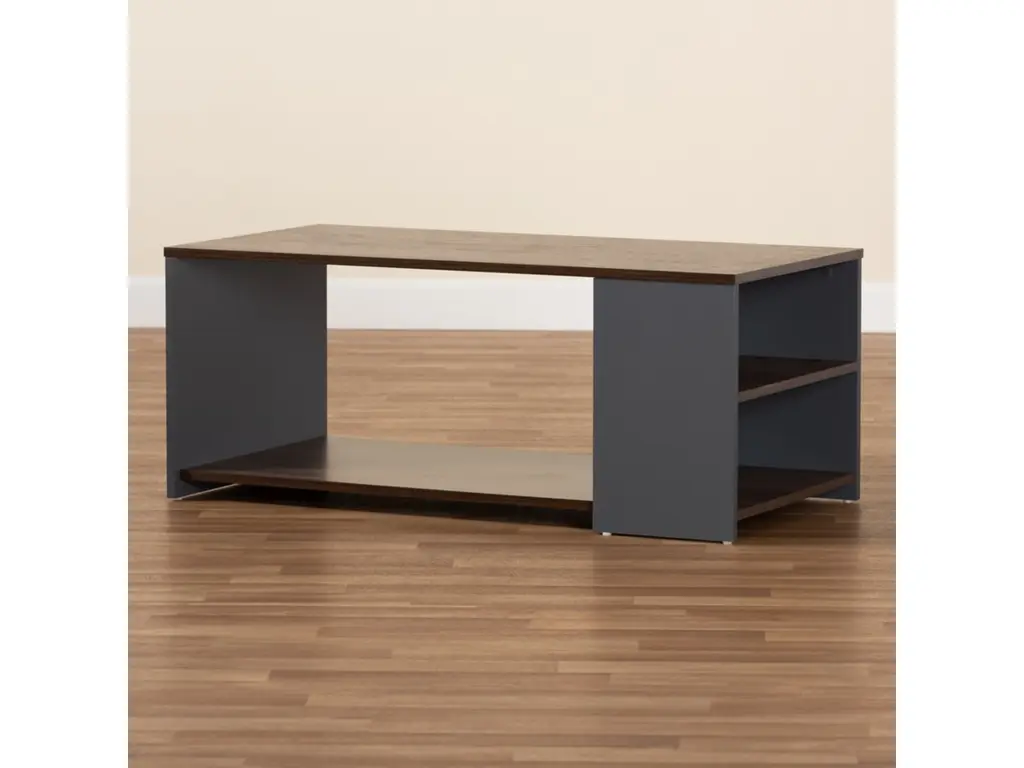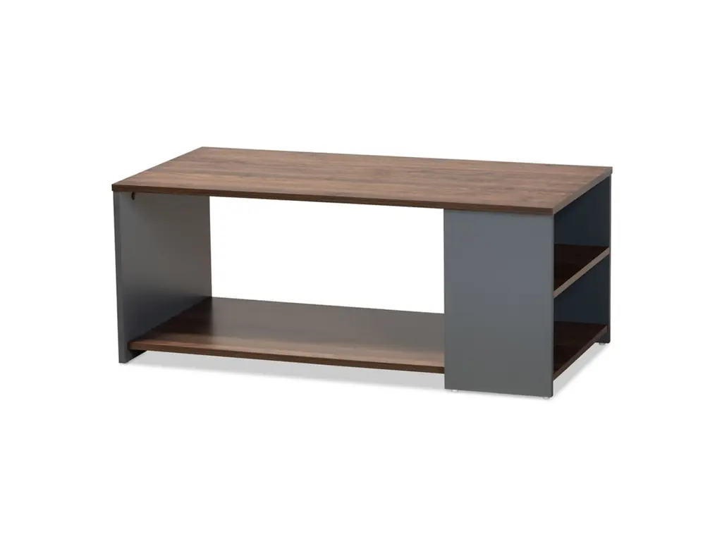 Create a sleek and modern ambiance in your living room with the versatile Thornton coffee table. Made in Malaysia, the Thornton is comprised of a sturdy wood frame showcasing a two-tone finish of walnut brown and grey for a cool, contemporary look. One lower shelf and two sides shelves provide convenient storage space. Requiring assembly, the rectangular tabletop provides ample surface area for decorations, meals, and general use. A visually striking piece with fantastic utility, the Thornton coffee table enhances any home.