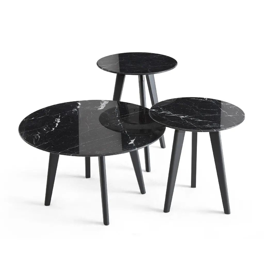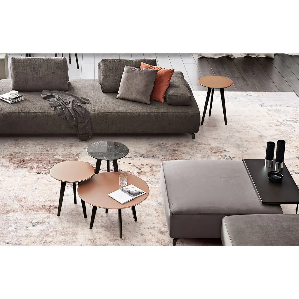 Introducing the Three-Legged Round Coffee Table from Dema Edgar. Crafted with a metal frame in a rich dark brown finish, this table exudes luxury and sophistication. Choose from a variety of leg and top options, including marble, leather-covered wood, or birch veneer, to create a truly exclusive piece.