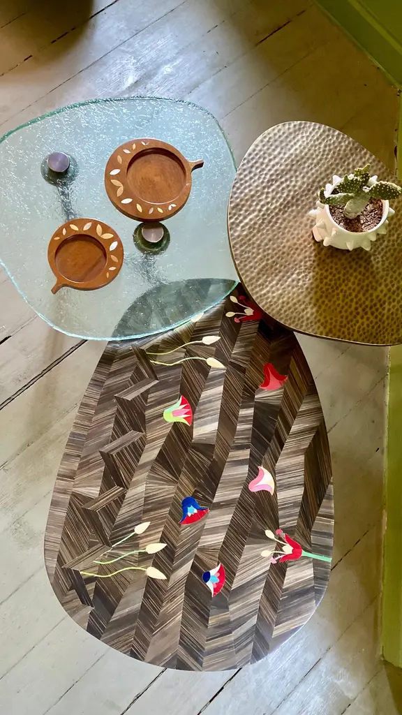 Three-Tiered coffee table with hand-laid bronze straw, brass & custom-made glass.This timeless design unites beauty, class and pragmatism. Three tiered pedals resemble that of a flower each made from a different material that complements each other. Our Signature Shewekar-Straw, hammered brass and artisan glass pedals rest atop exquisite custom-made brass bamboo legs. The only thing that’s more beautiful that this table is two of them with different colored straws pedals playing off each other like an iridescent flower bouquet. The brass top is hammered, the glass is blown and the Straw top merges different shades of bronze for an even more sophisticated look. This table pairs beautifully with its sister pink table. Can also be used as a side table.